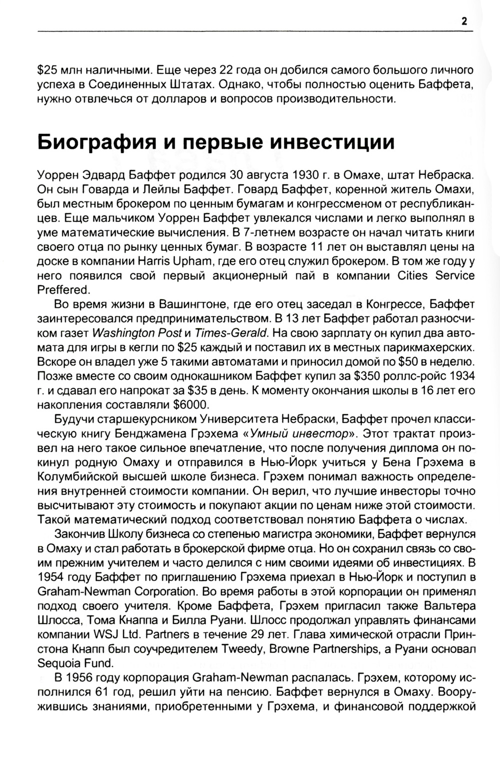 Уоррен Баффет - очень обаятельный человек. Он стал главным авторитетом по инвестициям не только в нашей стране, его рекорд производительности за последние четыре десятилетия не имеет аналогов. Сейчас-личный чистый доход Баффета превышает $10 млрд - это прямой результат его эффективных инвестиций. При этом по стилю поведения и темпераменту он не похож на типичного миллиардера. Главный офис возглавляемой им компании Berkshire Hathaway расположен не в Нью-Йорке, а в Омаха (штат Небраска). Баффет сам водит машину и регулярно платит налоги. Он добр, вежлив и честен, очень умен, подвижен и обладает прекрасной интуицией. Большая сердечность и врожденное обаяние Баффета завоевали множество поклонников среди крупных и мелких инвесторов.
