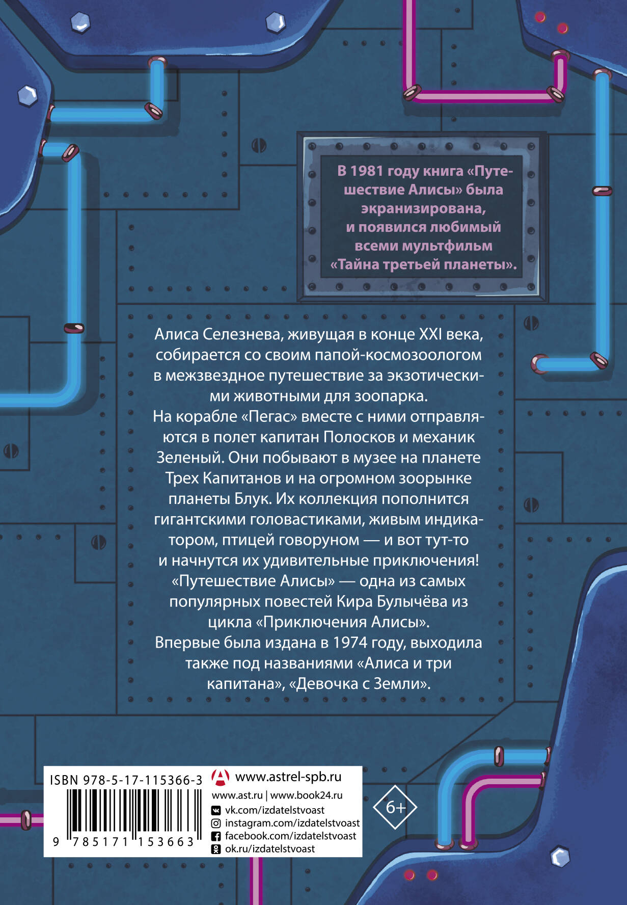 "Путешествие Алисы" - одна из самых популярных повестей Кира Булычёва из цикла "Приключения Алисы". Впервые была издана в 1974 году и также выходила под названиями "Алиса и три капитана", "Девочка с Земли". В 1981 году книга "Путешествие Алисы" была экранизирована, и появился любимый всеми мультфильм "Тай на третьей планеты". Алиса Селезнева, живущая в конце XXI века, собирается со своим папой-космозоологом в межзвездное путешествие за экзотическими животными для зоопарка. На корабле "Пегас" вместе с ними отправляются в полет капитан Полосков и механик Зеленый. Они побывают в музее на планете Трех Капитанов и на огромном зоорынке планеты Блук. Их коллекция пополнится гигантскими головастиками, живым индикатором, птицей говоруном - и вот тут-то и начнутся их удивительные приключения!