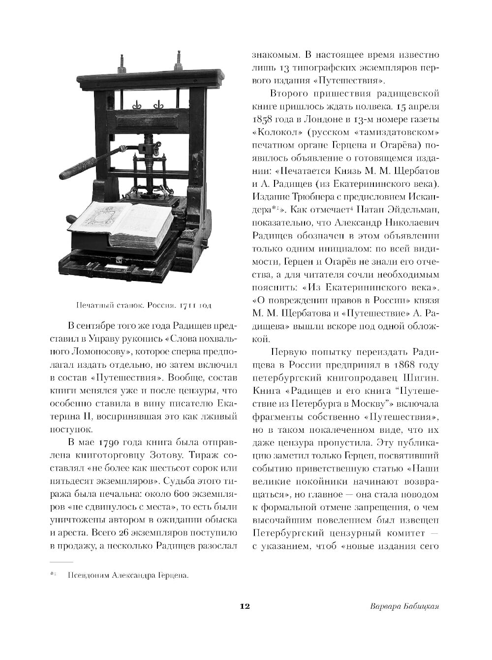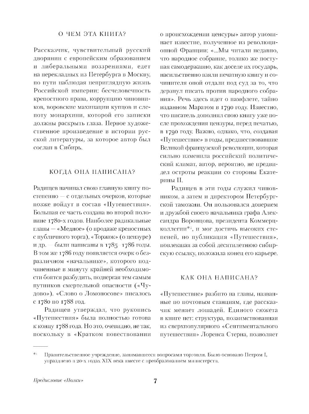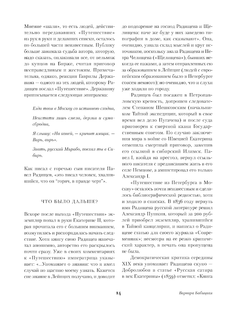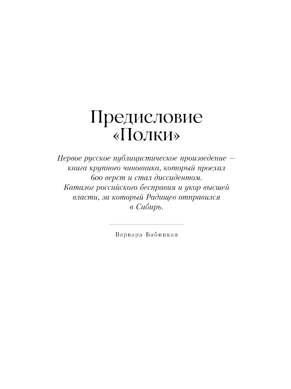 Первое русское публицистическое произведение - книга крупного чиновника, который проехал 600 верст и стал диссидентом. Каталог российского бесправия и укор высшей власти, за который Радищев отправился в Сибирь. «Главные книги русской литературы» - совместная серия издательства «Альпина. Проза» и интернет-проекта «Полка». Произведения, которые в ней выходят, выбраны современными писателями, критиками, литературоведами, преподавателями. Это и попытка определить, как выглядит сегодня русский литературный канон, и новый взгляд на известные произведения: каждую книгу сопровождает подробная статья авторов «Полки».| Издательство | Альпина Паблишер |