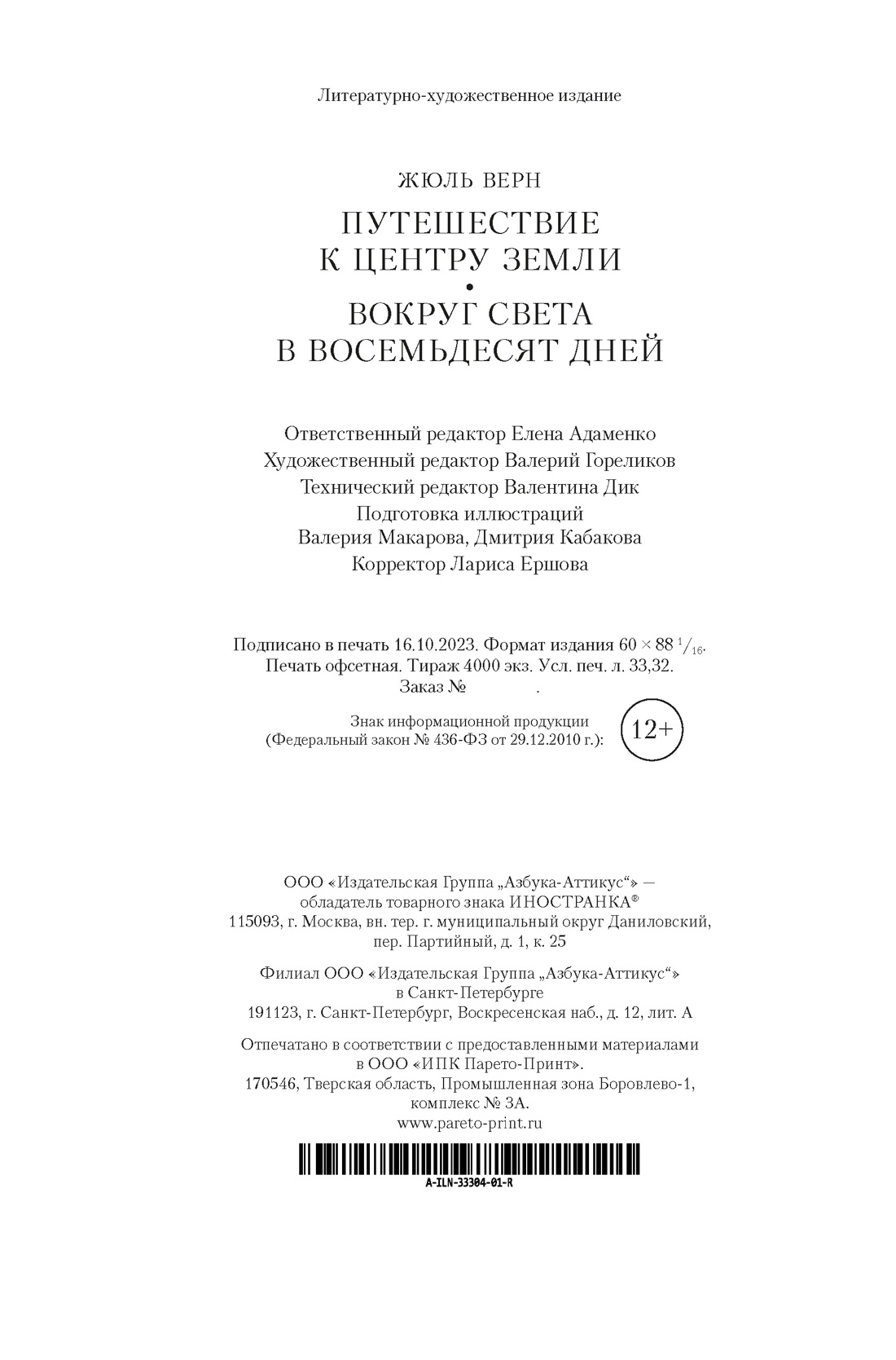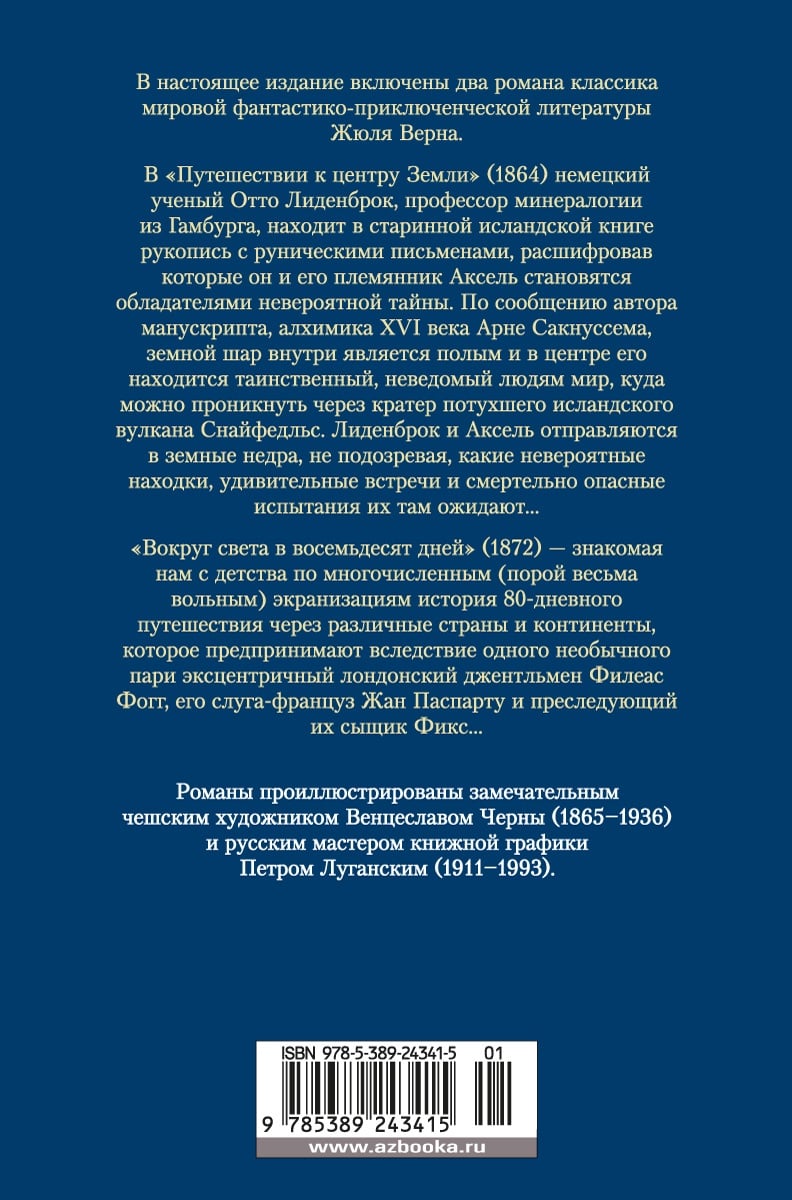 В настоящее издание включены два романа классика мировой фантастико-приключенческой литературы Жюля Верна. В «Путешествии к центру Земли» (1864) немецкий ученый Отто Лиденброк, профессор минералогии из Гамбурга, находит в старинной исландской книге рукопись с руническими письменами, расшифровав которые он и его племянник Аксель становятся обладателями невероятной тайны. По сообщению автора манускрипта, алхимика XVI века Арне Сакнуссема, земной шар внутри является полым и в центре его находится таинственный, неведомый людям мир, куда можно проникнуть через кратер потухшего исландского вулкана Снайфедльс. Лиденброк и Аксель отправляются в земные недра, не подозревая, какие невероятные находки, удивительные встречи и смертельно опасные испытания их там ожидают… «Вокруг света в восемьдесят дней» (1872) - знакомая нам с детства по многочисленным (порой весьма вольным) экранизациям история 80-дневного путешествия через различные страны и континенты, которое предпринимают вследствие одного необычного пари эксцентричный лондонский джентльмен Филеас Фогг, его слуга-француз Жан Паспарту и преследующий их сыщик Фикс… В настоящем издании романы проиллюстрированы замечательным чешским художником Венцеславом Черны (1865-1936) и русским мастером книжной графики Петром Луганским (1911-1993).| Издательство | Иностранка |