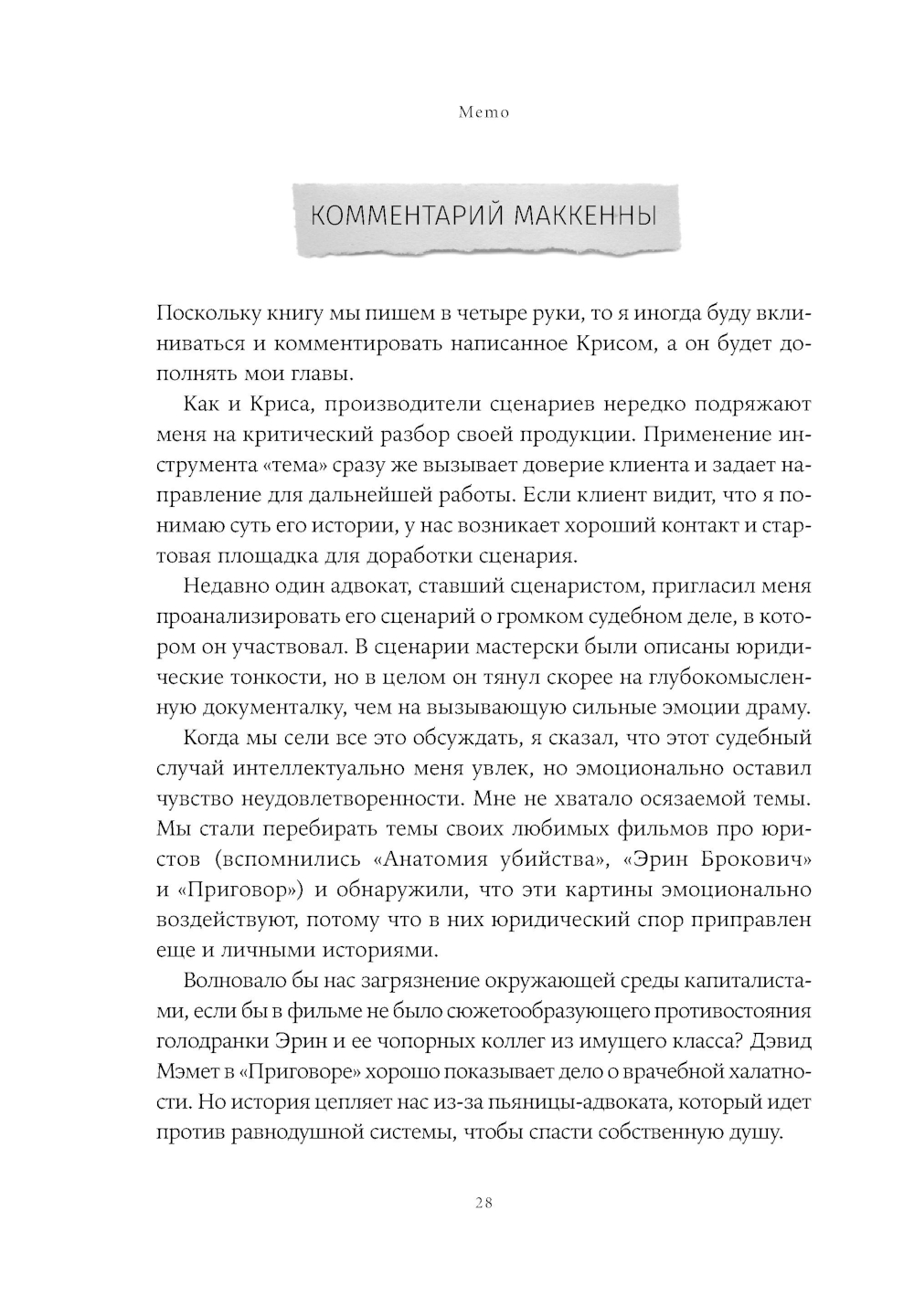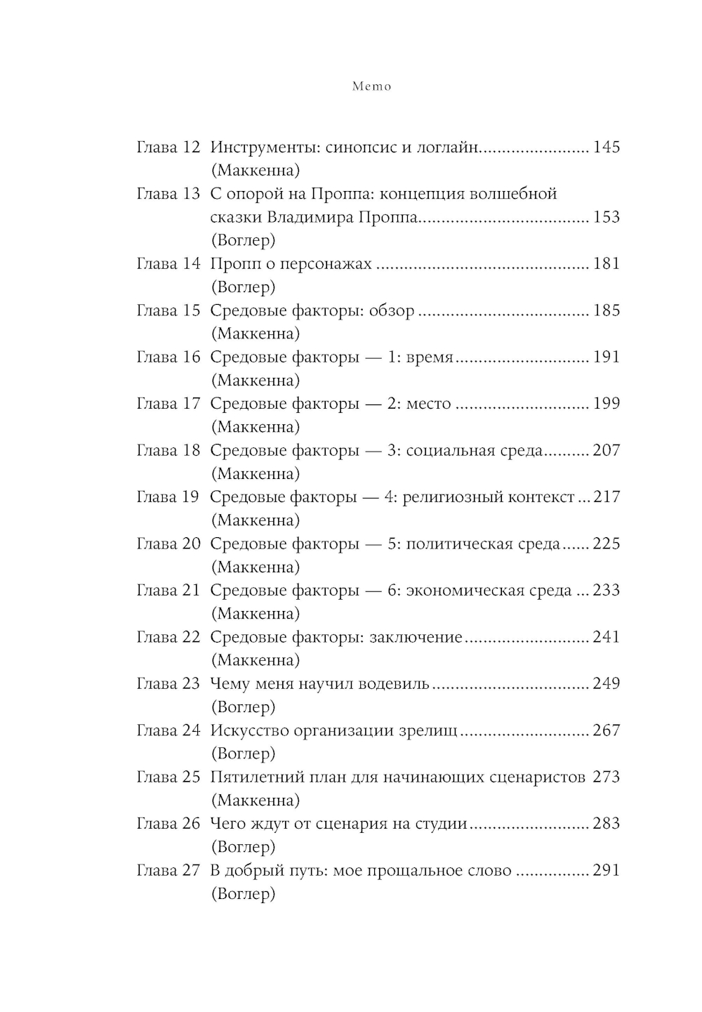 Комплект из 2 книг. Кристофер Воглер, Дэвид Маккенна «Memo: Секреты создания структуры и персонажей в сценарии»: Эта книга - результат многолетней работы Кристофера Воглера и Дэвида Маккенны. Будучи профессиональными экспертами, они проанализировали в общей сложности более 40 000 сценариев самых разных жанров. Свой совместный труд Воглер и Маккенна рассматривают не просто как полезный инструментарий сторителлинга, они считают его «спасительным» и для начинающих, и для активно пишущих авторов. Кристофер Воглер «Путешествие писателя: Мифологические структуры в литературе и кино»: В основе любой увлекательной истории - будь то сказка, миф, сюжет для романа или киносценарий - лежит путешествие героя: внутреннее или внешнее. Эта идея стала путеводной звездой для Кристофера Воглера, когда, работая в сценарном отделе диснеевской студии, он проверял на практике действенность мифологических схем, описанных в знаменитом труде Кэмпбелла «Тысячеликий герой». Позже практическое пособие, написанное Воглером для коллег, превратилось в классический учебник, который не только входит в круг обязательного чтения будущих писателей и сценаристов, но и десятилетиями не теряет лидирующего положения среди множества книг такого рода. В «Путешествии писателя» автор приглашает читателя исследовать зыбкие границы между мифом и современным искусством рассказывания истории, предупреждая о трудностях и опасностях путешествия в недра собственной души, и вооружает полезными инструментами, которые в руках умелого мастера приобретают невероятную силу.| Издательство | Альпина нон-фикшн |