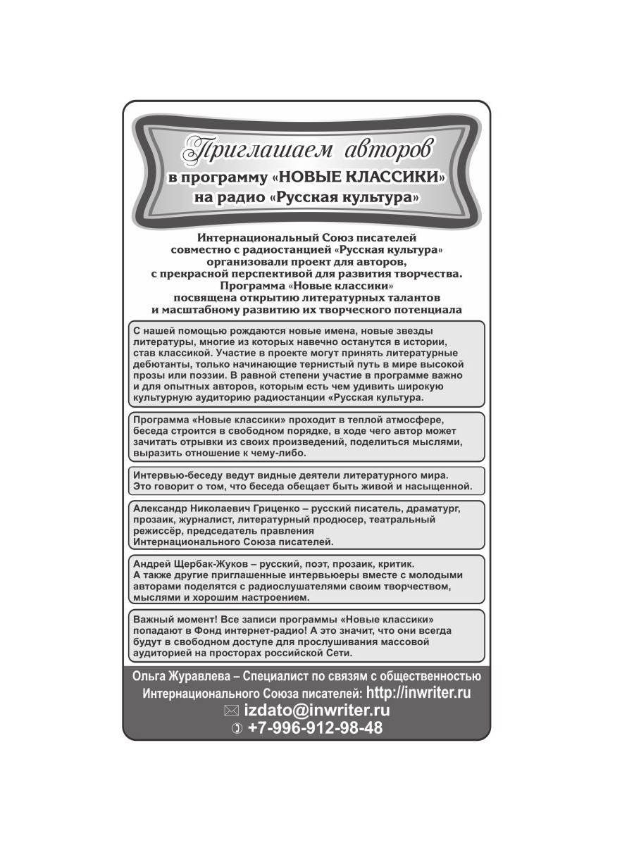 В сборнике представлена поэзия на темы: о любви к родному краю, к отчему дому, родителям, между мужчиной и женщиной. Часть стихов посвящена дружбе, на религиозную, философскую тему и о природе в разные времена года.| Издательство | Т8 RUGRAM |