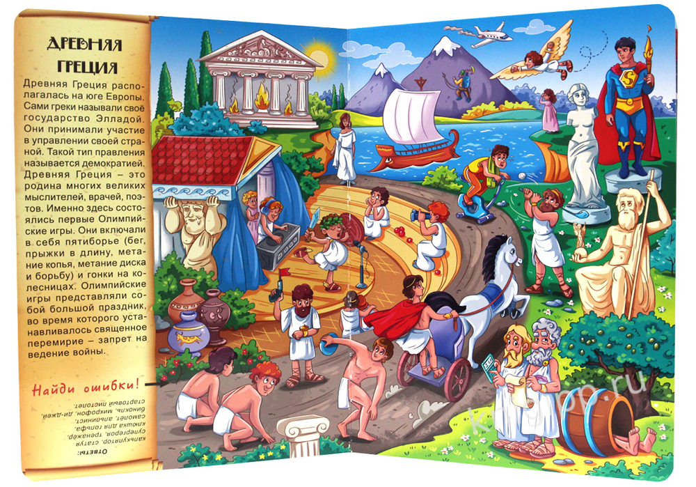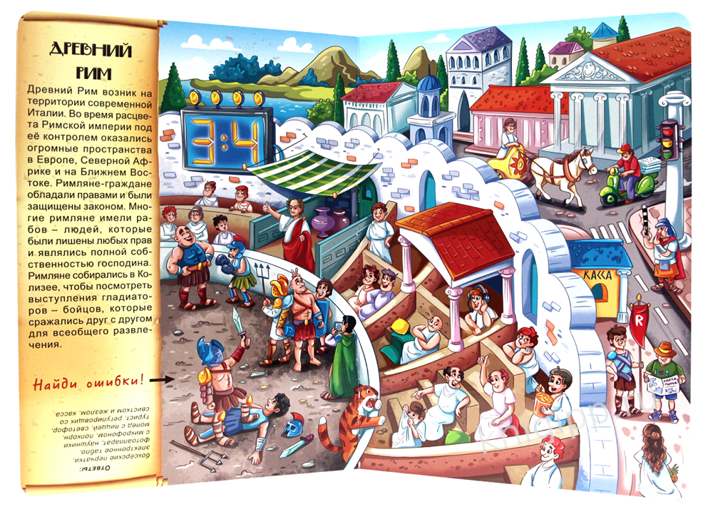 Предлагаем отправиться в захватывающее путешествие в прошлое! И для этого тебе не понадобится машина времени. Просто открой книгу и ты побываешь в Древнем Египте, Древнем Китае, Древнем Риме и даже сможешь увидеть первобытных людей! Разглядывать яркие забавные картинки с множеством деталей понравится не только детям, но и взрослым. Сможешь ли ты найти все ошибки истории? Проверь свою внимательность! Приятного путешествия!