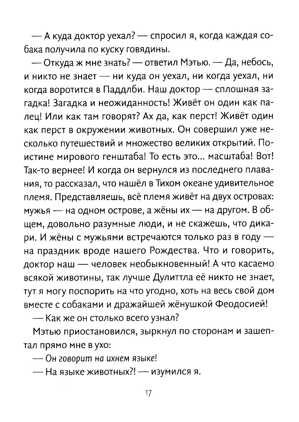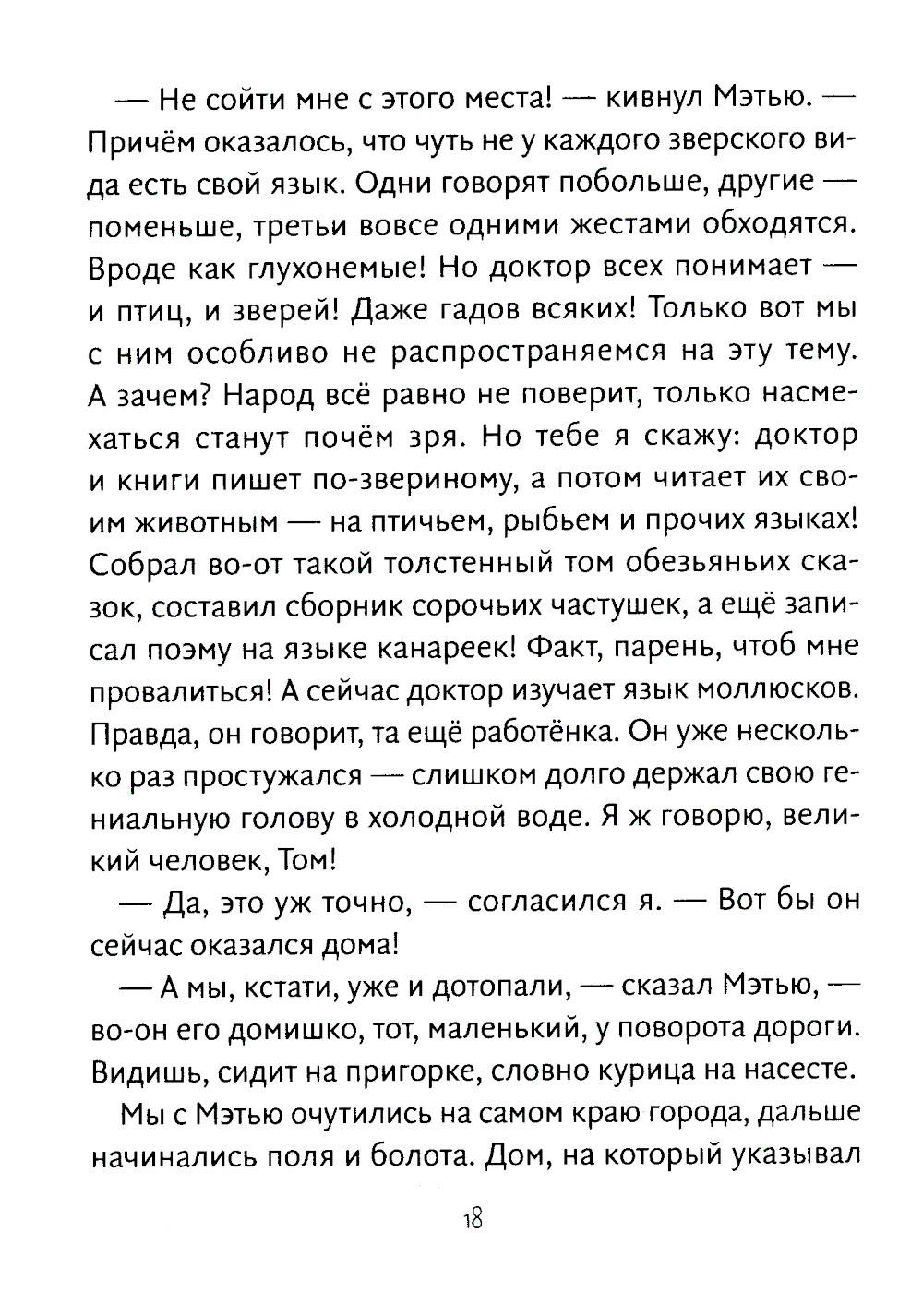 Сын простого сапожника из Паддлби-на-Болоте, девятилетний Томми Стаббинс и представить не мог, что когда-нибудь ему посчастливится стать помощником самого доктора Дулиттла. Однако - вот удача! - всё случилось именно так, и теперь доктор не только учит мальчика читать и писать - он открывает ему тайны природы, обучает языкам животных и берёт с собой в полную опасностей и невероятных приключений экспедицию в джунгли Южной Америки, на загадочный Остров Коаты. Эта сказочная повесть вышла спустя два года после нашумевшей "Истории доктора Дулиттла" и принесла автору одну из самых престижных наград в области детской литературы - Медаль Джона Ньюбери. В нашей книге повесть впервые публикуется в переводе известного писателя и натуралиста Станислава Востокова.| Издательство | Волчок |