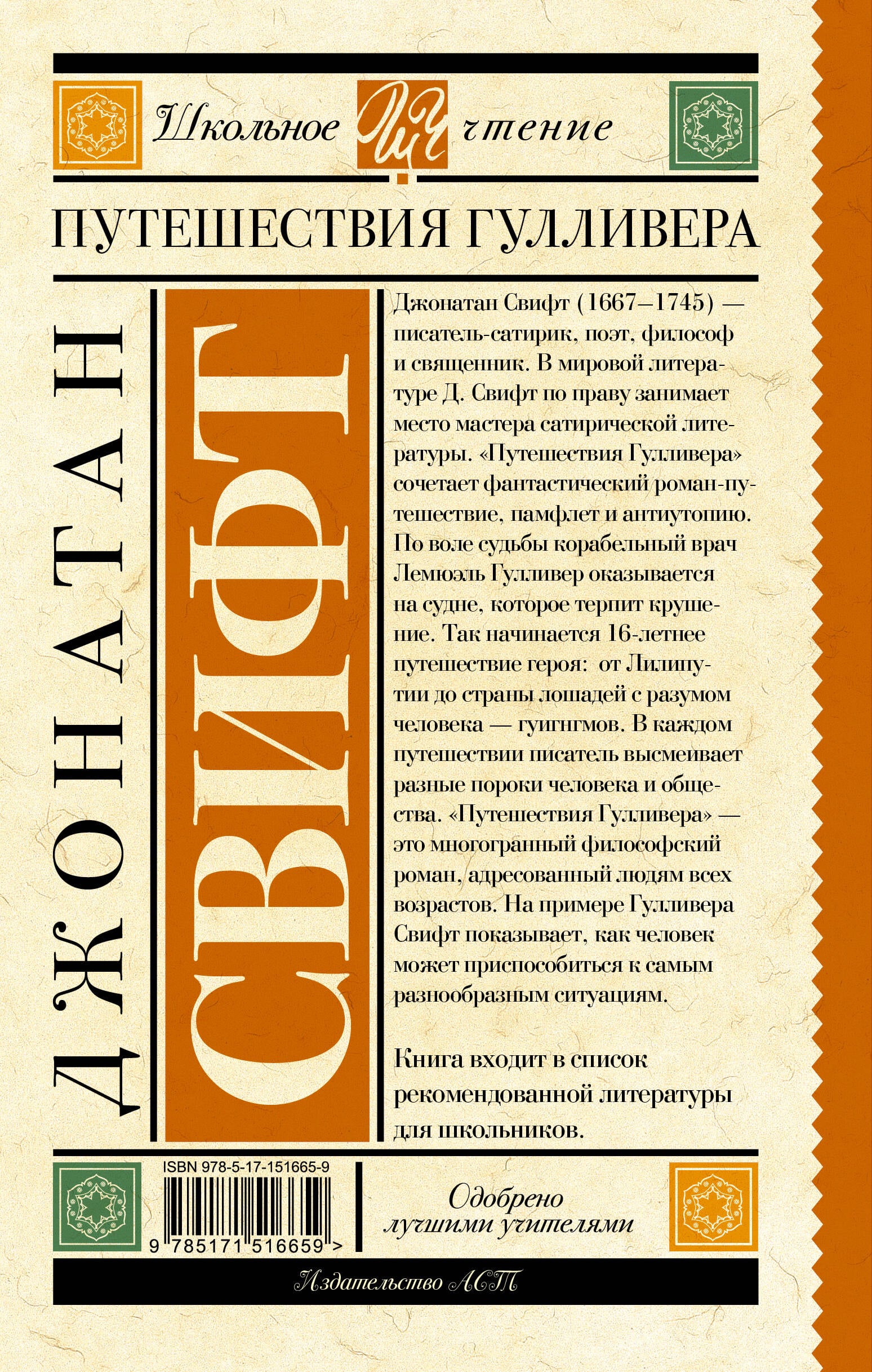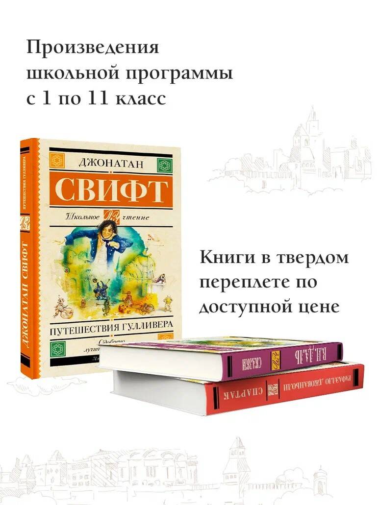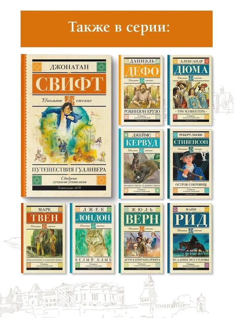 Джонатан Свифт (1667-1745) - писатель-сатирик, поэт, философ и священник. В мировой литературе Д. Свифт по праву занимает место мастера сатирической литературы. "Путешествие Гулливера" сочетает фантастический роман-путешествие, памфлет и антиутопию. По воле судьбы корабельный врач Лемюэль Гулливер оказывается на судне, которое терпит крушение. Так начинается 16-летнее путешествие героя: от Лилипутии до страны лошадей с разумом человека - гуигнгмов, . В каждом путешествии писатель высмеивает разные пороки человека и общества. "Путешествие Гулливера" - это многогранный философский роман, адресованный людям всех возрастов. На примере Гулливера Свифт показывает, как человек способен приспособиться к самым разнообразным ситуациям.| Издательство | АСТ |