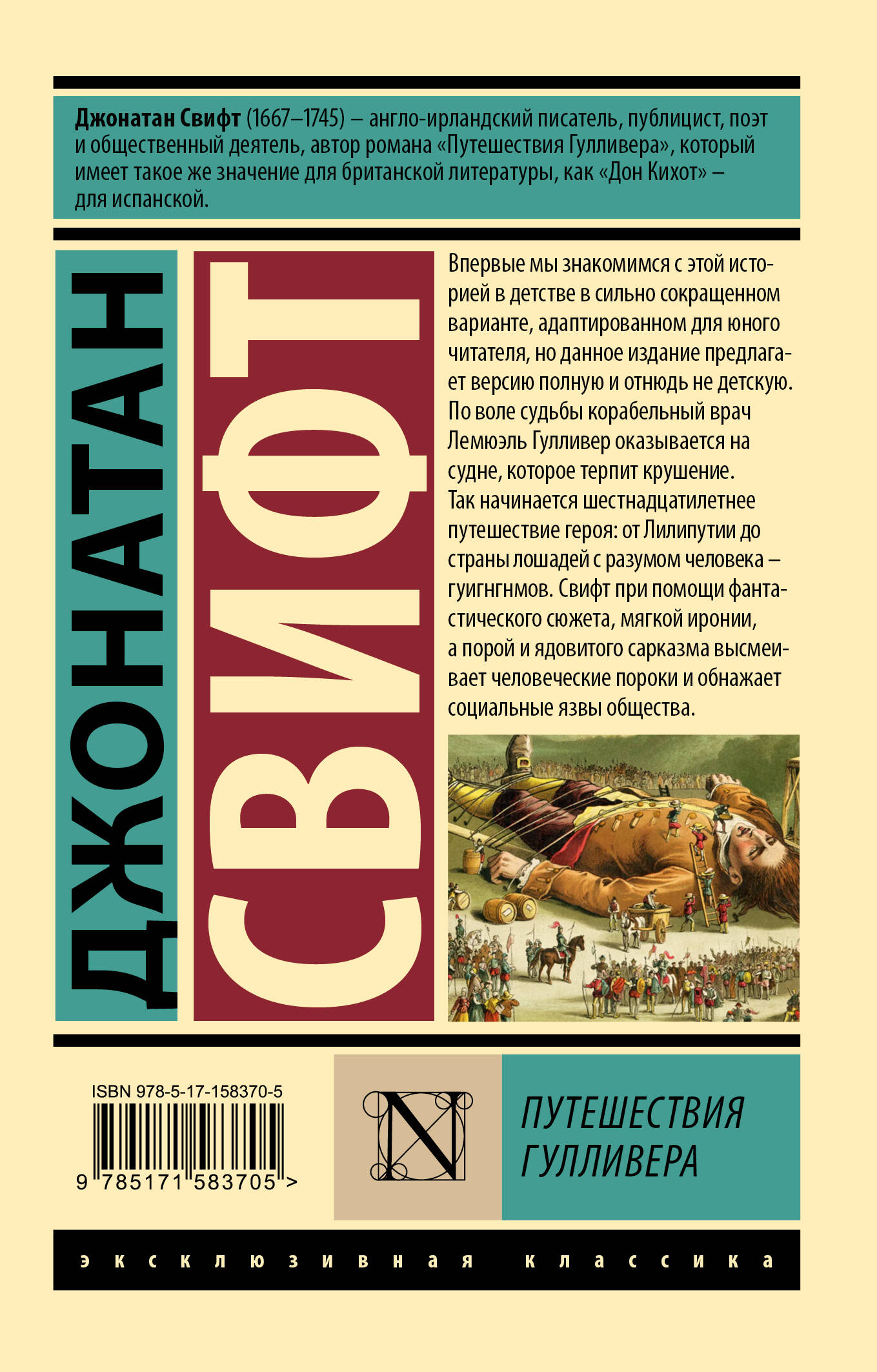 Впервые мы знакомимся с этой историей в детстве в сильно сокращенном варианте, адаптированном для юного читателя, но данное издание предлагает версию полную и отнюдь не детскую. По воле судьбы корабельный врач Лемюэль Гулливер оказывается на судне, которое терпит крушение. Так начинается шестнадцатилетнее путешествие героя: от Лилипутии до страны лошадей с разумом человека - гуигнгнмов. Свифт при помощи фантастического сюжета, мягкой иронии, а порой и ядовитого сарказма высмеивает человеческие пороки и обнажает социальные язвы общества.| Издательство | Издательство "АСТ" |