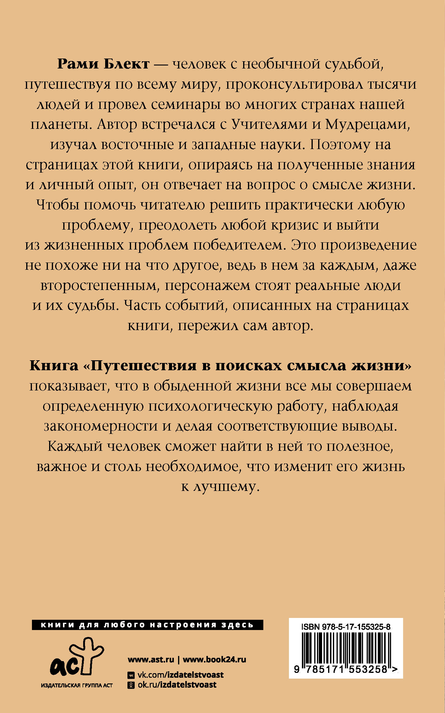 Рами Блект - человек с необычной судьбой, путешествуя по всему миру, проконсультировал тысячи людей и провел семинары во многих странах нашей планеты. Автор встречался с Учителями и Мудрецами, изучал восточные и западные науки. Поэтому на страницах этой книги, опираясь на полученные знания и личный опыт, он отвечает на вопрос о смысле жизни. Чтобы помочь читателю решить практически любую проблему, преодолеть любой кризис и выйти из жизненных проблем победителем. Это произведение не похоже ни на что другое, ведь в нем за каждым, даже второстепенным, персонажем стоят реальные люди и их судьбы. Часть событий, описанных на страницах книги, пережил сам автор. Книга "Путешествия в поисках смысла жизни" показывает, что в обыденной жизни все мы совершаем определенную психологическую работу, наблюдая закономерности и делая соответствующие выводы. Каждый человек сможет найти в ней то полезное, важное и столь необходимое, что изменит его жизнь к лучшему.| Издательство | ИЗДАТЕЛЬСТВО "АСТ" |