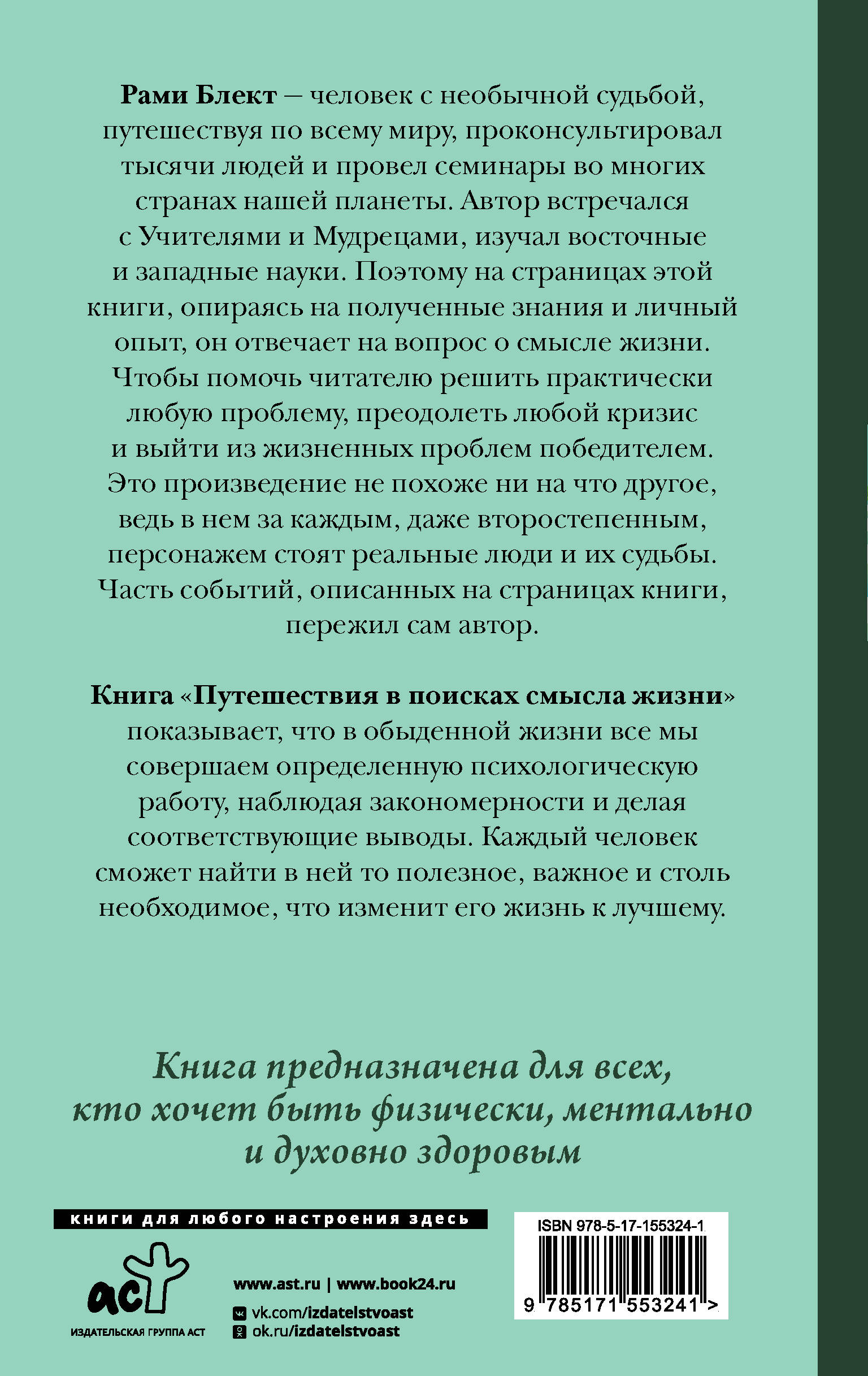 Рами Блект - человек с необычной судьбой, путешествуя по всему миру, проконсультировал тысячи людей и провел семинары во многих странах нашей планеты. Автор встречался с Учителями и Мудрецами, изучал восточные и западные науки. Поэтому на страницах этой книги, опираясь на полученные знания и личный опыт, он отвечает на вопрос о смысле жизни. Чтобы помочь читателю решить практически любую проблему, преодолеть любой кризис и выйти из жизненных проблем победителем. Это произведение не похоже ни на что другое, ведь в нем за каждым, даже второстепенным, персонажем стоят реальные люди и их судьбы. Часть событий, описанных на страницах книги, пережил сам автор. Книга "Путешествия в поисках смысла жизни" показывает, что в обыденной жизни все мы совершаем определенную психологическую работу, наблюдая закономерности и делая соответствующие выводы. Каждый человек сможет найти в ней то полезное, важное и столь необходимое, что изменит его жизнь к лучшему.| Издательство | ИЗДАТЕЛЬСТВО "АСТ" |