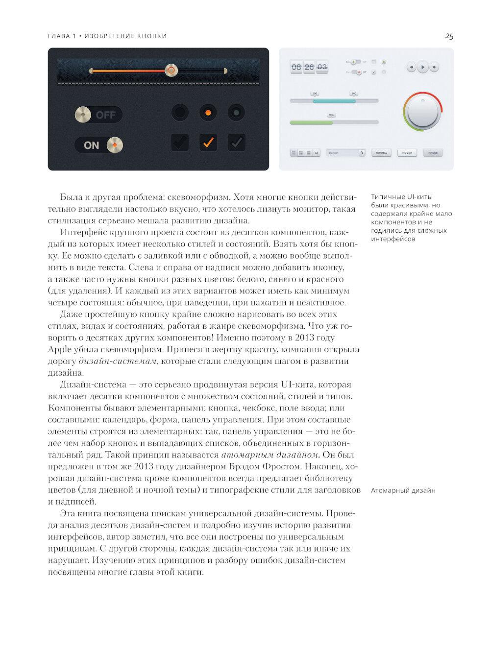 Цельная история о логике интерфейсов: от первых Xerox Alto и Apple Lisa до macOS/Windows, от Newton до iPhone/Android и дальше - к смешанной реальности (Meta Quest, Apple Vision). На конкретных примерах и сотнях иллюстраций автор последовательно разбирает происхождение стандартных компонентов (кнопки, чекбоксы, списки, меню, поля ввода, вкладки), их анатомию и все состояния - и как на их основе собрать собственную универсальную дизайн-систему вместо бездумного копирования шаблонов. Автор разбирает каждый элемент одновременно «вблизи» (анатомия, варианты, состояния, контекст применения) и «с высоты» (эволюция решений от железа к цифровому миру, перенос между платформами, влияние инструментов - от Photoshop/Sketch к Figma). История превращается в систему, а система - в ускоритель ваших продуктовых решений. Вы увидите, зачем в OS X впервые отделили основную кнопку от вторичных, как Windows привнесла «наведение», почему iOS отказалась от скевоморфизма - и как эти исторические повороты превратились в сегодняшние правила, которые реально повышают юзабилити и скорость разработки.| Издательство | Альпина ПРО |