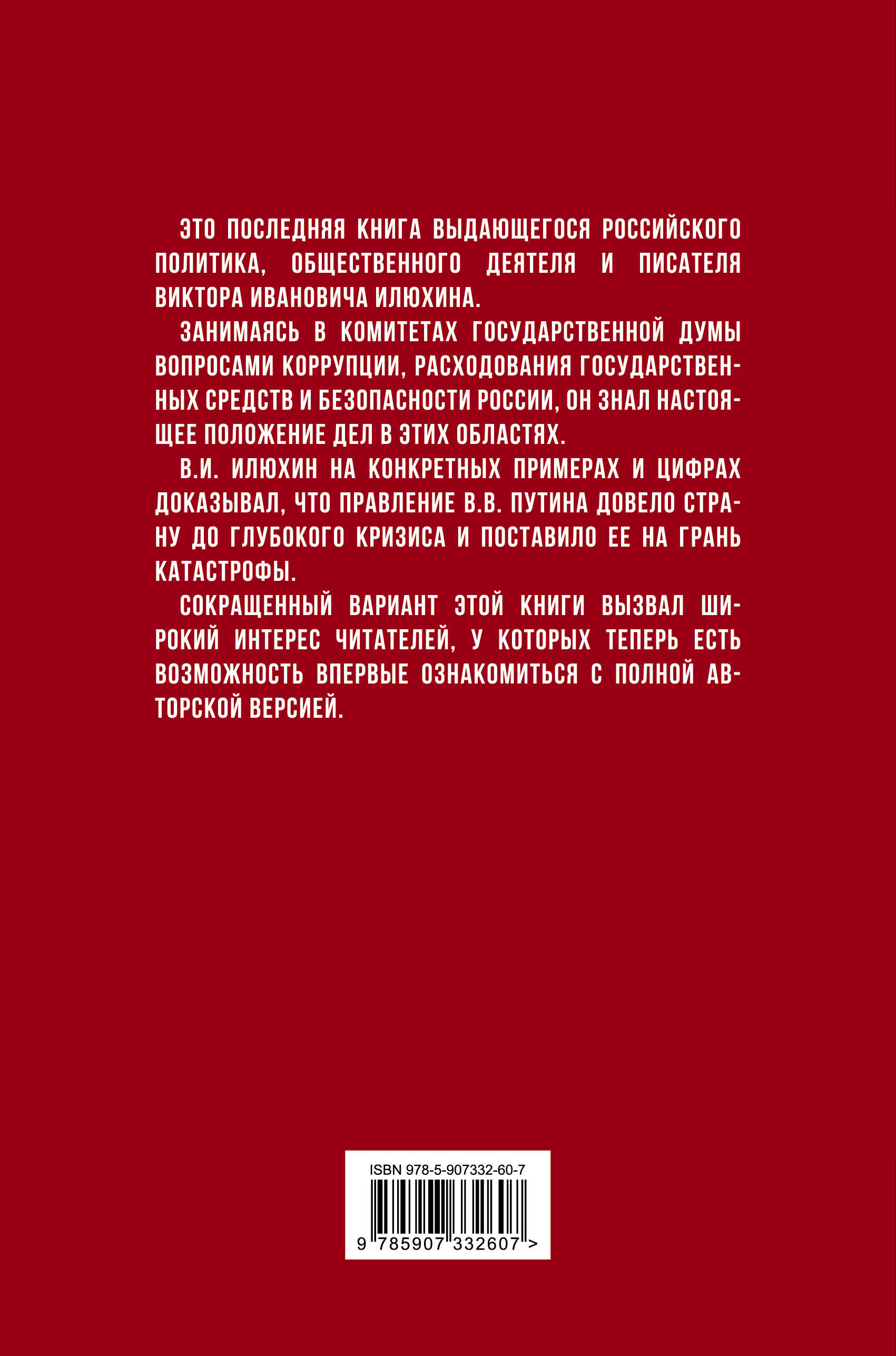 Это последняя книга выдающегося российского политика, общественного деятеля и писателя Виктора Ивановича Илюхина. Занимаясь в комитетах Государственной Думы вопросами коррупции, расходования государственных средств и безопасности России, он знал настоящее положение дел в этих областях. В.И. Илюхин на конкретных примерах и цифрах доказывал, что правление В.В. Путина довело страну до глубокого кризиса и поставило ее на грань катастрофы. Сокращенный вариант этой книги вызвал широкий интерес читателей, у которых теперь есть возможность впервые ознакомиться с полной авторской версией.| Издательство | Родина Издательство ООО |