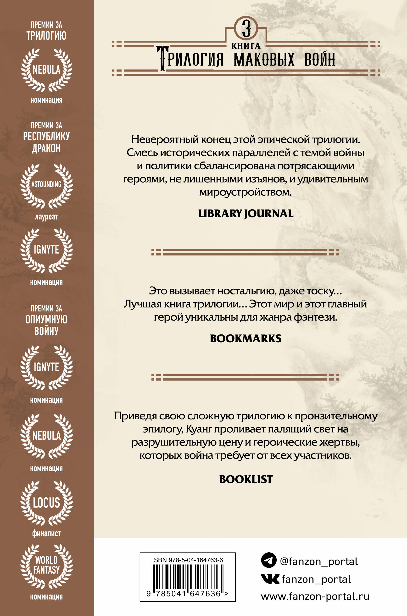 Премия «Astounding». Лучший новый автор. «Лучшая фантастика и фэнтези». Выбор редакции AMAZON.COM. После кровавых сражений с остатками мугенской армии и союзниками гесперианцев, желающих присвоить никанские богатства, Рин снова остается ни с чем. Преданная и искалеченная, она бежит из Арлонга, чтобы собраться с силами и ударить по врагу. Но ее новые союзники в руководстве Южной коалиции лукавы и ненадежны, Рин быстро понимает, что настоящая сила в Никане - это миллионы простых людей, которые жаждут мести и почитают ее как богиню спасения. Однако по мере роста ее силы и влияния крепнет опьяняющий голос Феникса, призывающий ее сжечь весь мир. И противостоять ему все сложнее... Эффектное завершение трилогии «Опиумной войны», нашумевшего, отмеченного наградами эпического фэнтези Ребекки Куанг, которое сочетает в себе историю Китая как Средних веков, так и недавнего прошлого, с опасным миром богов и монстров. «Эта серия - просто чудо». - Виктория Шваб «Невероятный конец этой эпической трилогии. Смесь исторических параллелей с темой войны и политики сбалансирована потрясающими героями, не лишенными изъянов, и удивительным мироустройством». - Library Journal «Это вызывает ностальгию, даже тоску… "Пылающий бог" - лучшая книга трилогии… Этот мир и этот главный герой уникальны для жанра фэнтези». - Book Marks «Приведя свою сложную трилогию "Опиумной войны" к пронзительному эпилогу, Куанг проливает палящий свет на разрушительную цену и героические жертвы, которые война требует от всех участников». - Booklist| Издательство | ООО "Издательство "Эксмо" |