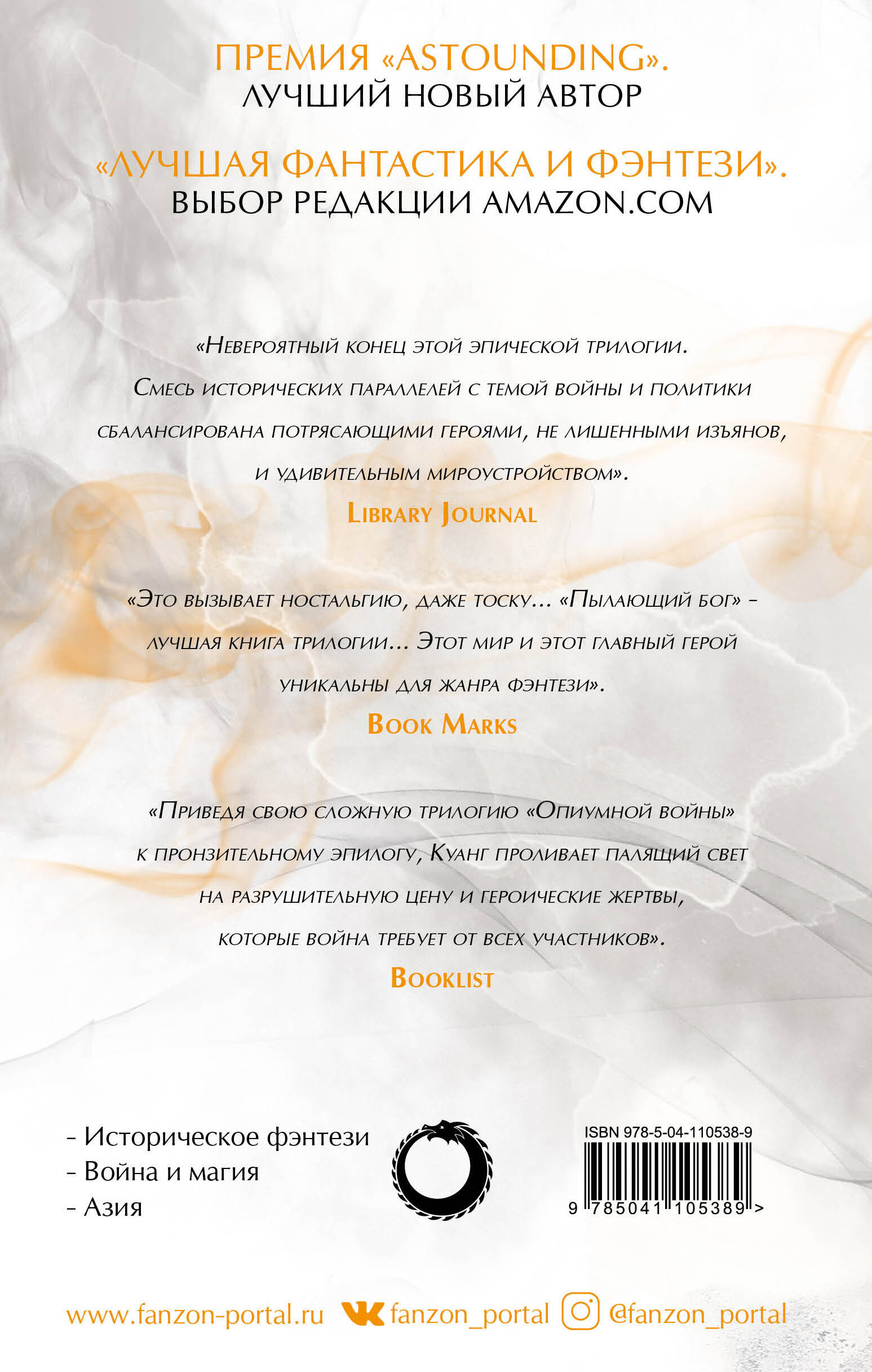 После кровавых сражений с остатками мугенской армии и союзниками гесперианцев, желающих присвоить никанские богатства, Рин снова остается ни с чем. Преданная и искалеченная, она бежит из Арлонга, чтобы собраться с силами и ударить по врагу. Но ее новые союзники в руководстве Южной коалиции лукавы и ненадежны, Рин быстро понимает, что настоящая сила в Никане - это миллионы простых людей, которые жаждут мести и почитают ее как богиню спасения. Однако по мере роста ее силы и влияния крепнет опьяняющий голос Феникса, призывающий ее сжечь весь мир. И противостоять ему все сложнее... Эффектное завершение трилогии «Опиумной войны», нашумевшего, отмеченного наградами эпического фэнтези Ребекки Куанг, которое сочетает в себе историю Китая как Средних веков, так и недавнего прошлого с опасным миром богов и монстров.| Издательство | ООО "Издательство "Эксмо" |