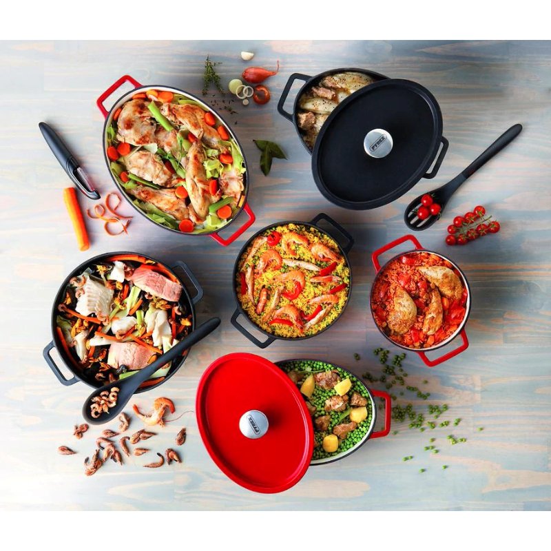 Специальная текстура в нижней части крышки собирает конденсат и равномерно увлажняет пищу во время приготовления. Чугун хорошо аккумулирует тепло, поэтому вы сэкономите электроэнергию. После приготовления он долго будет оставаться теплым.