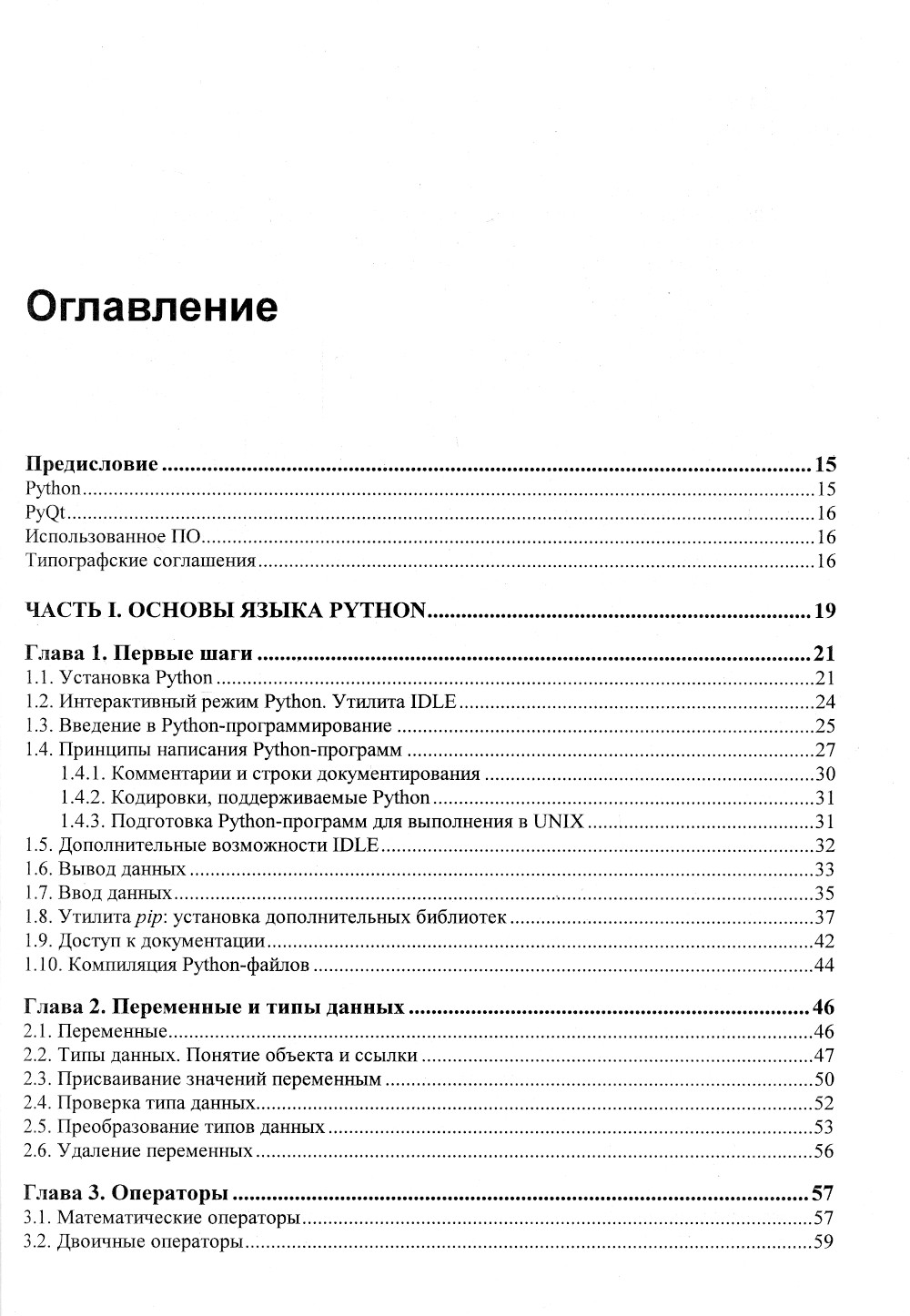 Описан язык Python 3: типы данных, операторы, условия ветвления и выбора, циклы, регулярные выражения, функции, классы, работа с файлами и каталогами, взаимодействие с механизмами Windows, часто используемые модули стандартной библиотеки. Особое внимание уделено библиотеке PyQt, позволяющей создавать приложения с графическим интерфейсом. Описаны средства для создания и вывода окон, основных компонентов (кнопок, полей, списков, таблиц, меню, панелей инструментов и др.). Рассмотрена обработка событий и сигналов, разработка многопоточных программ, работа с базами данных, вывод графики, воспроизведение мультимедиа, запись аудио, видео и фото, печать документов, экспорт их в формат Adobe PDF и сохранения настроек программ. Дан пример полнофункционального приложения для создания и решения головоломок судоку. На сайте издательства размещен электронный архив со всеми примерами из книги.