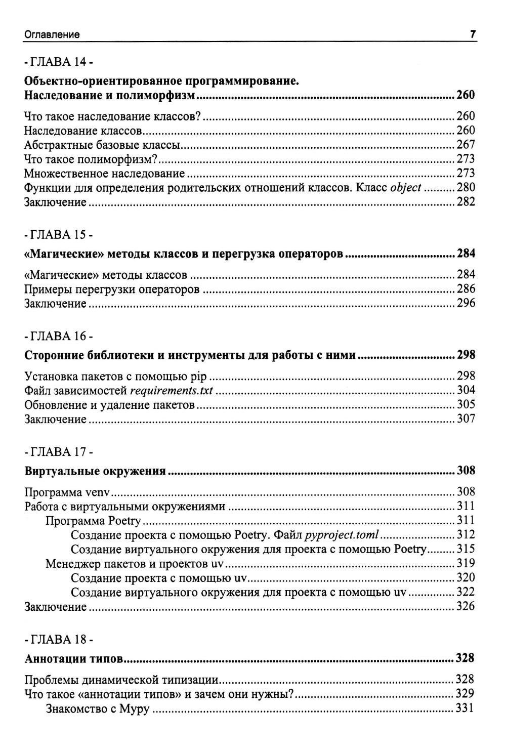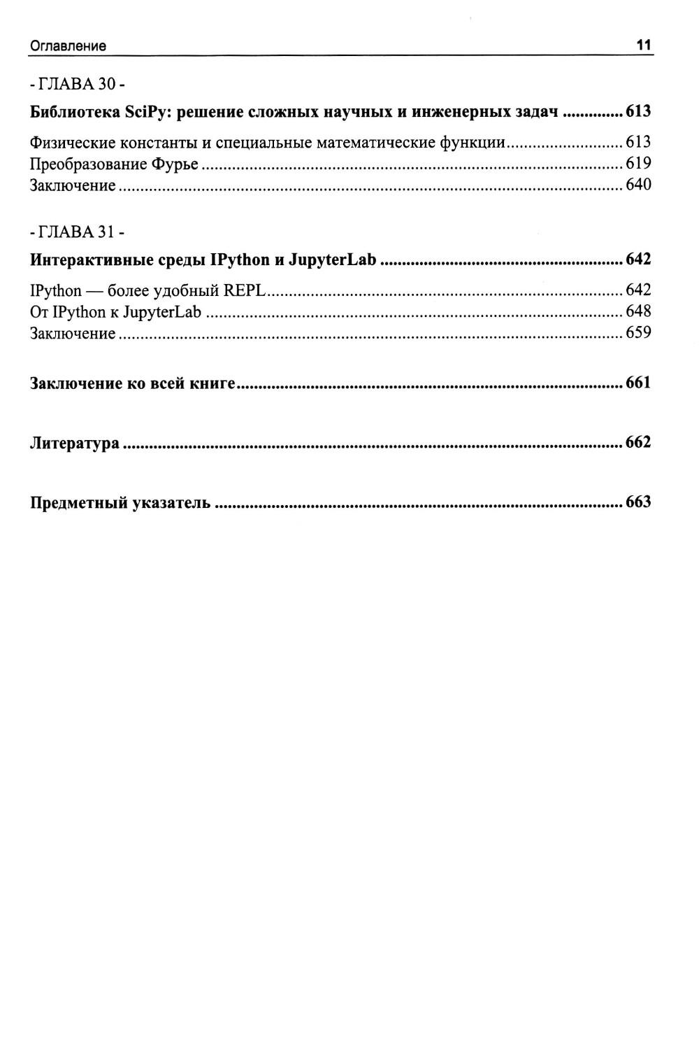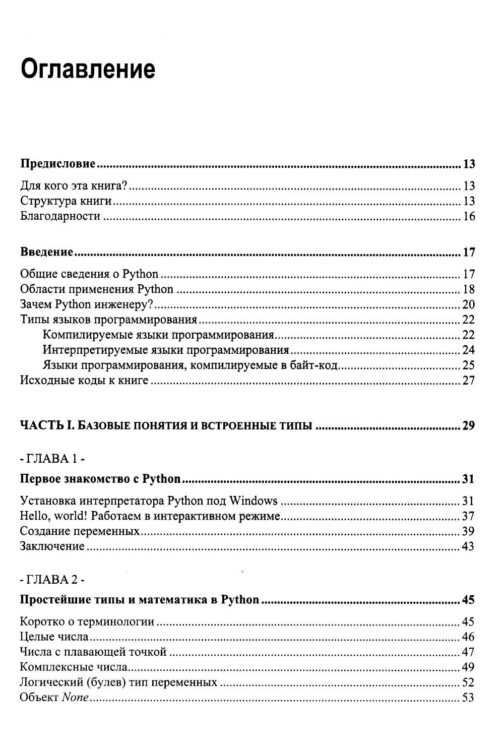 Книга предназначена для изучения языка Python с ориентацией на использование его в инженерных и научных вычислениях, начиная с установки интерпретатора и изучения основ языка и до применения специализированных библиотек. Основные темы касаются встроенных типов языка, функций и аннотации типов, особенностей динамической типизации, форматирования и обработки текста, в том числе с использованием регулярных выражений, работа с файлами. Подробно рассматриваются основные идеи объектно-ориентированного программирования и его особенности в Python. Также затрагиваются темы обработки исключений, тестирования приложений, описываются некоторые модули из стандартной библиотеки, а также множество сторонних библиотек, в частности, NumPy для математических вычислений, Pandas для обработки табличных данных, Matplotlib для построения различных видов графиков, библиотеки для работы с различными форматами файлов. Рассматриваются такие инструменты, как IPython и JupyterLab, применяемые в научных и инженерных областях.