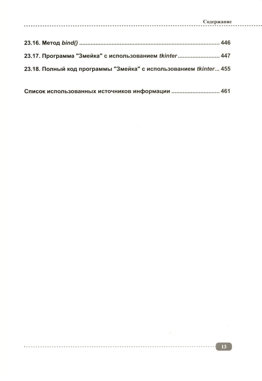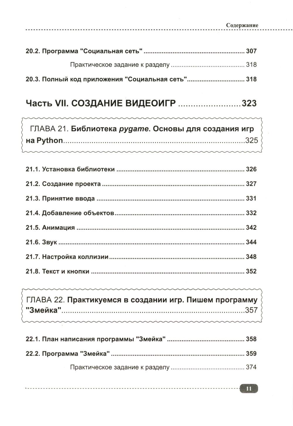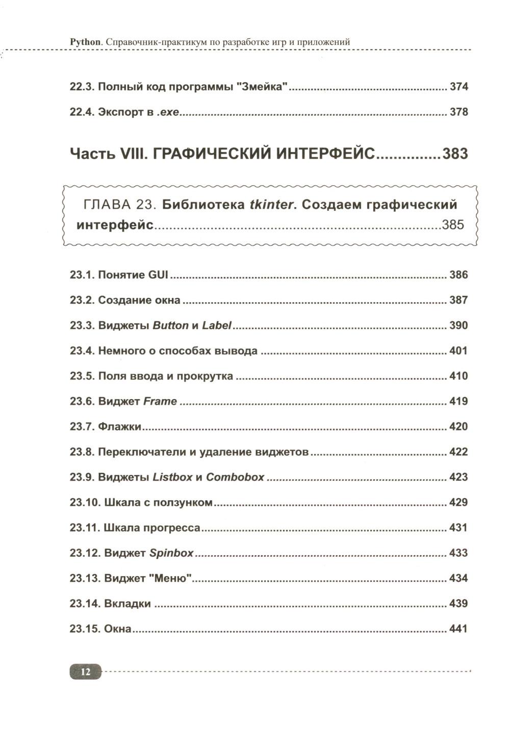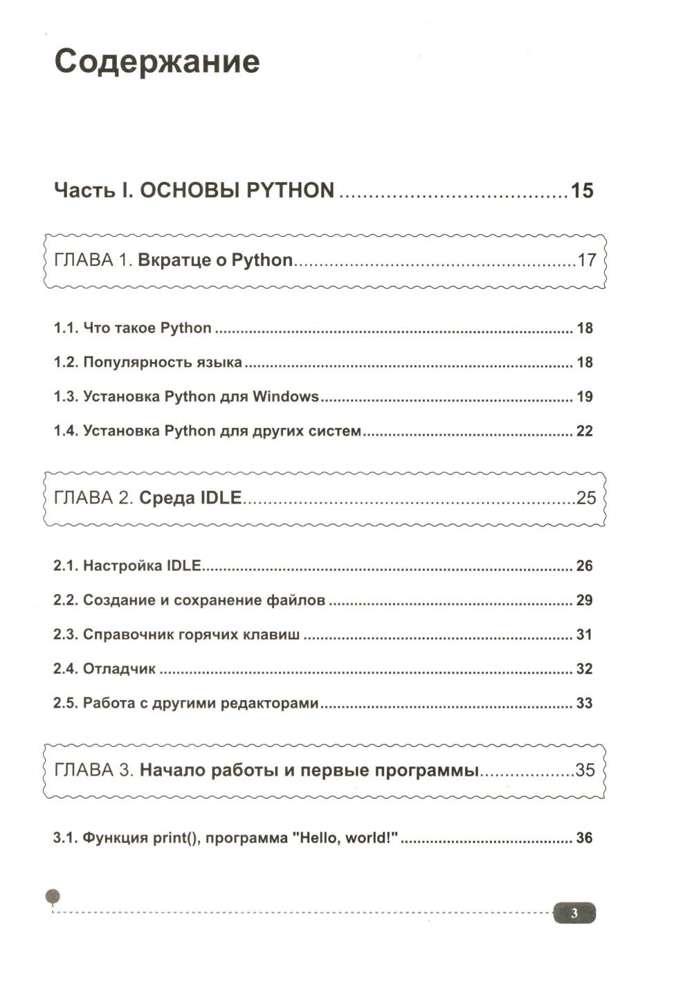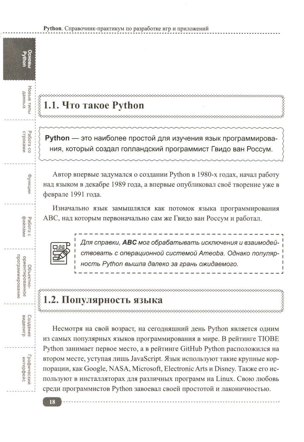 Данная книга будет полезна всем, кто интересуется Python: для начинающих она будет практическим руководством с примерами, а для более опытных программистов удобным справочником, позволяющим быстро находить нужную информацию под рукой. Упор в книге сделан на практику, которая подаётся в простой для понимания форме, а её сложность возрастает по мере продвижения: от основных концепций Python (среда IDLE, работа с файлами, переменные, типы данных, операторы, функции, циклы и т.д.) до более сложных и многогранных аспектов (объектно-ориентированное программирование (ООП), библиотека pygame, создание графических интерфейсов, работа с tkinter и т.д.). В каждом разделе для закрепления информации рассмотрено создание различных развивающих игр и программ с пошаговым разбором кода, а также имеются задания для самостоятельного выполнения, которые помогут развить логическое мышление и навыки написания своего собственного кода. К книге прилагается виртуальный диск с играми и программами, рассмотренными в книге, это позволит Вам наглядно попрактиковаться в создании собственных игр и приложений на Python.| Издательство | Наука и техника |