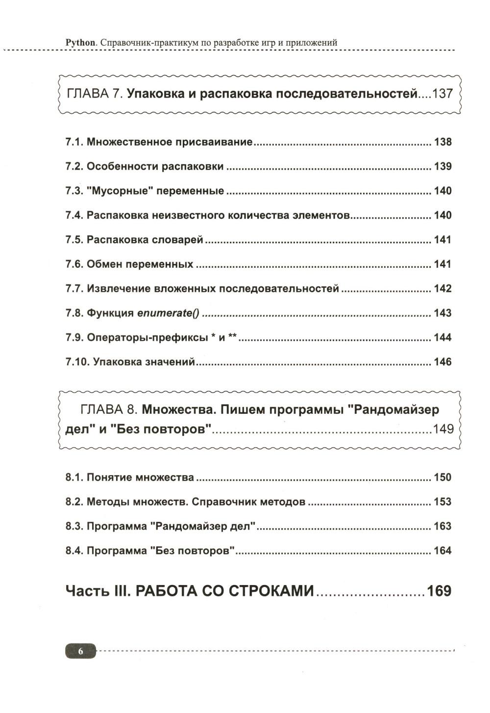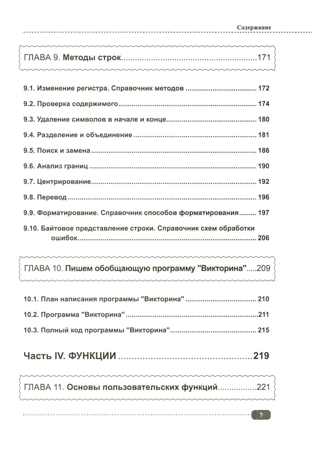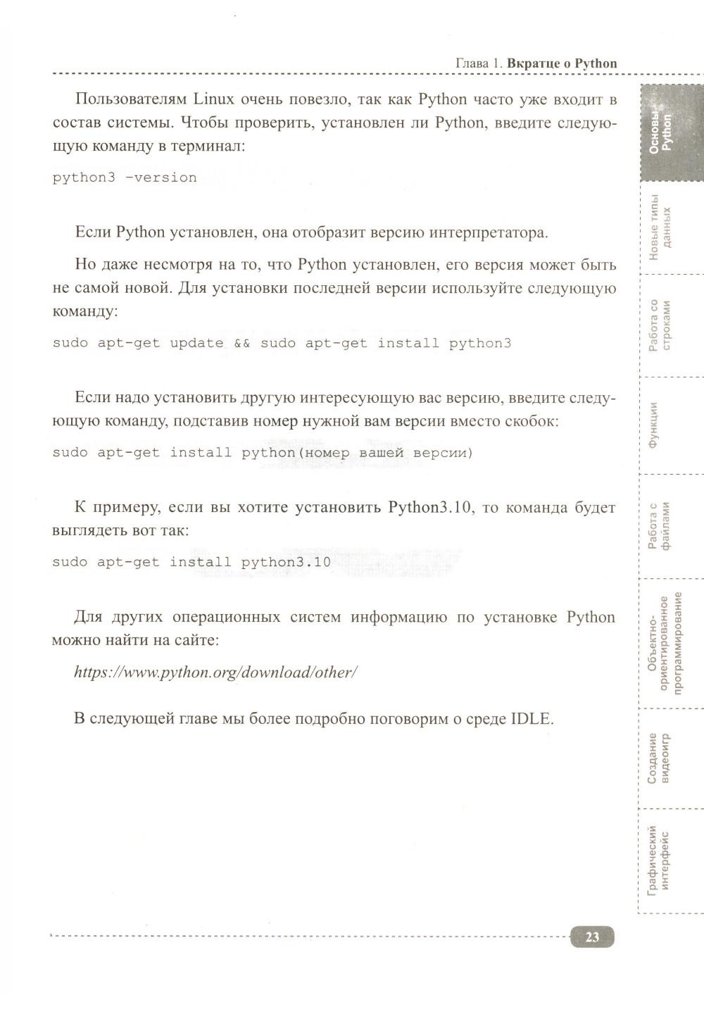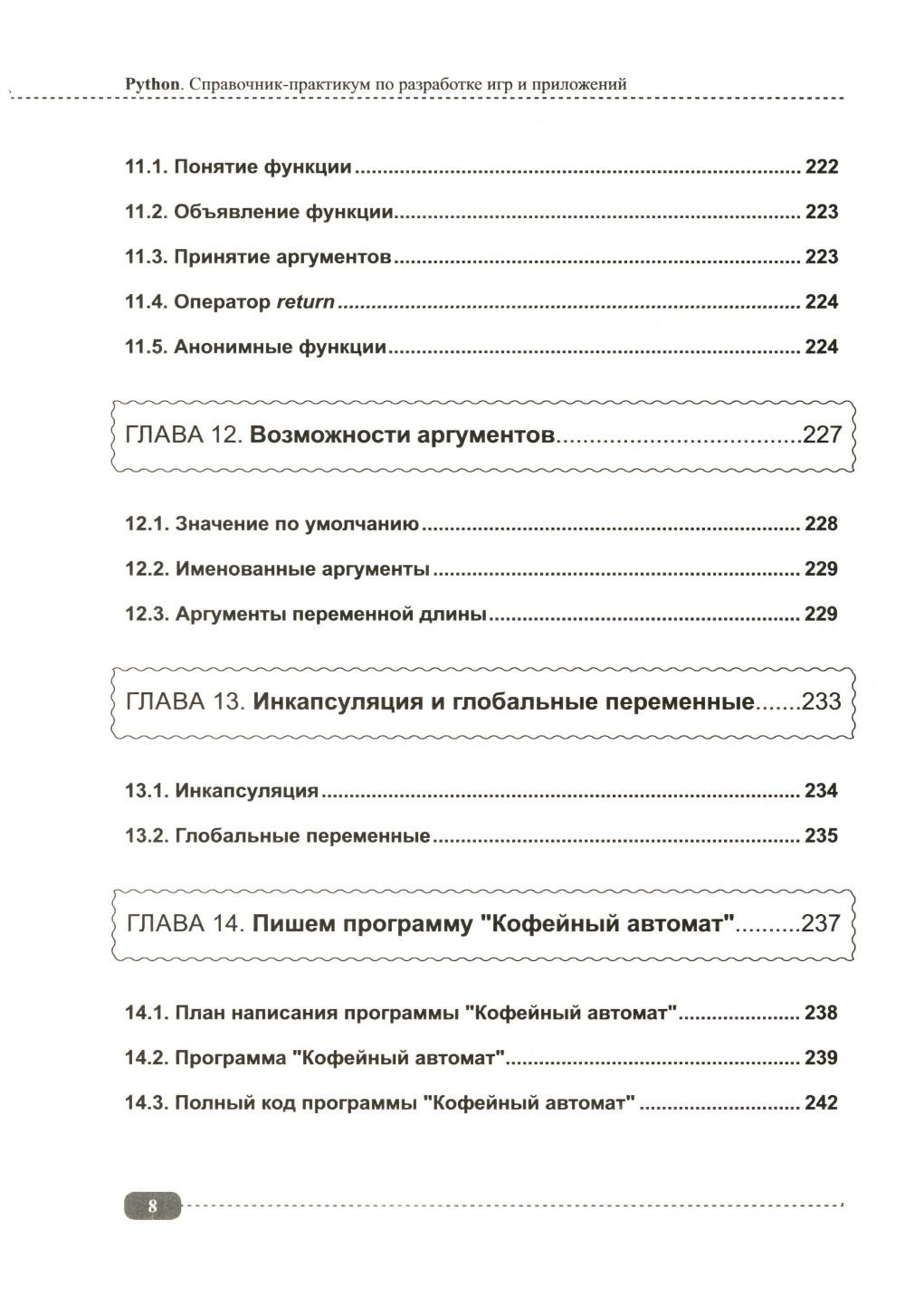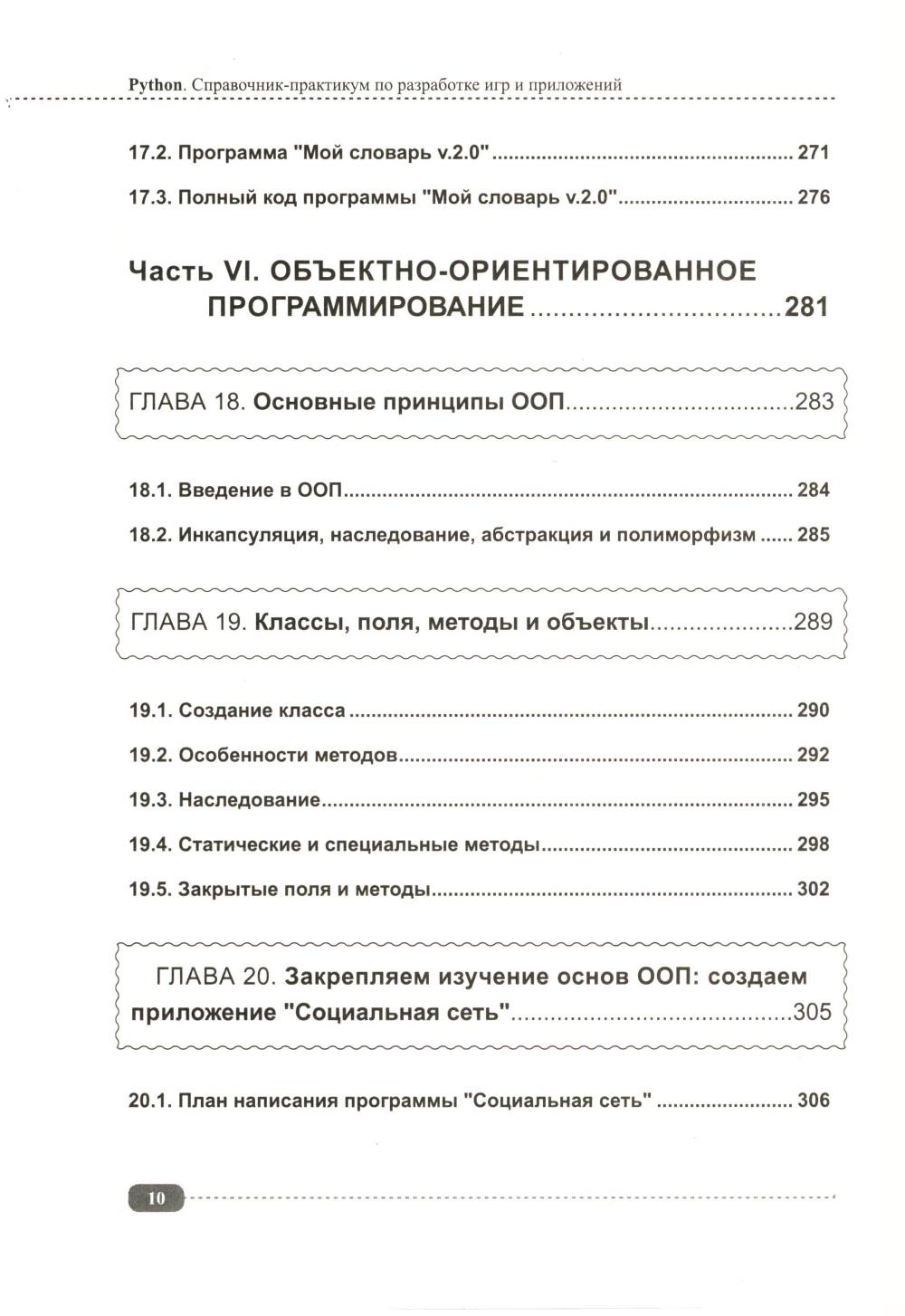 Данная книга будет полезна всем, кто интересуется Python: для начинающих она будет практическим руководством с примерами, а для более опытных программистов удобным справочником, позволяющим быстро находить нужную информацию под рукой. Упор в книге сделан на практику, которая подаётся в простой для понимания форме, а её сложность возрастает по мере продвижения: от основных концепций Python (среда IDLE, работа с файлами, переменные, типы данных, операторы, функции, циклы и т.д.) до более сложных и многогранных аспектов (объектно-ориентированное программирование (ООП), библиотека pygame, создание графических интерфейсов, работа с tkinter и т.д.). В каждом разделе для закрепления информации рассмотрено создание различных развивающих игр и программ с пошаговым разбором кода, а также имеются задания для самостоятельного выполнения, которые помогут развить логическое мышление и навыки написания своего собственного кода. К книге прилагается виртуальный диск с играми и программами, рассмотренными в книге, это позволит Вам наглядно попрактиковаться в создании собственных игр и приложений на Python.| Издательство | Наука и техника |