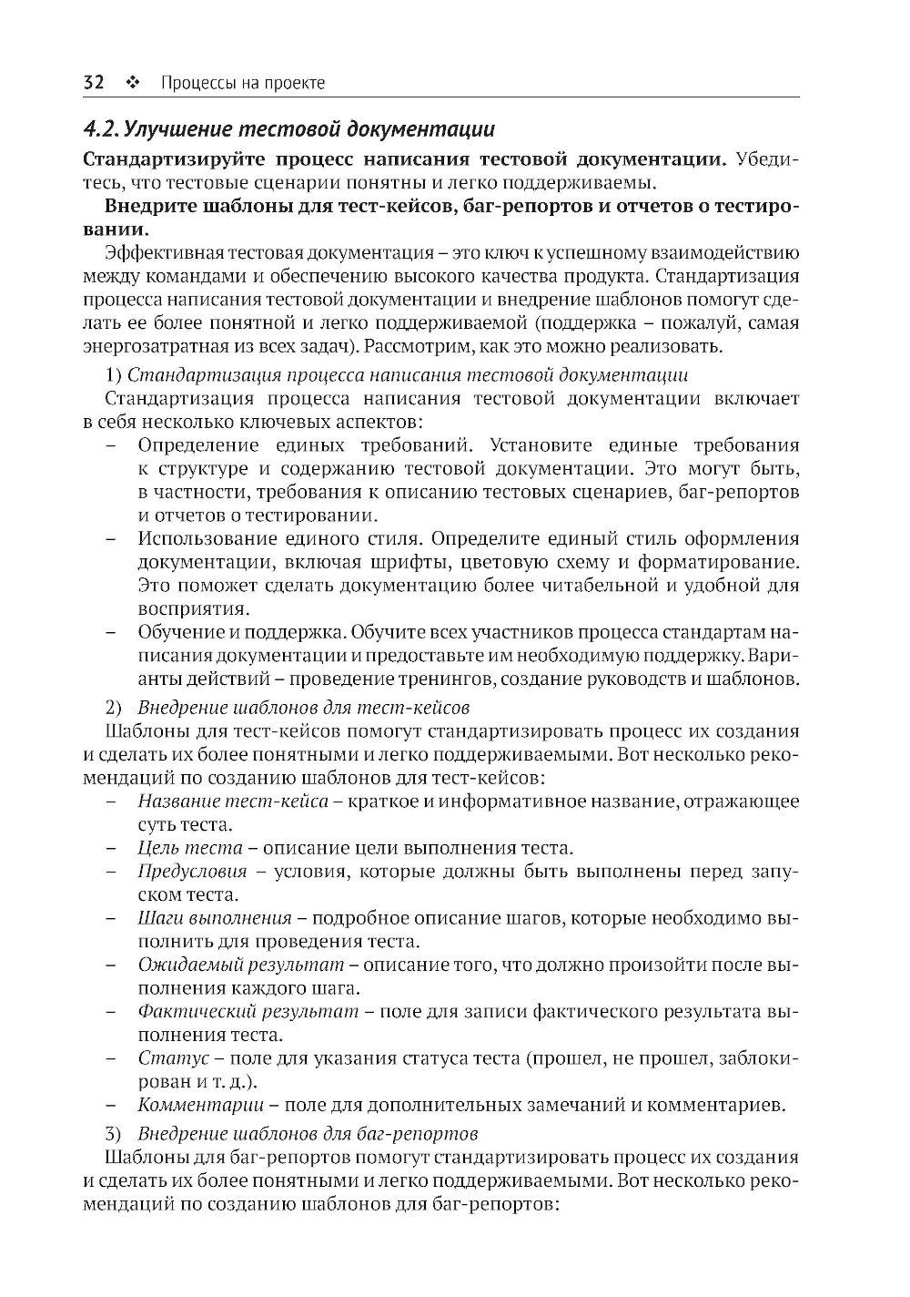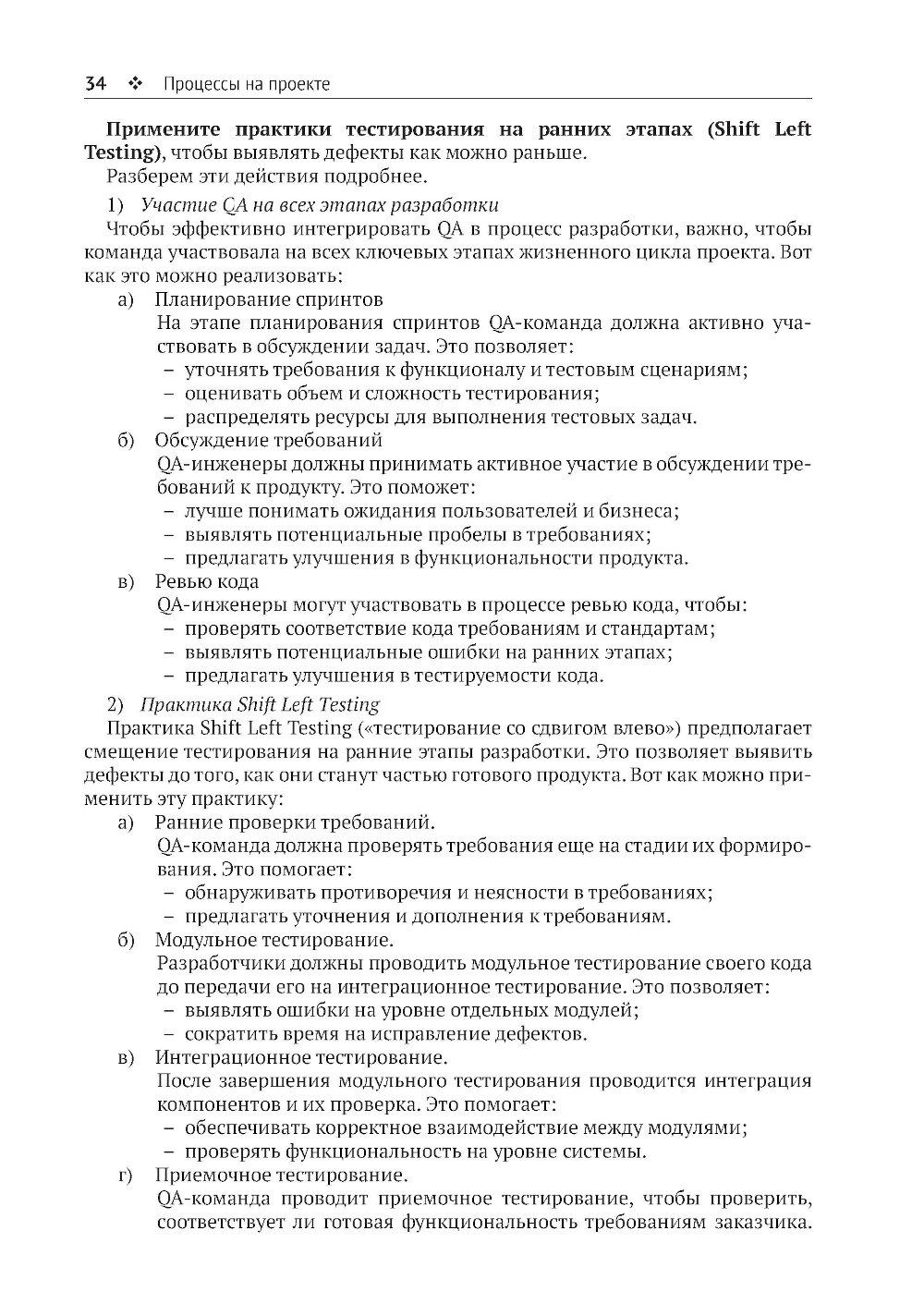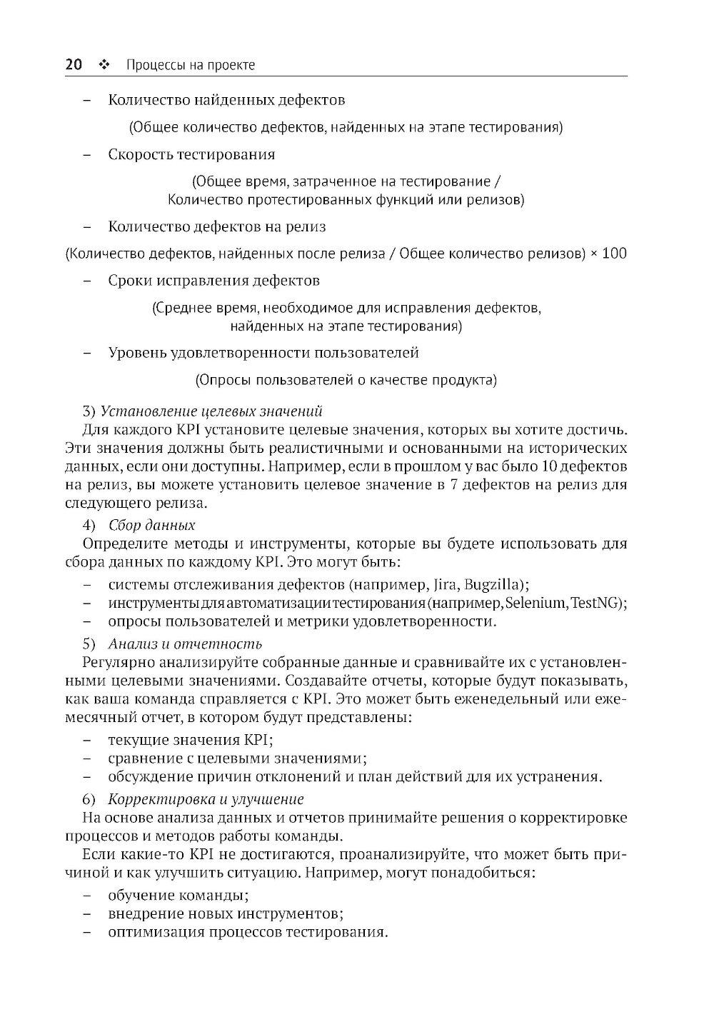 Книга освещает вопросы тестирования и формирование ключевых компетенций специалистов в области QA (Quality Assurance - обеспечения качества). В первой части рассматриваются фундаментальные понятия и процессы, связанные с тестированием, включая жизненный цикл разработки ПО, планирование тестов и создание тестовой документации. Вторая часть раскрывает секреты автоматизации тестирования, в том числе с помощью популярных инструментов. В третьей части исследуются нестандартные подходы и решения, которые помогут выйти за рамки традиционных методов тестирования. Среди рассматриваемых тем: - уровни квалификации специалистов по тестированию; - процессы на проекте; - артефакты тестирования; - среда разработки; - архитектура проекта; - как успешно пройти собеседование. Издание будет полезно как начинающим, так и опытным специалистам по QA, а также студентам, осваивающим IT-направления, и преподавателям технических вузов.| Издательство | ДМК Пресс |