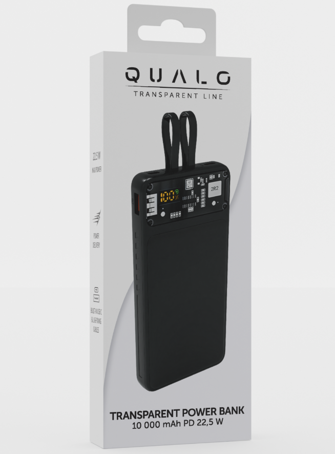 Power bank Qualo с прозрачным дизайном и LED-дисплеем для удобного контроля уровня заряда. Мощный аккумулятор емкостью 10000 мАч обеспечивает несколько полных зарядок вашего смартфона или других USB-устройств. Поддерживает быструю зарядку с Power Delivery (PD) до 23 Вт.
