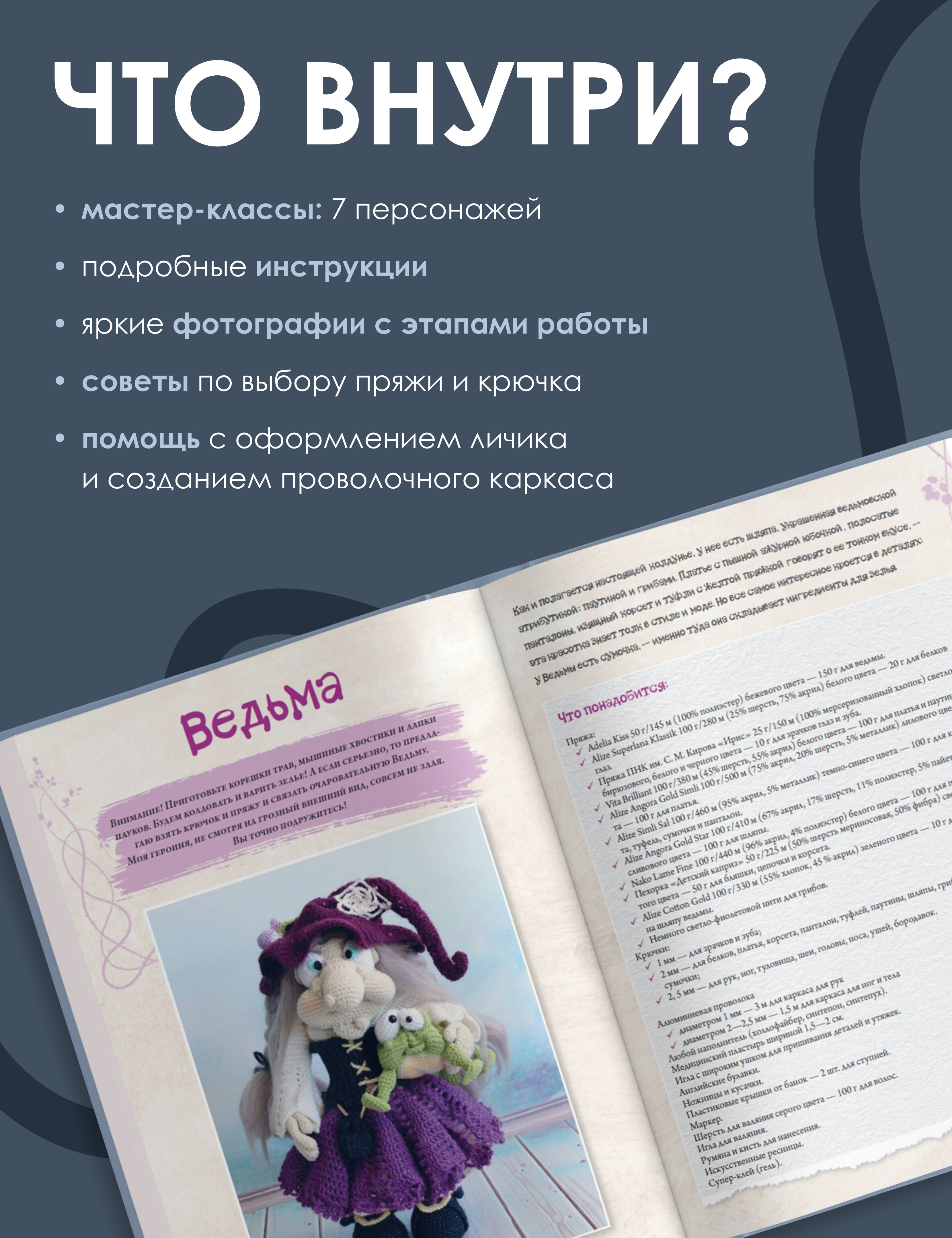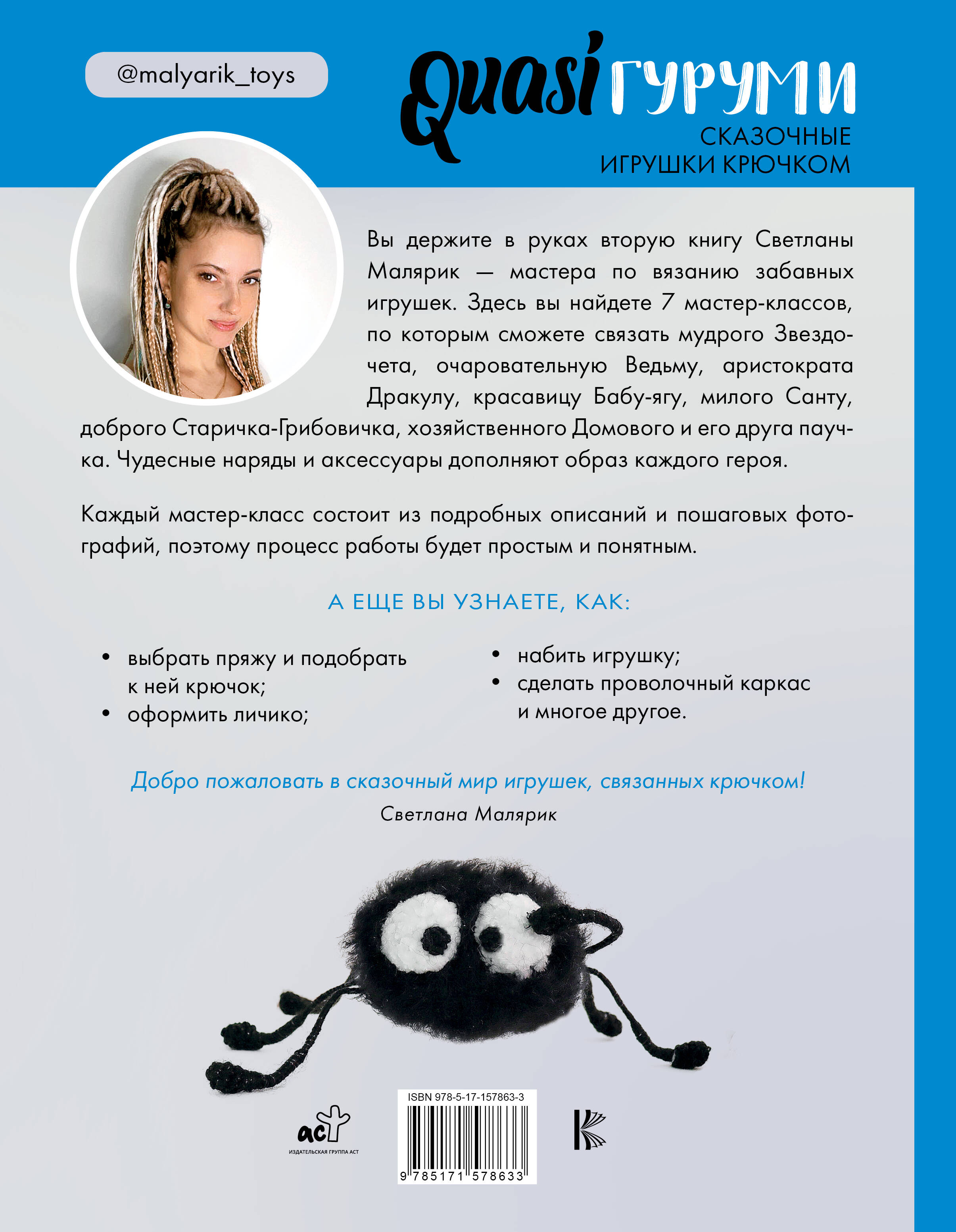 Светлана Малярик - мастер по вязанию забавных игрушек, и это ее вторая книга. Здесь вы найдете 7 мастер-классов, по которым сможете связать мудрого Звездочета, очаровательную Ведьму, аристократа Дракулу, красавицу Бабу-ягу, милого Санту, доброго Старичка-Грибовичка, хозяйственного Домового и его друга паучка. Чудесные наряды и аксессуары дополняют образ каждого героя. Все мастер-классы состоят из подробных описаний и пошаговых фотографий, процесс работы будет простым и понятным. А еще вы узнаете, как выбрать пряжу и подобрать к ней крючок, оформить личико, набить игрушку, сделать проволочный каркас и многое другое.
