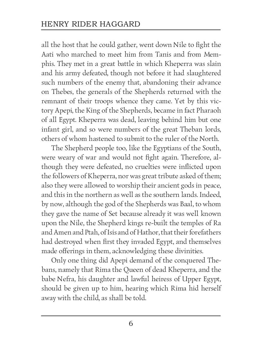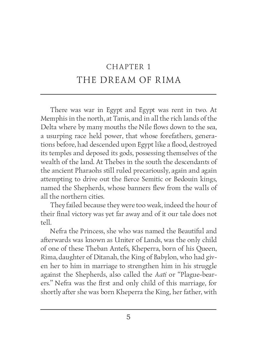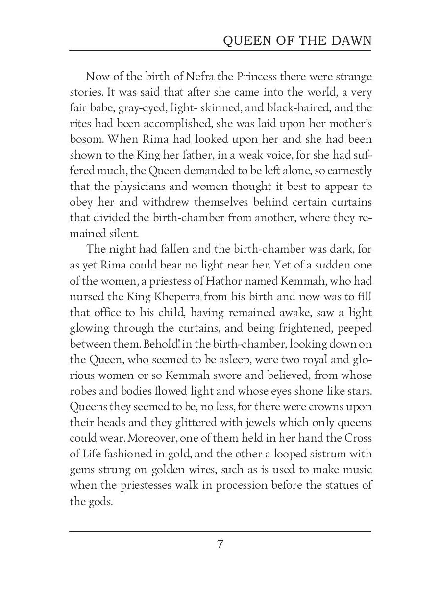 Sir Henry Rider Haggard was an English writer of adventure novels set mostly in Africa, and a founder of the Lost World literary genre. Queen of the Dawn is set in Egypt one thousand eight hundred years before the time of Christ in the time of the Shepherd King Apepi. It opens at an almost breakneck pace, with Pharaoh deposed and killed, his wife and child in hiding, and the goddesses stirring. A secret religious order raises the Pharaoh's daughter, and she meets and falls in love with the usurper's disguised son.