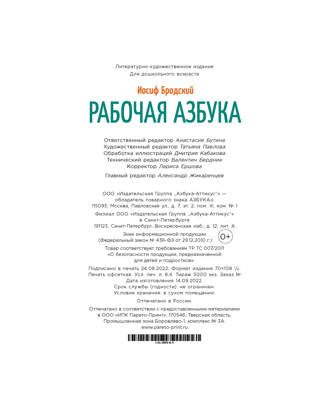 «Рабочая азбука» - одно из немногочисленных детских стихотворений Иосифа Бродского, стихотворение-игра, благодаря которому маленькие дети смогут познакомиться c алфавитом, а те, кто постарше, - поупражняться во внимательности. Иллюстрации к этой книге сделал Игорь Олейников - художник и мультипликатор, лауреат Болонской книжной выставки.| Издательство | Азбука |