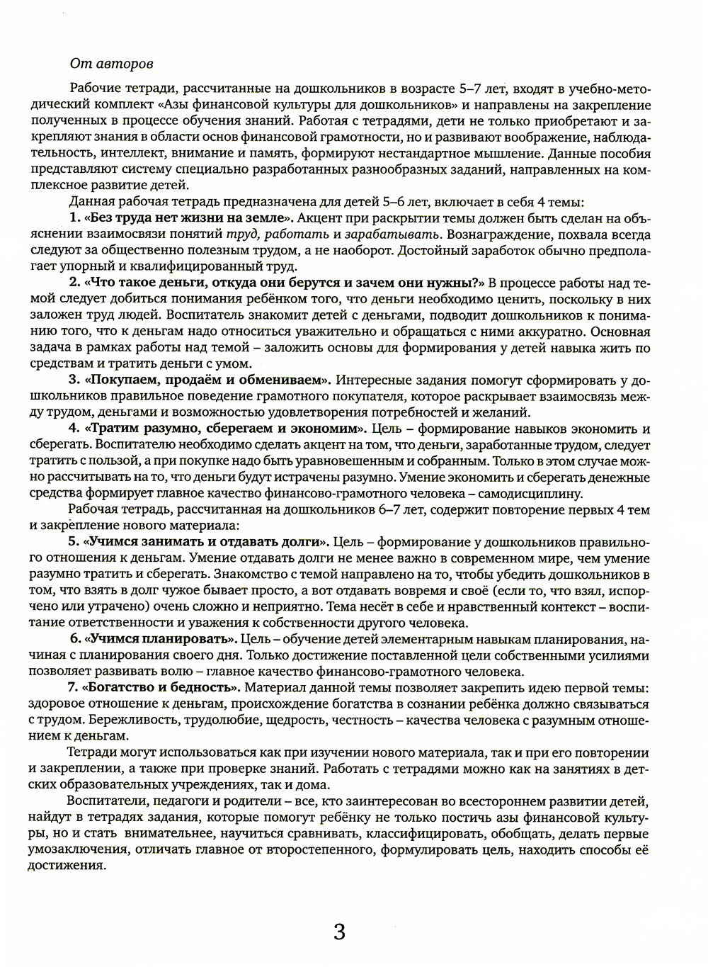 Рабочая тетрадь, рассчитанная на дошкольников в возрасте 5-6 лет, входит в учебно-методический комплект «Азы финансовой культуры для дошкольников», способствует закреплению полученных в процессе обучения знаний. Тетрадь содержит 29 заданий по 4 темам программы. К каждому занятию предлагаются задания, позволяющие в игровой форме усвоить, что труд - основа жизни; что такое деньги, откуда они берутся и зачем нужны; разобраться, что выгодно и невыгодно; понять, что такое потребности и желания и др. Работая с тетрадью, дети не только приобретают и закрепляют знания в области основ финансовой грамотности, но и развивают воображение, наблюдательность, интеллект, внимание и память, у них формируется нестандартное мышление. Данное пособие представляет систему специально разработанных разнообразных заданий, направленных на комплексное развитие детей, и может быть использовано как воспитателями в детских дошкольных учреждениях, так и родителями, самостоятельно занимающимися с детьми.