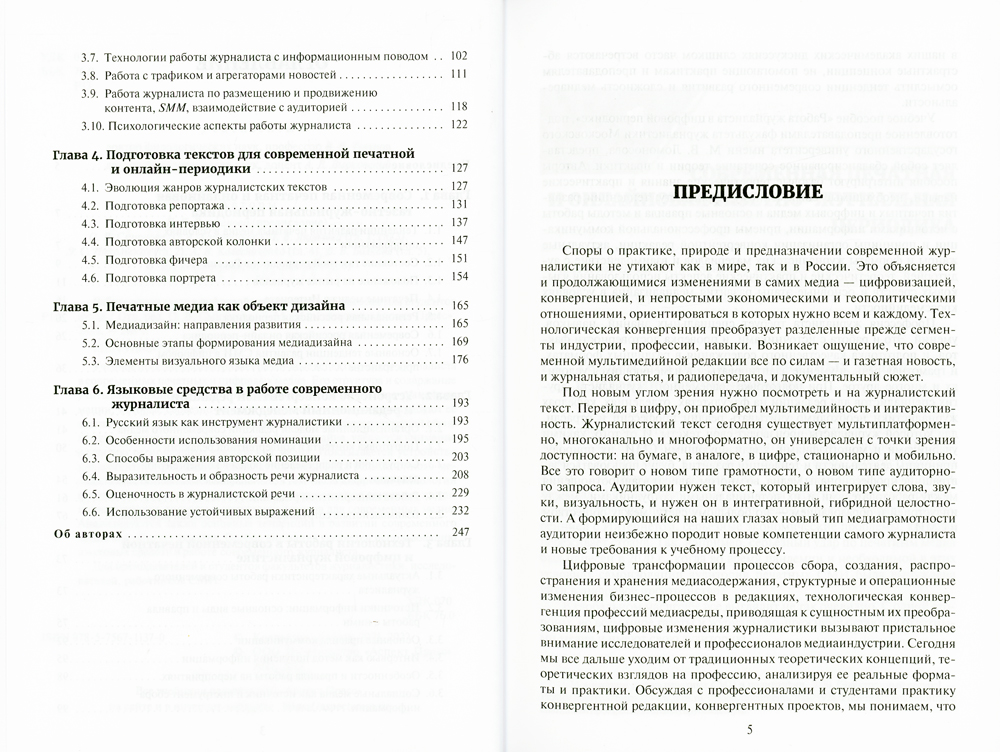 Учебное пособие рассматривает различные аспекты работы журналиста в современных печатных и цифровых медиа. Его структура и содержание учитывают происходящие в медиапространстве цифровые трансформации, которые серьезно меняют профессию журналиста и требуют ее адаптации к новым условиям. В учебном пособии дается широкий обзор газетно-журнальной периодики в печати и онлайне, уделяется внимание развитию региональных российских медиа. Показывается устройство конвергентной редакции и выявляется специфика редакционного менеджмента, описываются актуальные, в том числе цифровые технологии работы в современной журналистике, представляются основные жанры и практические подходы к подготовке текстов для современных медиа. Анализируются также основные тенденции в развитии современного медиа как объекта дизайна. Особое внимание уделяется использованию языковых средств в работе современного журналиста. Для преподавателей и студентов факультетов журналистики, исследователей, работников СМИ.