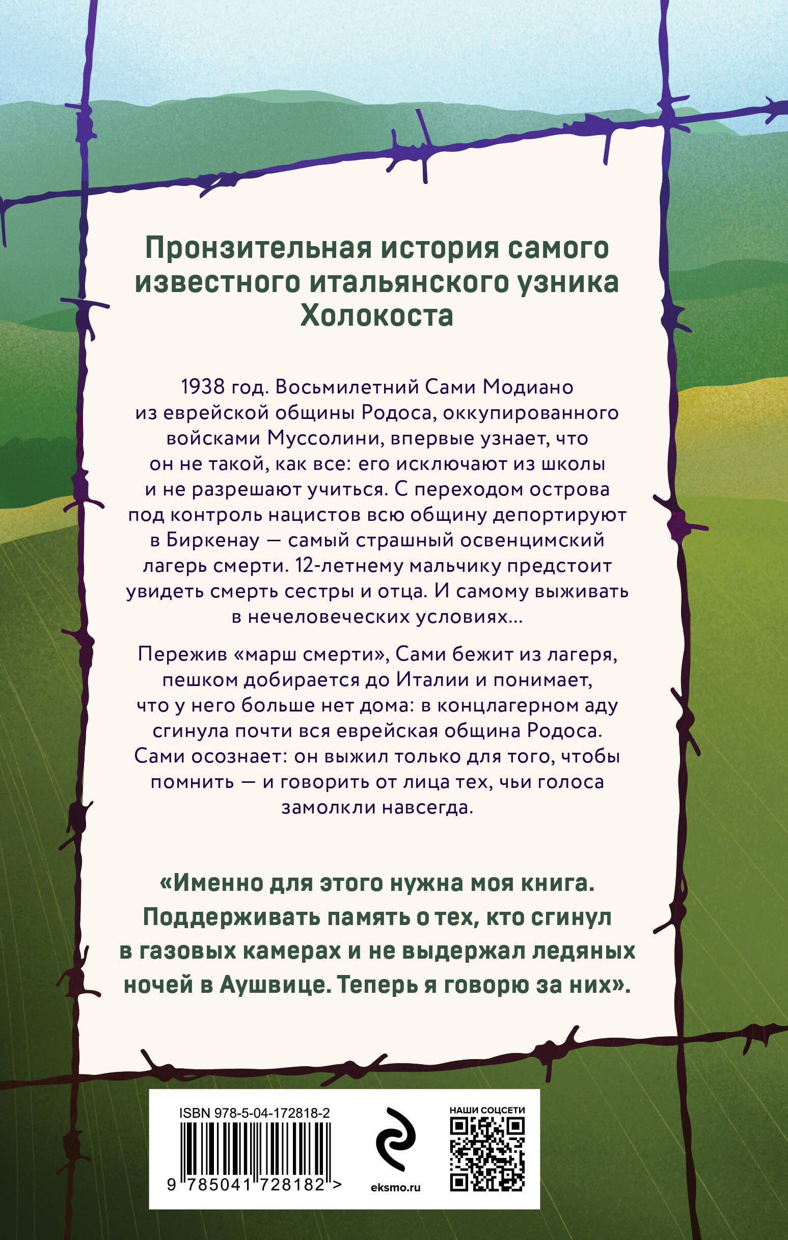 Пронзительная история самого известного итальянского узника Холокоста - об ужасах Аушвица, потере всей семьи и странствиях в поисках новой жизни 1938 год. Восьмилетний Сами Модиано из еврейской общины Родоса, оккупированного войсками Муссолини, впервые узнает, что он не такой, как все: его исключают из школы и больше не разрешают учиться. Через несколько лет остров переходит под контроль нацистов, и общину депортируют в Биркенау, самый страшный освенцимский лагерь смерти. Двенадцатилетнему мальчику предстоит пережить разлуку с сестрой и видеть медленное угасание отца. И самому выживать в нечеловеческих условиях... Пережив «марш смерти» и бежав из лагеря, Сами оказывается на линии фронта с советской армией. А затем пешком добирается до Италии - только чтобы осознать, что у него больше нет дома: в концлагерном аду сгинула почти вся еврейская община Родоса... Спустя годы скитаний и тяжелого труда он понимает: единственный способ примириться со своим прошлым - это помнить. И говорить от лица тех, чьи голоса замолкли навсегда. «Именно для этого нужна моя книга. Поддерживать память о тех, кто сгинул в газовых камерах и не выдержал ледяных ночей в Аушвице. Теперь я говорю за них». ------------------------------ «"В этот день я словно потерял невинность: утром проснулся еще ребенком, а спать лег уже евреем". Вот как Сами Модиано, переживший Холокост, вспоминает тот день, когда из-за расовых законов его выгнали из школы на Родосе. Это был только первый шаг к ужасу. Фактически Сами был одним из 2500 евреев общины Родоса, депортированных в Биркенау. И один из очень немногих выживших. "Почему я?" - задается он вопросом снова семьдесят лет спустя. Единственный ответ - чтобы рассказать. Чтобы не забыть». - Corriere de la Sera