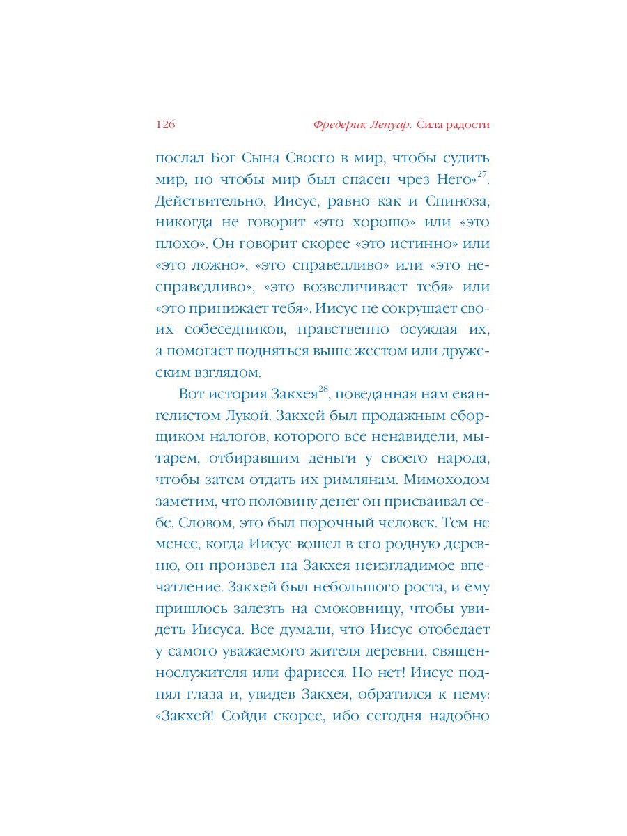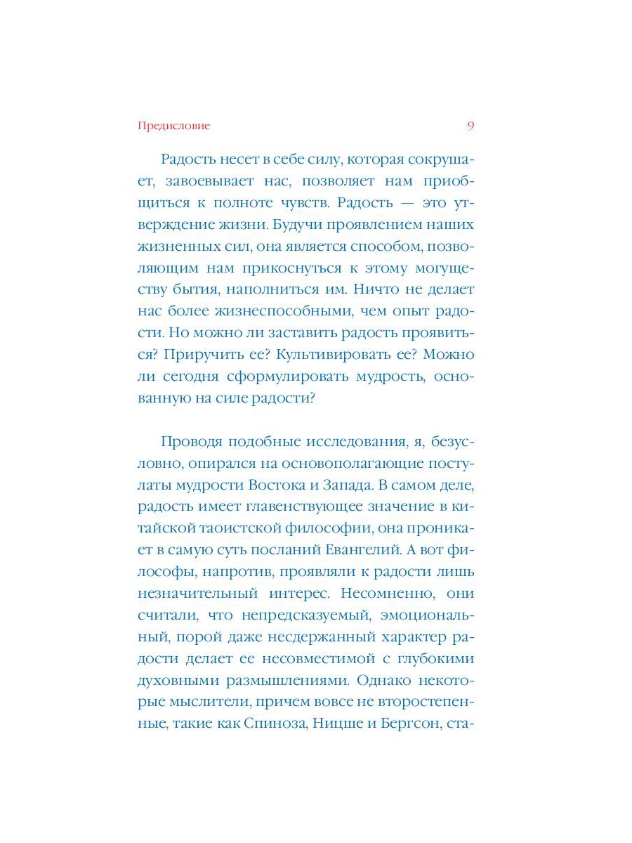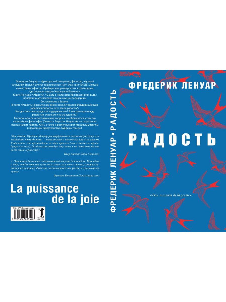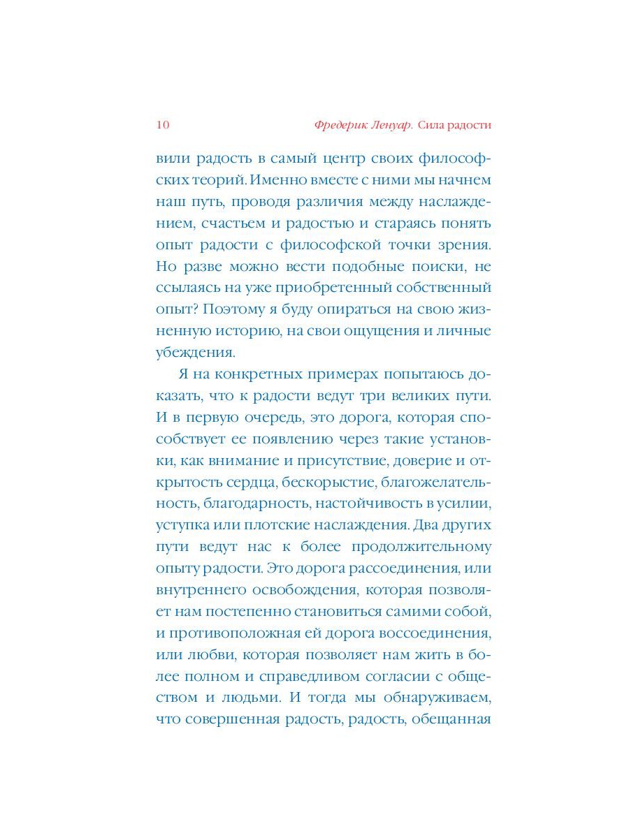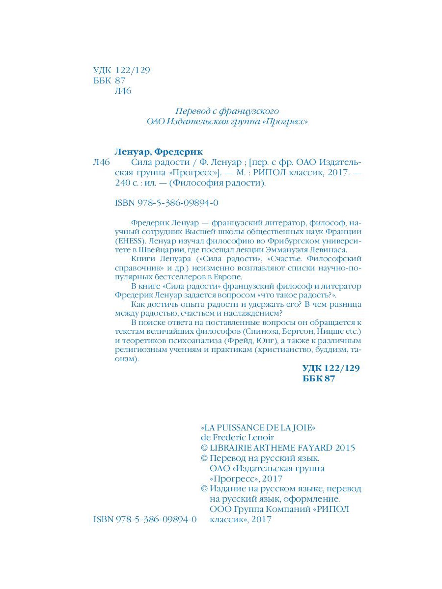 Фредерик Ленуар - французский литератор, философ, научный сотрудник Высшей школы общественных наук Франции (EHESS). Ленуар изучал философию во Фрибургском университете в Швейцарии, где посещал лекции Эммануэля Левинаса. Книги Ленуара («Радость», «Счастье. Философский справочник» и др.) неизменно возглавляют списки научно-популярных бестселлеров в Европе. В книге «Радость» французский философ и литератор Фредерик Ленуар задается вопросом «что такое радость?». Как достичь опыта радости и удержать его? В чем разница между радостью, счастьем и наслаждением? В поиске ответа на поставленные вопросы он обращается к текстам величайших философов (Спиноза, Бергсон, Ницше etc.) и теоретиков психоанализа (Фрейд, Юнг), а также к различным религиозным учениям и практикам (христианство, буддизм, таоизм).| Издательство | Рипол Классик |