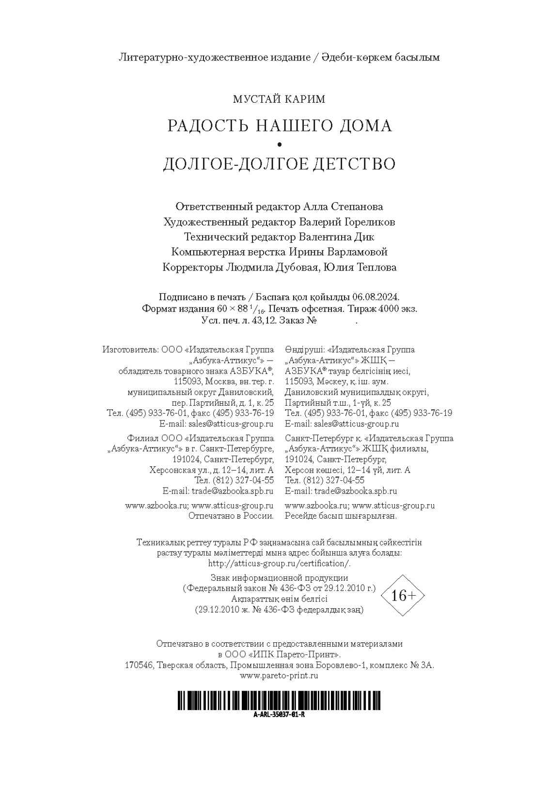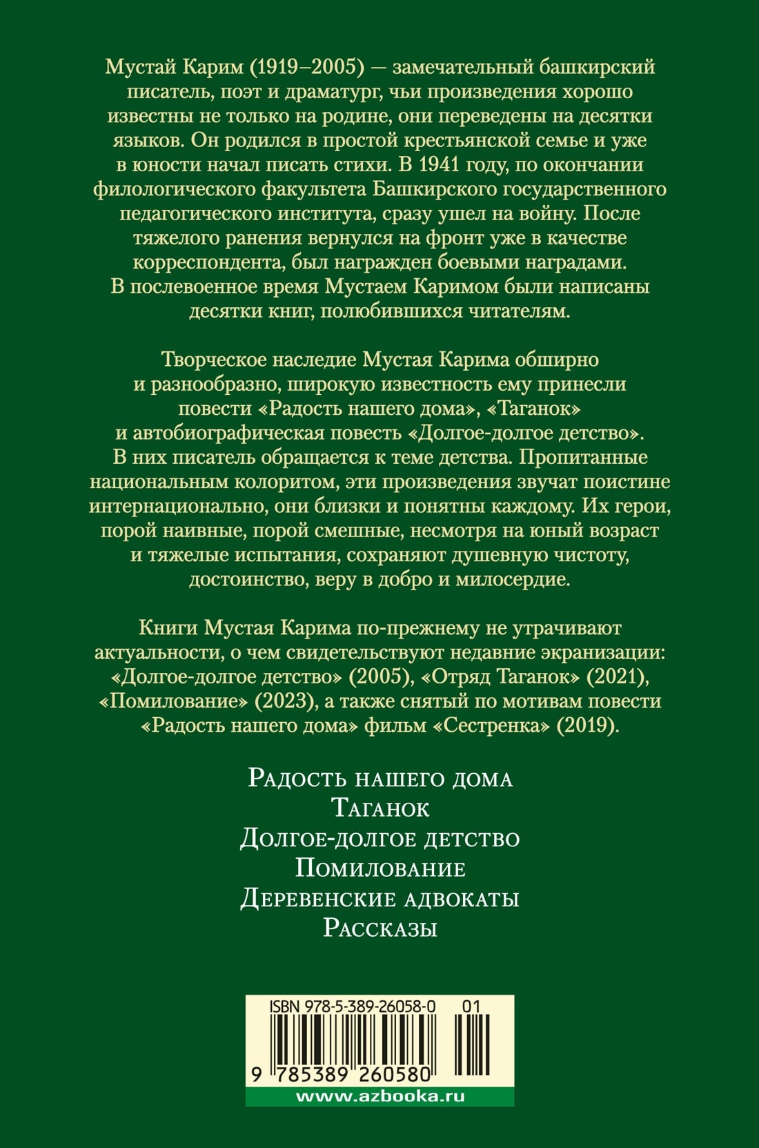 Мустай Карим (1919-2005) - замечательный башкирский писатель, поэт и драматург, чьи произведения хорошо известны не только на родине: они переведены на десятки языков. Творческое наследие Карима обширно и разнообразно, широкую известность ему принесли повести «Радость нашего дома», «Таганок» и автобиографическая повесть «Долгое-долгое детство». В них писатель обращается к теме детства. Пропитанные национальным колоритом, эти произведения звучат поистине интернационально, они близки и понятны каждому. Их герои, порой наивные, порой смешные, несмотря на юный возраст и тяжелые испытания, сохраняют душевную чистоту, достоинство, веру в добро и милосердие.| Издательство | Азбука |
