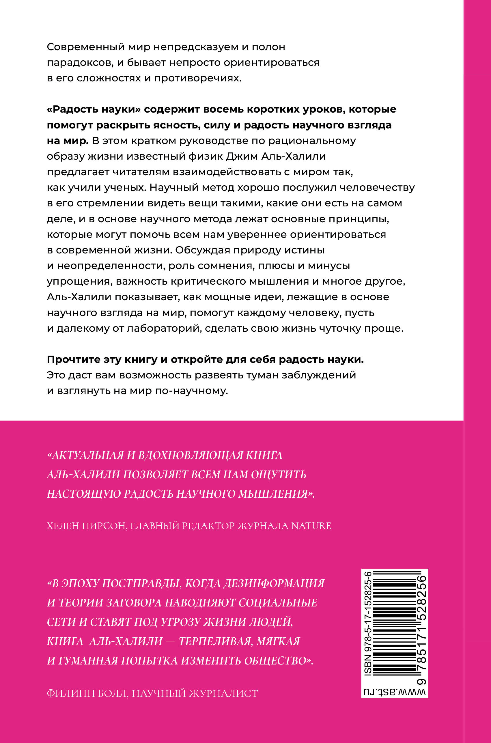 Современный мир непредсказуем и полон парадоксов, и бывает непросто ориентироваться в его сложностях и противоречиях. "Радость науки" содержит восемь коротких уроков, которые помогут раскрыть ясность, силу и радость научного взгляда на мир. В этом кратком руководстве по рациональному образу жизни известный физик Джим Аль-Халили предлагает читателям взаимодействовать с миром так, как учили ученых. Научный метод хорошо послужил человечеству в его стремлении видеть вещи такими, какие они есть на самом деле, и в основе научного метода лежат основные принципы, которые могут помочь всем нам увереннее ориентироваться в современной жизни. Обсуждая природу истины и неопределенности, роль сомнения, плюсы и минусы упрощения, важность критического мышления и многое другое, Аль-Халили показывает, как мощные идеи, лежащие в основе научного взгляда на мир, помогут каждому человеку, пусть и далекому от лабораторий, сделать свою жизнь чуточку проще. Прочтите эту книгу и откройте для себя радость науки. Это даст вам возможность развеять туман заблуждений и взглянуть на мир по-научному.| Издательство | ИЗДАТЕЛЬСТВО "АСТ" |
