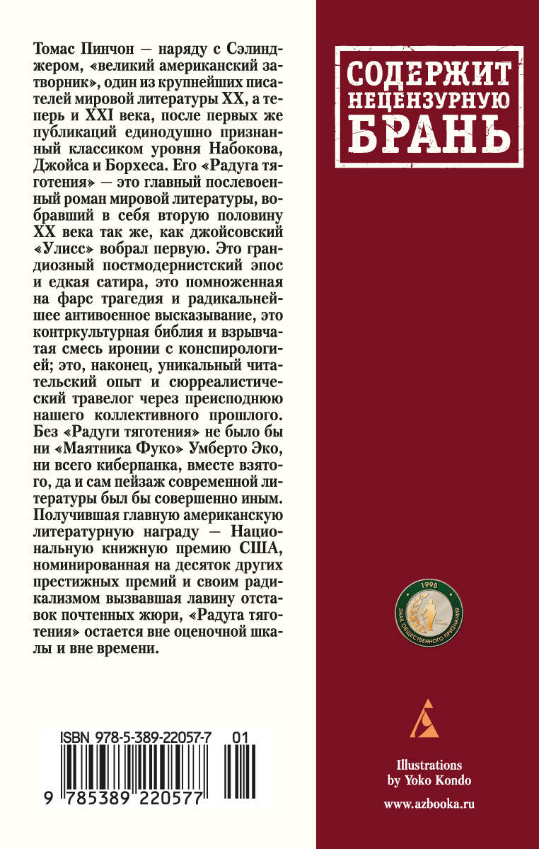 Томас Пинчон - наряду с Сэлинджером, "великий американский затворник", один из крупнейших писателей мировой литературы XX, а теперь и XXI века, после первых же публикаций единодушно признанный классиком уровня Набокова, Джойса и Борхеса. Его "Радуга тяготения" - это главный послевоенный роман мировой литературы, вобравший в себя вторую половину XX века так же, как джойсовский "Улисс" вобрал первую. Это грандиозный постмодернистский эпос и едкая сатира, это помноженная на фарс трагедия и радикальнейшее антивоенное высказывание, это контркультурная библия и взрывчатая смесь иронии с конспирологией; это, наконец, уникальный читательский опыт и сюрреалистический травелог через преисподнюю нашего коллективного прошлого. Без "Радуги тяготения" не было бы ни "Маятника Фуко" Умберто Эко, ни всего киберпанка, вместе взятого, да и сам пейзаж современной литературы был бы совершенно иным. Вот уже почти полвека в этой книге что ни день, то открывают новые смыслы, но единственное правильное прочтение так и остается, к счастью, недостижимым. Получившая главную американскую литературную награду - Национальную книжную премию США, номинированная на десяток других престижных премий и своим радикализмом вызвавшая лавину отставок почтенных жюри, "Радуга тяготения" остается вне оценочной шкалы и вне времени.| Издательство | Азбука-Аттикус Издат.группа ООО |