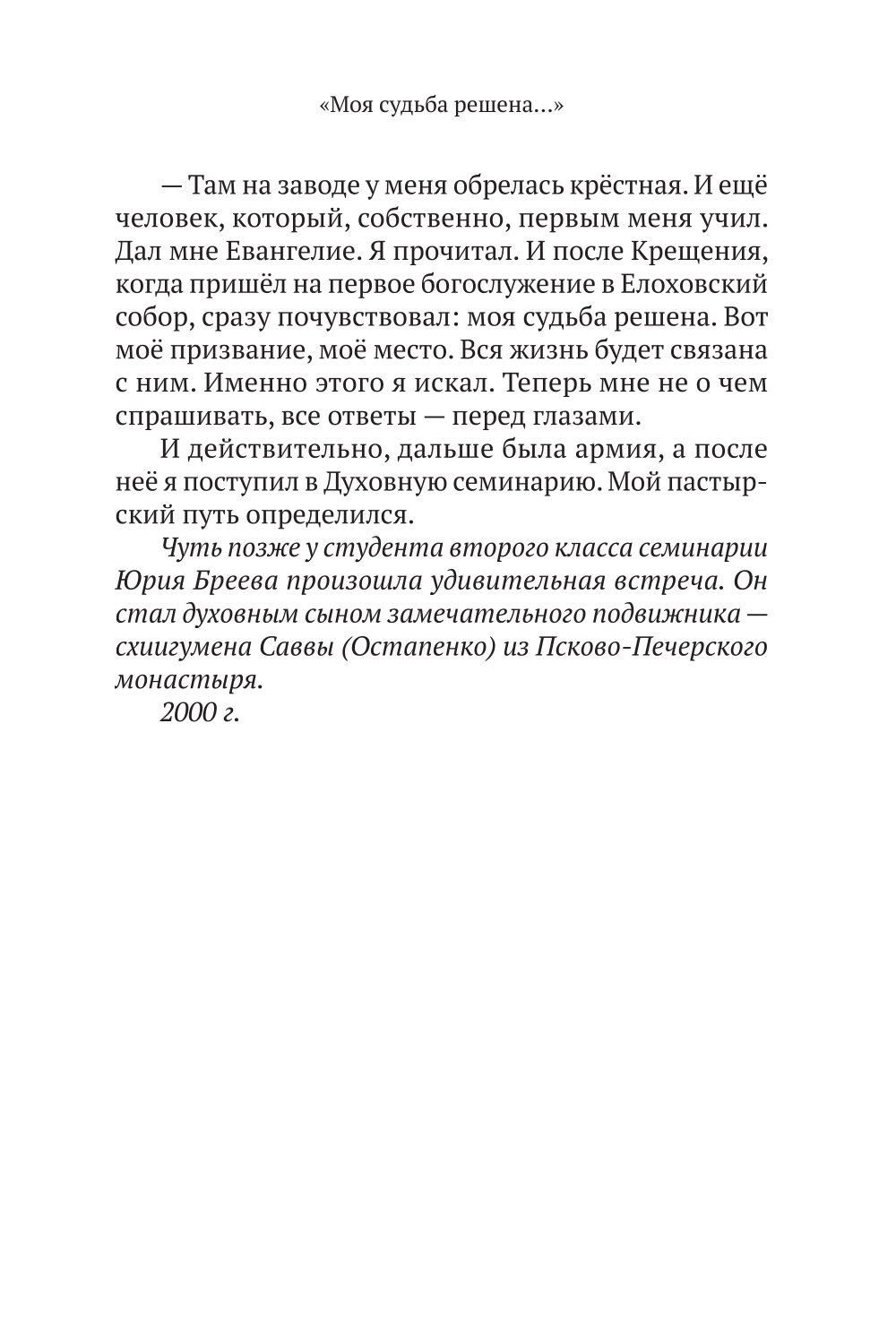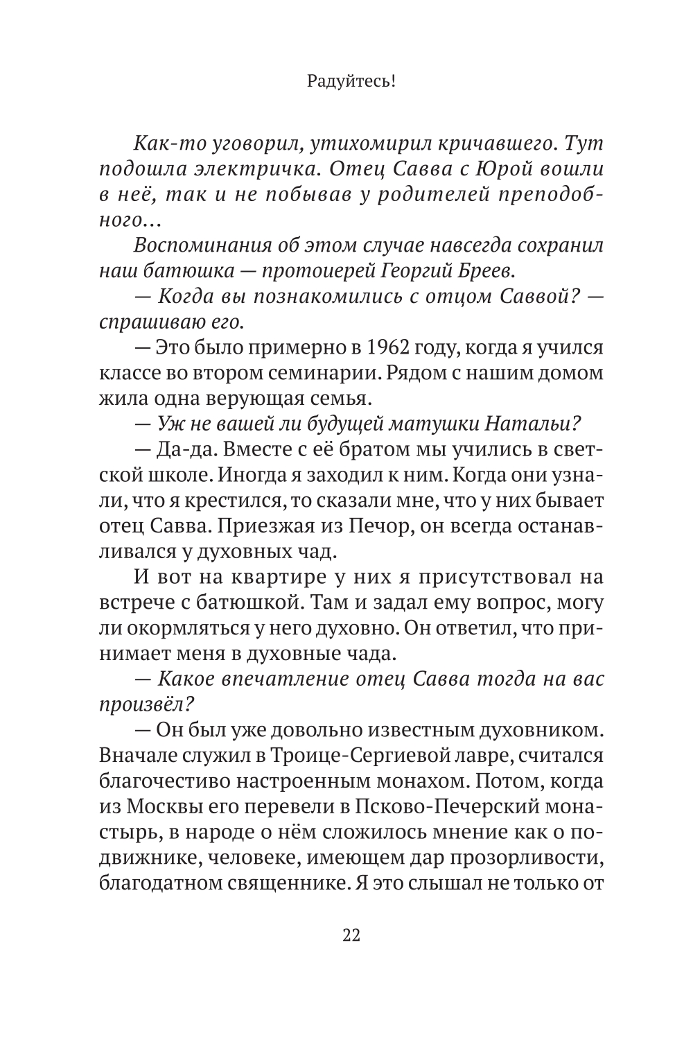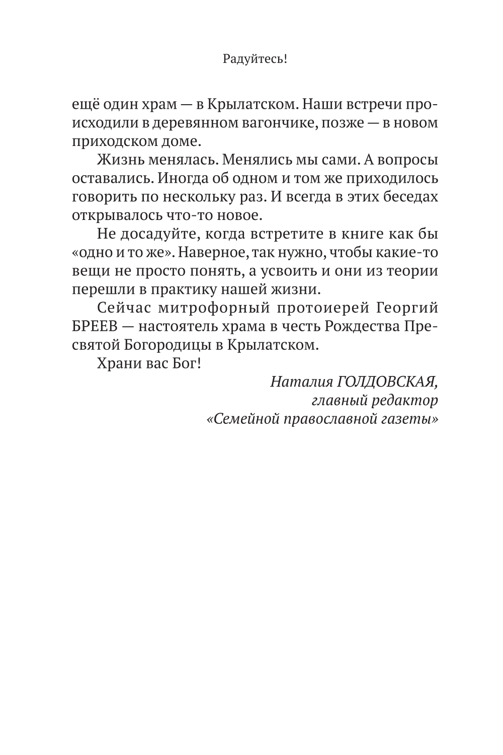 Большое счастье - встретить в жизни опытного духовника. Такая возможность есть у читателей этой книги. В неё вошли беседы-интервью настоятеля храма Рождества Пресвятой Богородицы в Крылатском, протоиерея Георгия Бреева, одного из самых уважаемых и любимых батюшек в Москве. Их записала и собрала известная журналист Наталия Голдовская. Священник рассказывает о христианских праздниках (а они открывают нам вечность), радостях и трудностях человеческого бытия, решении «неразрешимых» проблем, о Церкви и людях.| Издательство | Изд. НИКЕЯ |