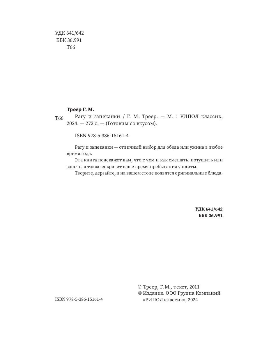 Рагу и запеканки - отличный выбор для обеда или ужина в любое время года. Эта книга подскажет вам, что с чем и как смешать, потушить или запечь, а также сократит ваше время пребывания у плиты. Творите, дерзайте, и на вашем столе появятся оригинальные блюда.| Издательство | Рипол Классик |