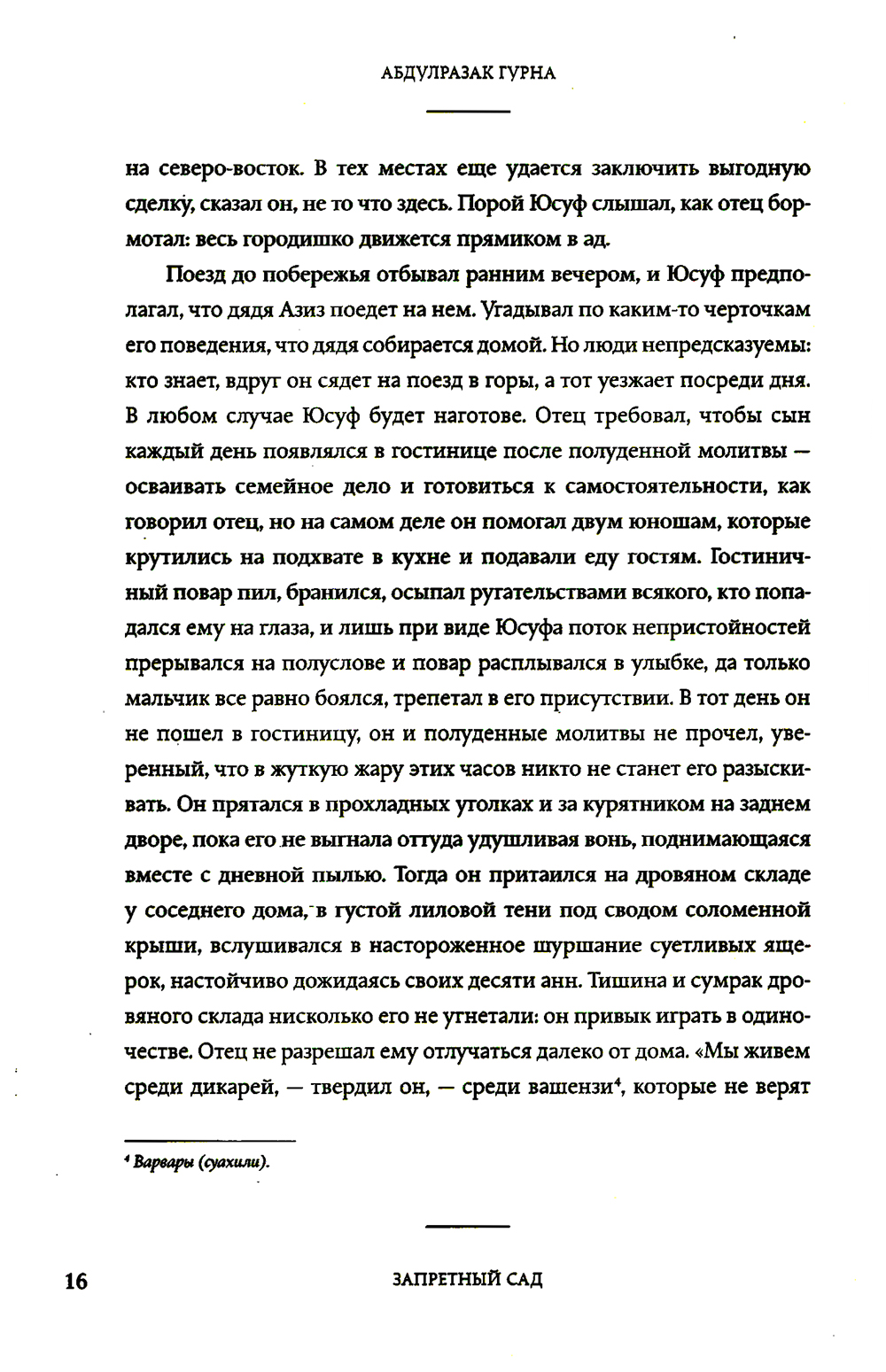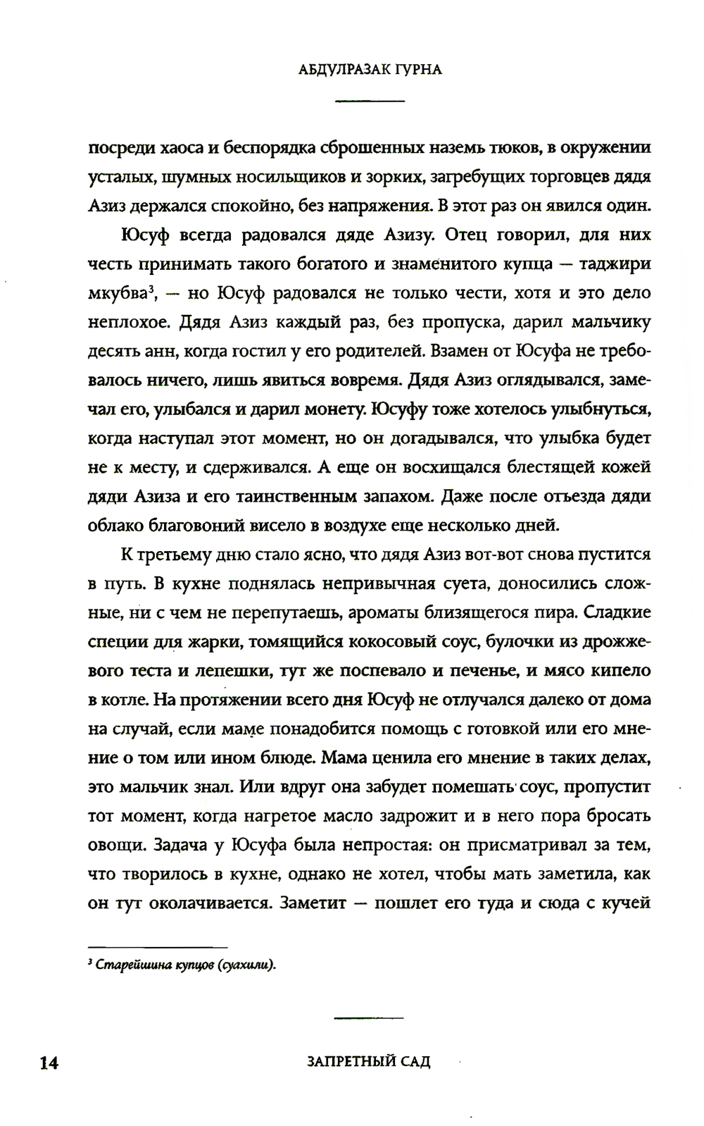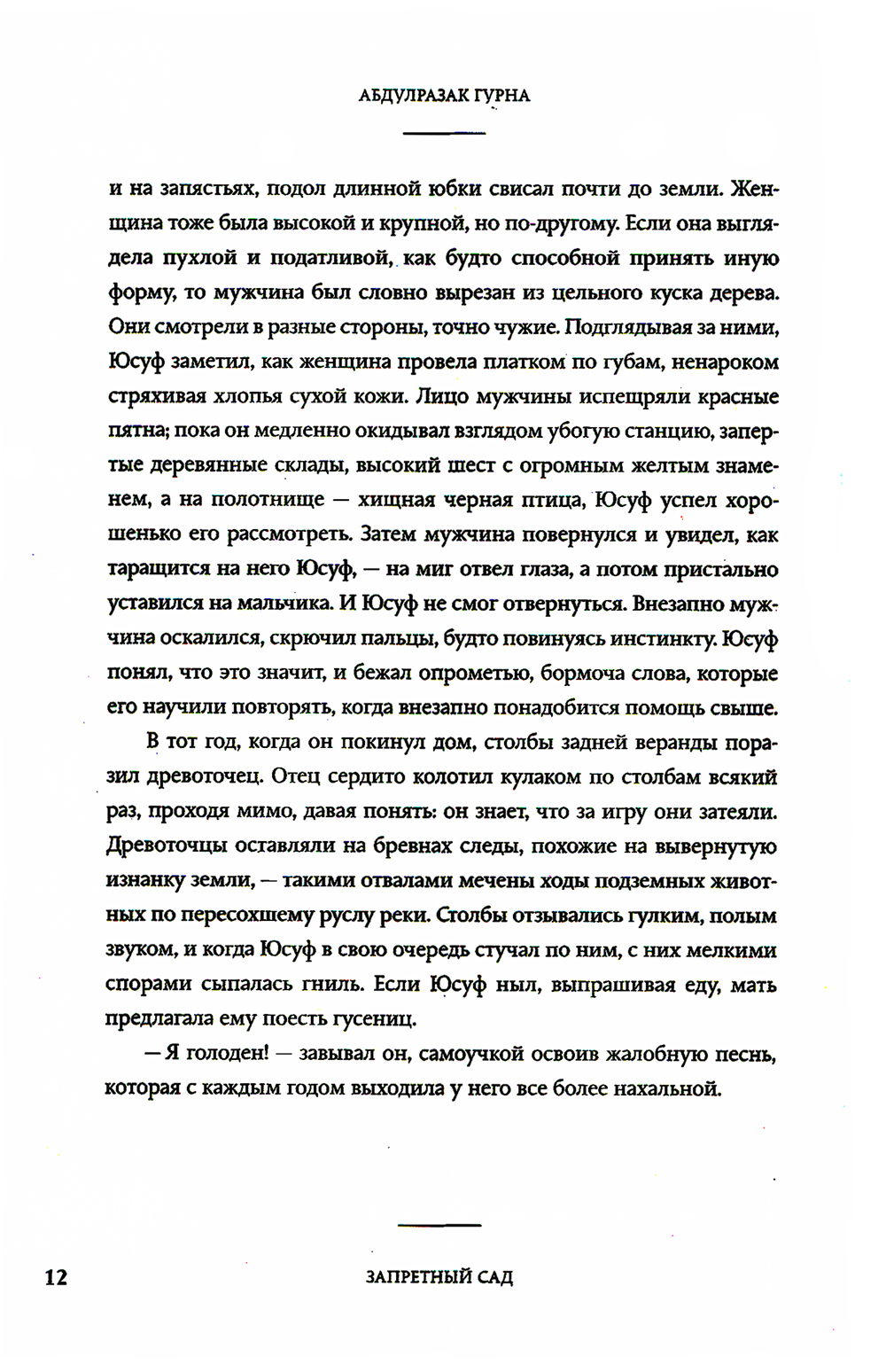 Действие романа разворачивается в колониальной Африке в то время, когда английские захватчики вытесняют туземцев с их земли, а немцы планируют строительство железной дороги через весь континент. Отец Юсуфа продает сына в рабство в уплату долгов. Сначала Юсуф попадает в лавку новоиспеченного хозяина, а после отправляется в путешествие по стране вместе с торговым караваном. Крах прежнего мира, межплеменные войны, суеверия, вопросы рабства и внутренней свободы глазами мальчика вкупе с проблемами взросления и запретной любви подсвечивают читателю плотное полотно, в которое Африка кутает свою красоту и жестокость. Абдулразак Гурна - нобелевский лауреат по литературе 2021 года, английский писатель танзанийского происхождения. Роман «Рай» издается на русском языке впервые.| Издательство | Строки |