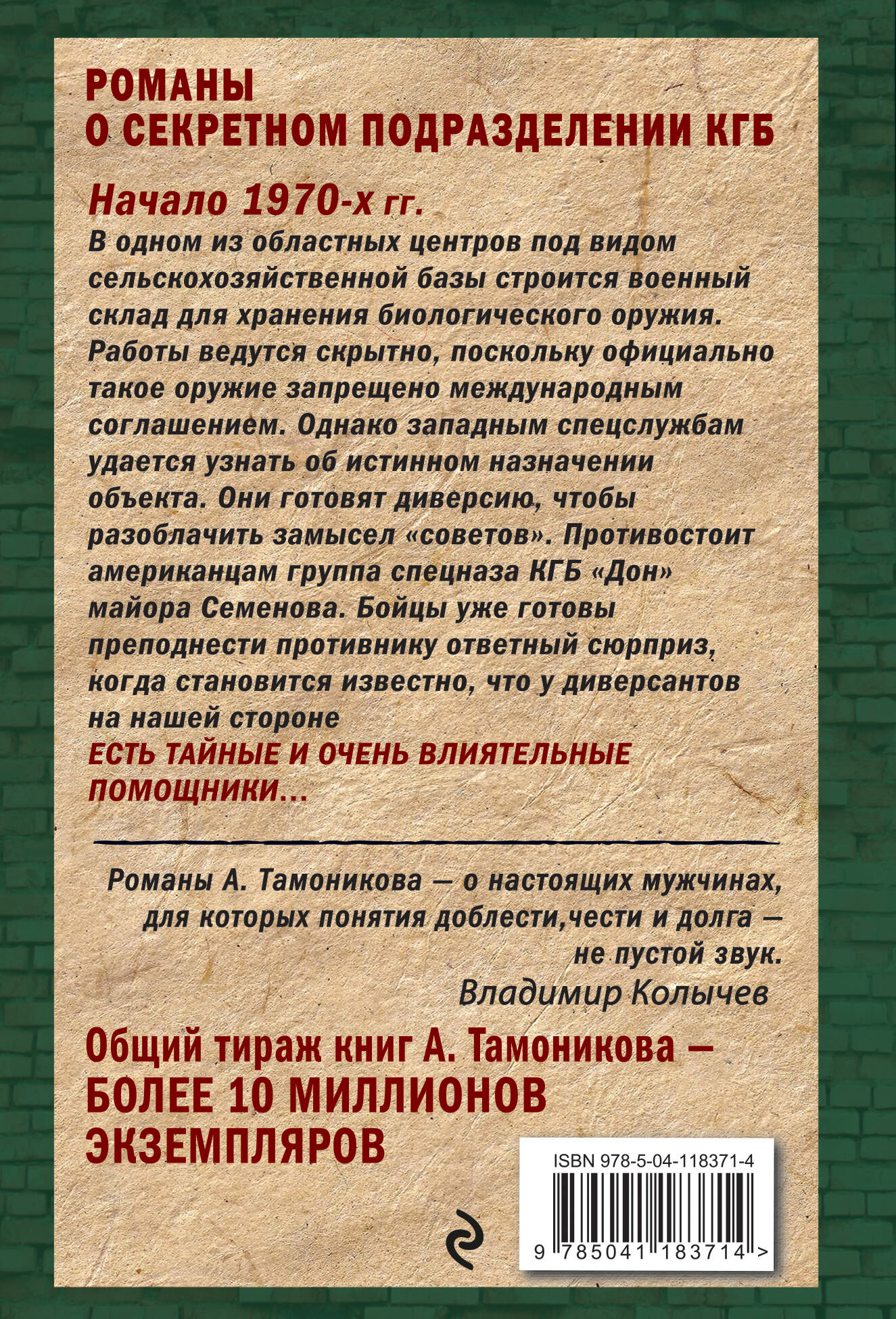Романы о секретном подразделении КГБ. Общий тираж книг А. Тамоникова - более 10 миллионов экземпляров. Начало 1970-х годов. В одном из областных центров под видом сельскохозяйственной базы строится военный склад для хранения биологического оружия. Работы ведутся скрытно, поскольку официально такое оружие запрещено международным соглашением. Однако западным спецслужбам удается узнать об истинном назначении объекта. Они готовят диверсию, чтобы разоблачить замысел «Советов». Противостоит американцам группа спецназа КГБ «Дон» майора Семенова. Бойцы уже готовы преподнести противнику ответный сюрприз, когда становится известно, что у диверсантов на нашей стороне есть тайные и очень влиятельные помощники…| Издательство | ООО "Издательство "Эксмо" |