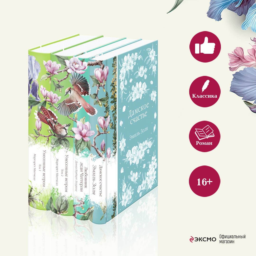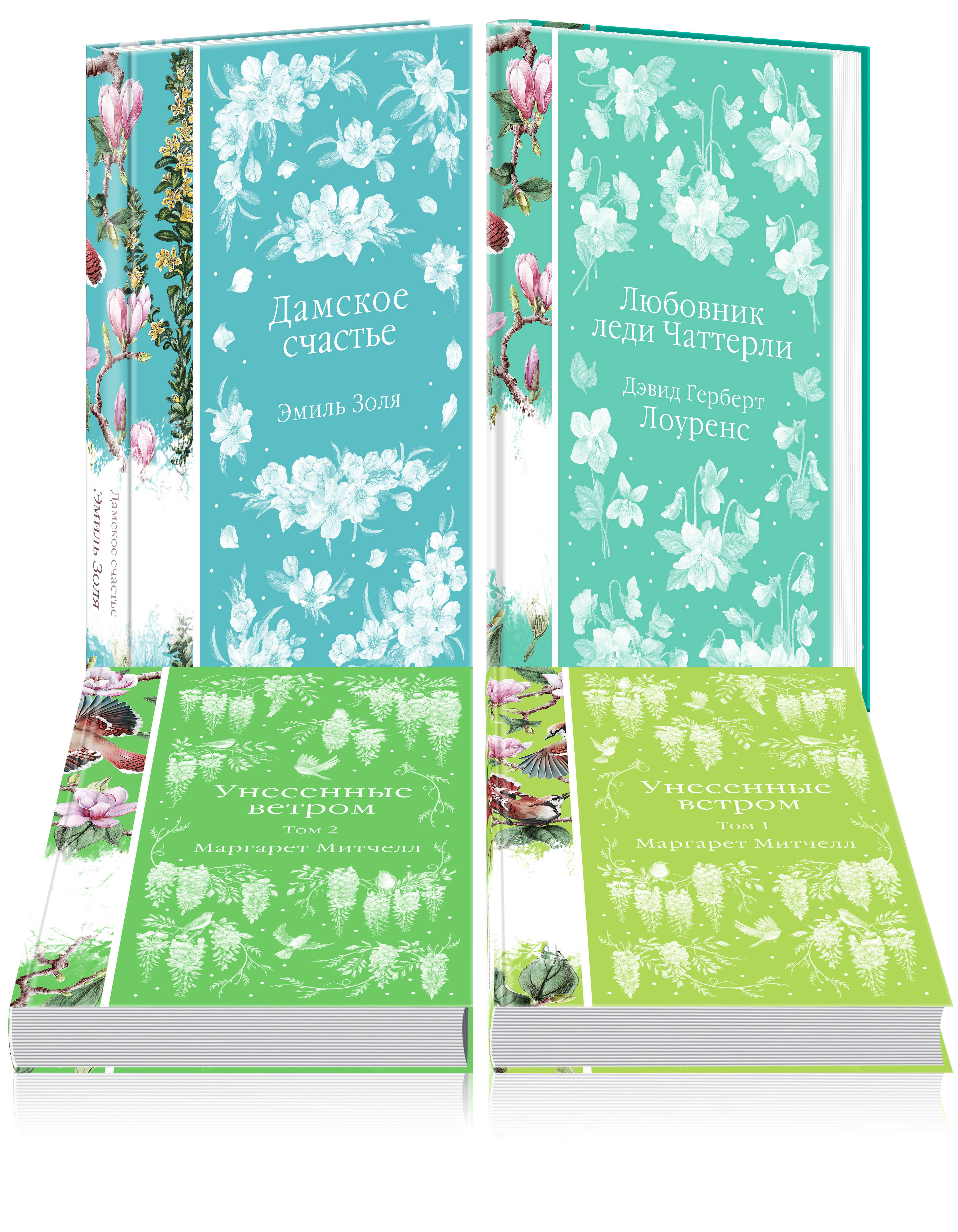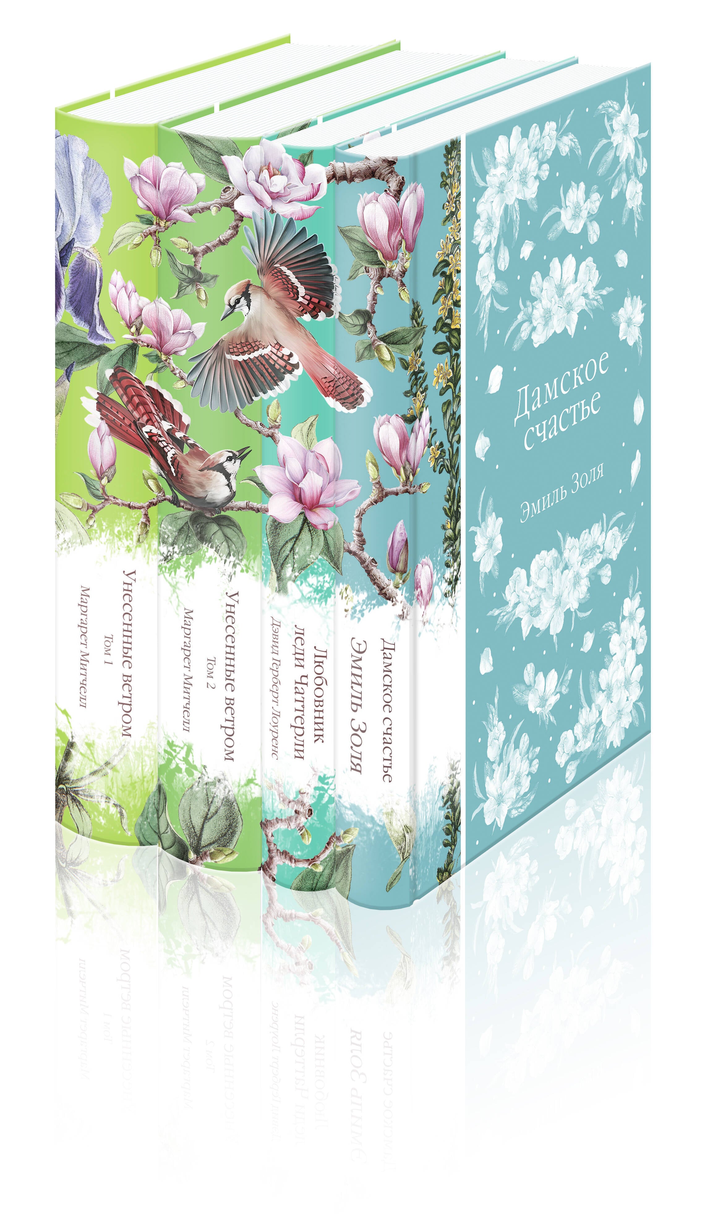 В комплект вошли «Унесенные ветром. Том 1» и «Унесенные ветром. Том 2», «Любовник леди Чаттерли», «Дамское счастье» - четыре классических женских романа, которые приятно читать и приятно дарить. Элегантная классика - утонченность, внимание к деталям, приятные цвета и тактильные материалы, безупречность стиля, внутри макет с иллюстрациями. Всю серию объединяет общая картинка на корешке, а в этом комплекте особая капсула в серии, на корешках добавляется анималистика - две птицы, летящие друг к другу.