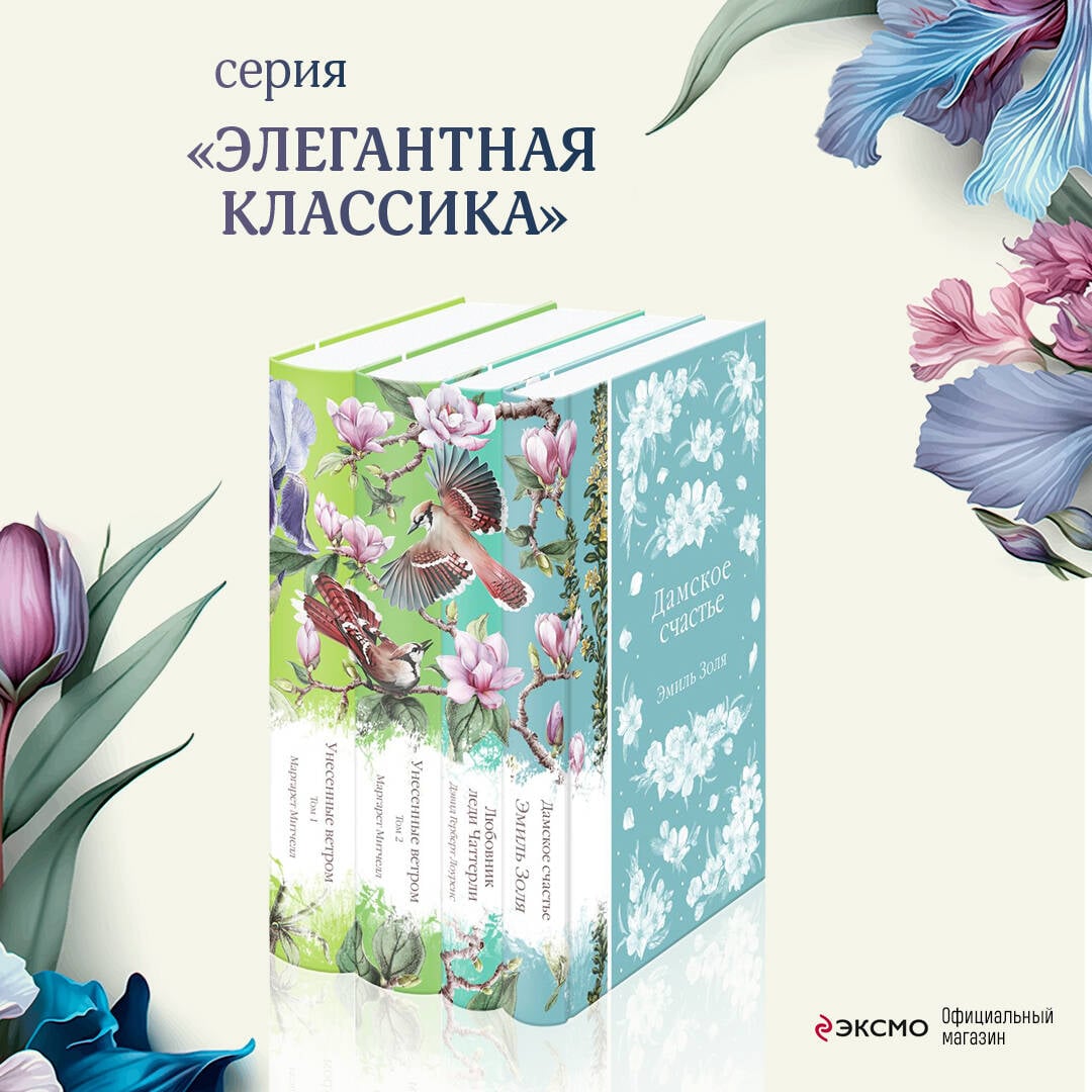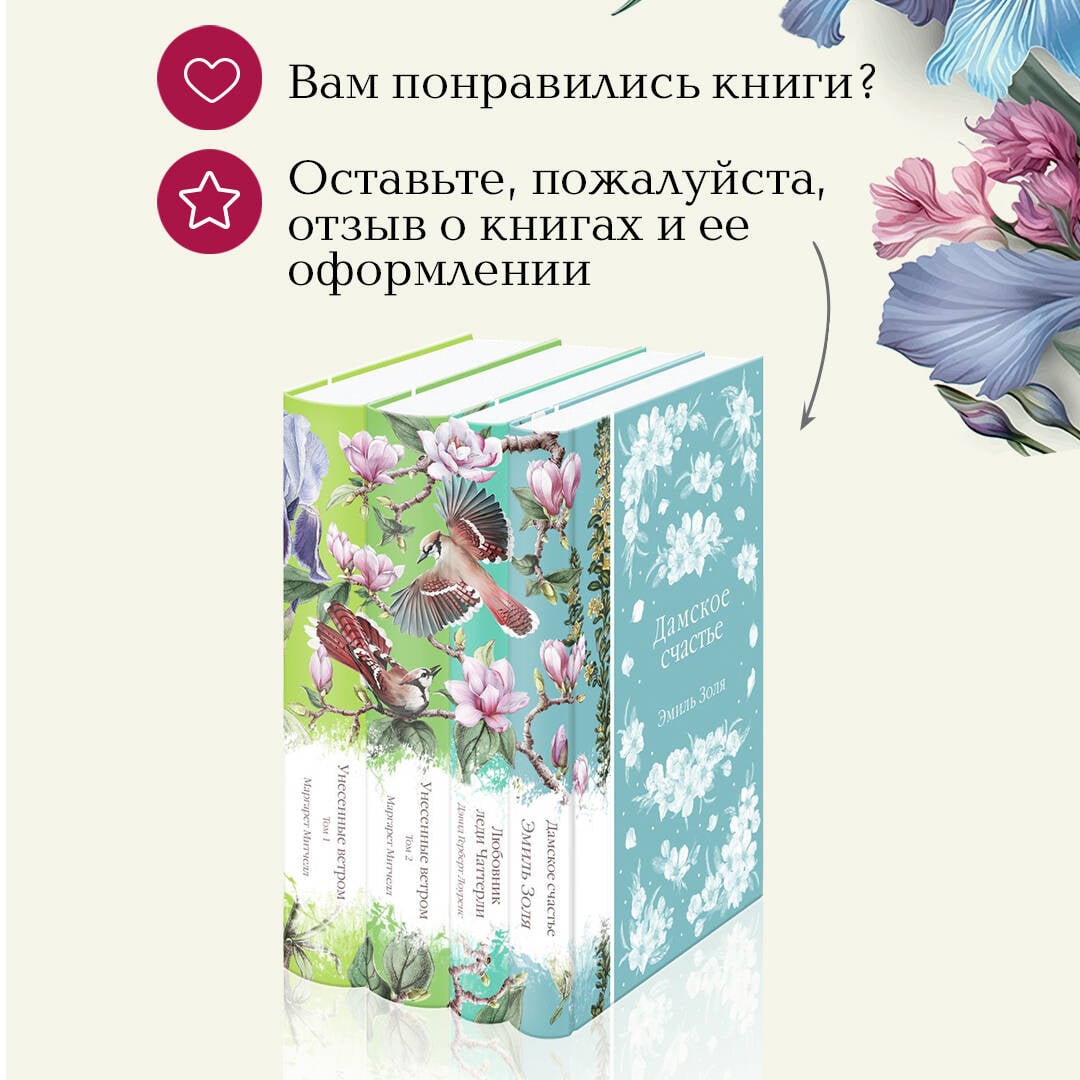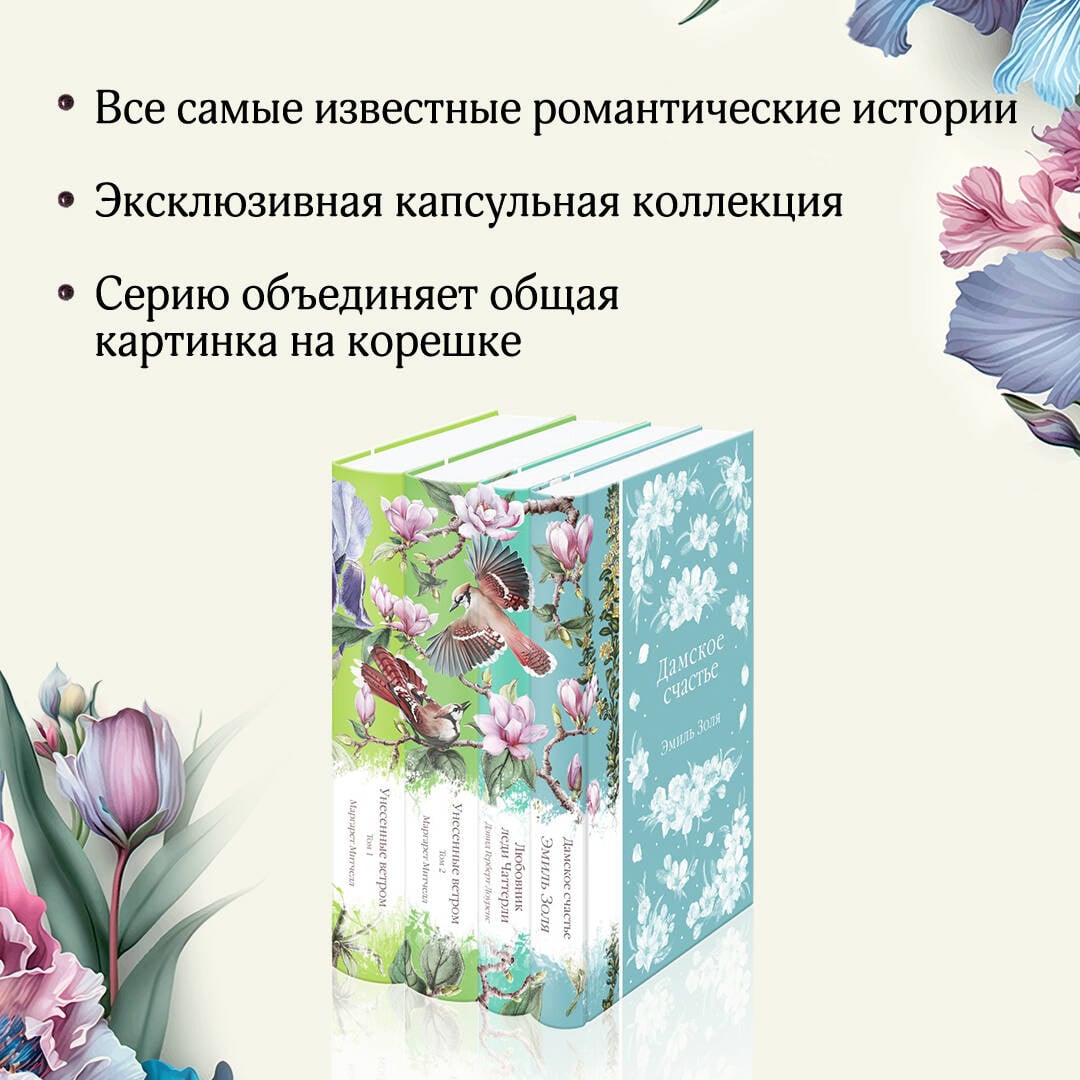 В комплект вошли «Унесенные ветром. Том 1» и «Унесенные ветром. Том 2», «Любовник леди Чаттерли», «Дамское счастье» - четыре классических женских романа, которые приятно читать и приятно дарить. Элегантная классика - утонченность, внимание к деталям, приятные цвета и тактильные материалы, безупречность стиля, внутри макет с иллюстрациями. Всю серию объединяет общая картинка на корешке, а в этом комплекте особая капсула в серии, на корешках добавляется анималистика - две птицы, летящие друг к другу.