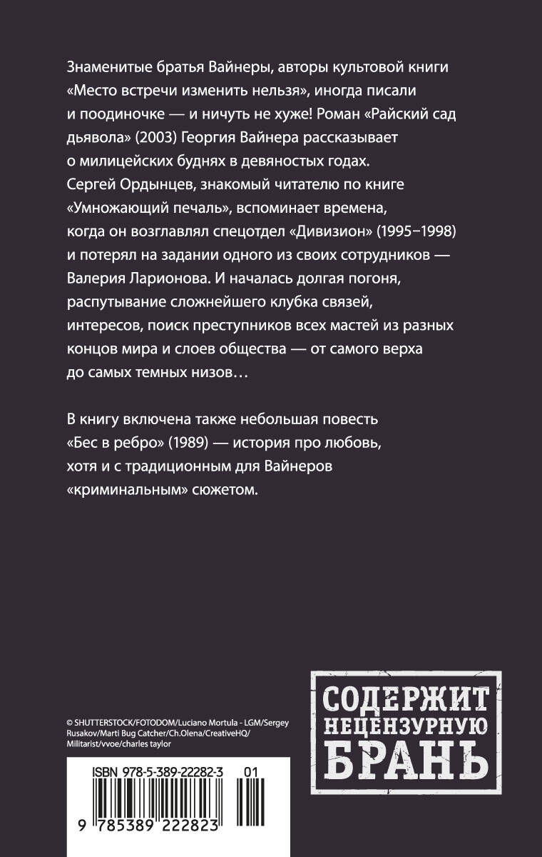 Знаменитые братья Вайнеры, авторы культовой книги "Место встречи изменить нельзя", иногда писали и поодиночке - и ничуть не хуже! Роман "Райский сад дьявола" (2003) Георгия Вайнера рассказывает о милицейских буднях в девяностых годах. Сергей Ордынцев, знакомый читателю по книге "Умножающий печаль", вспоминает времена, когда он возглавлял спецотдел "Дивизион" и потерял на задании одного из своих сотрудников - Валерия Ларионова. И началась долгая погоня, распутывание сложнейшего клубка связей, интересов, поиск преступников всех мастей из разных концов мира и слоев общества - от самого верха до самых темных низов… В книгу включена также небольшая повесть "Бес в ребро" (1989) - история про любовь, хотя и с традиционным для Вайнеров "криминальным" сюжетом.| Издательство | Азбука-Аттикус Издат.группа ООО |