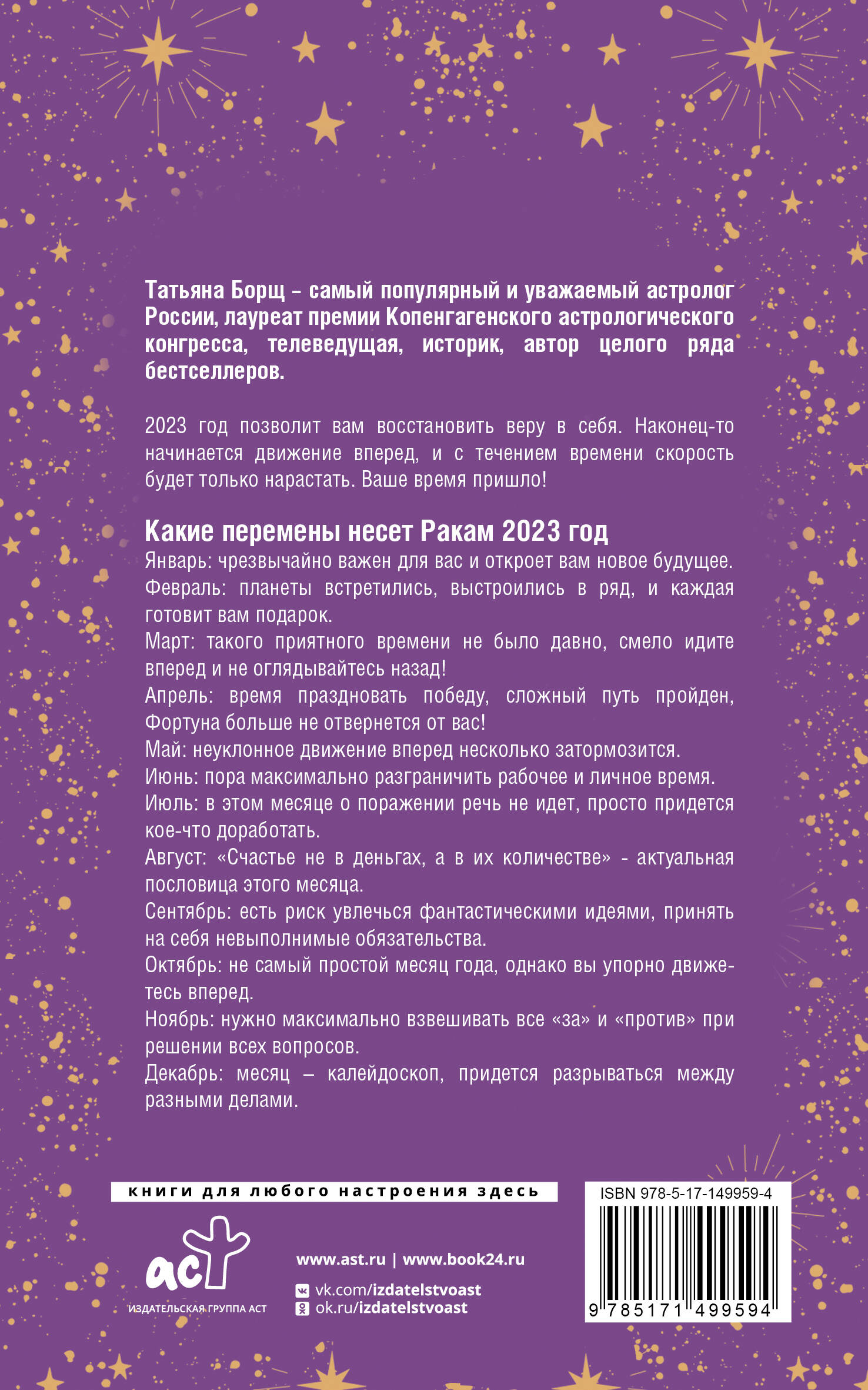 Гороскопы на 2023 год для каждого знака зодиака от одного из самых популярных и уважаемых астрологов России Татьяны Борщ. Календари серии расскажут, что ждет вас в сфере работы, личной жизни, семьи и творческой реализации в каждый из месяцев нового года. Вы сможете заведомо подготовиться к непростым периодам и получить четкие рекомендации, которые помогут навести порядок в жизни вопреки неудачному расположению планет.| Издательство | АСТ |