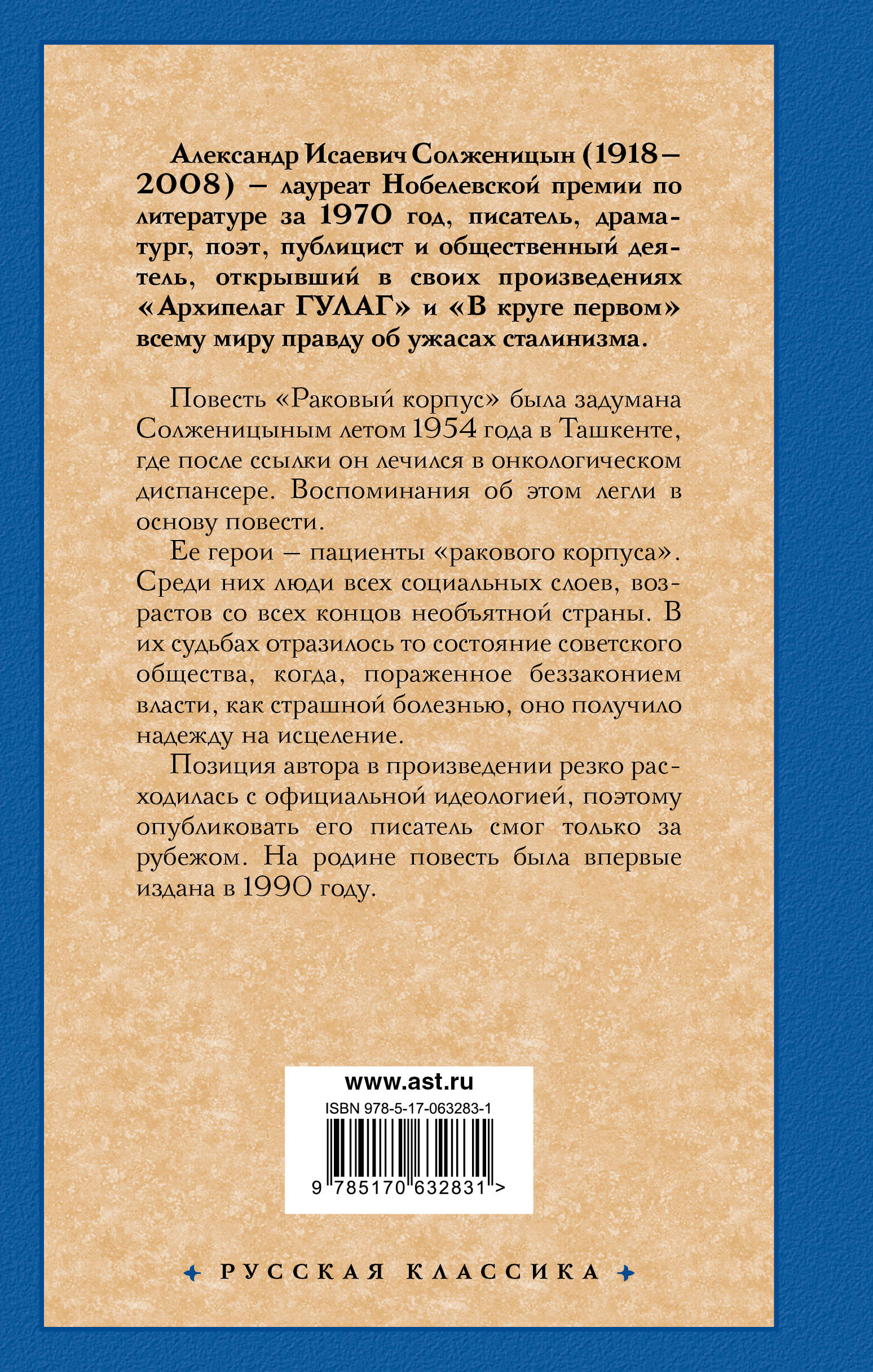 Повесть "Раковый корпус" была задумана Солженицыным летом 1954 года в Ташкенте, где после ссылки он лечился в онкологическом диспансере. Воспоминания об этом легли в основу повести. Ее герои - пациенты "ракового корпуса". Среди них люди всех социальных слоев, возрастов со всех концов необъятной страны. В их судьбах отразилось то состояние советского общества, когда, пораженное беззаконием власти, как страшной болезнью, оно получило надежду на исцеление. Позиция автора в произведении резко расходилась с официальной идеологией, поэтому опубликовать его писатель смог только за рубежом. На родине повесть была впервые издана в 1990 году.| Издательство | ИЗДАТЕЛЬСТВО "АСТ" |