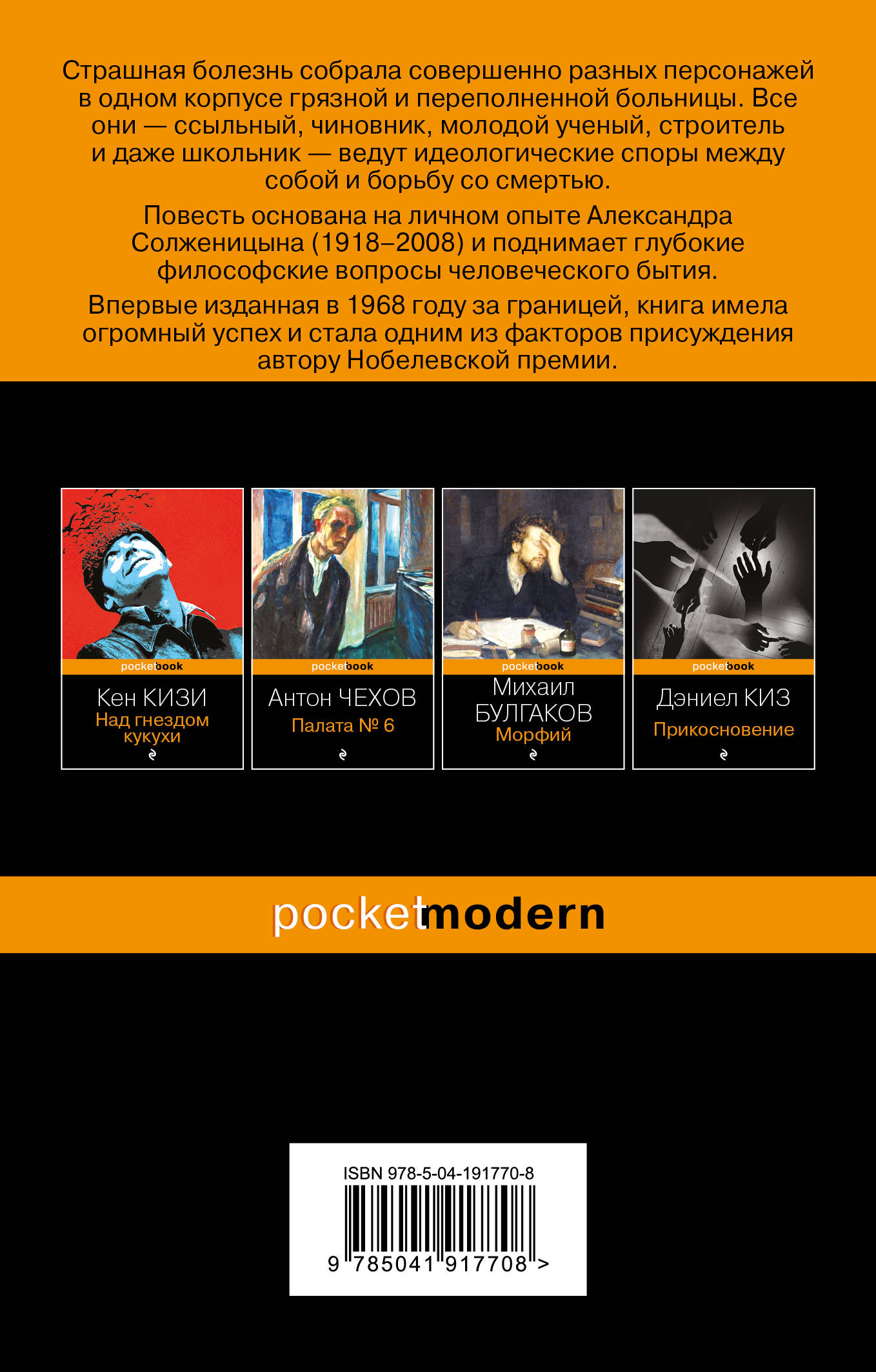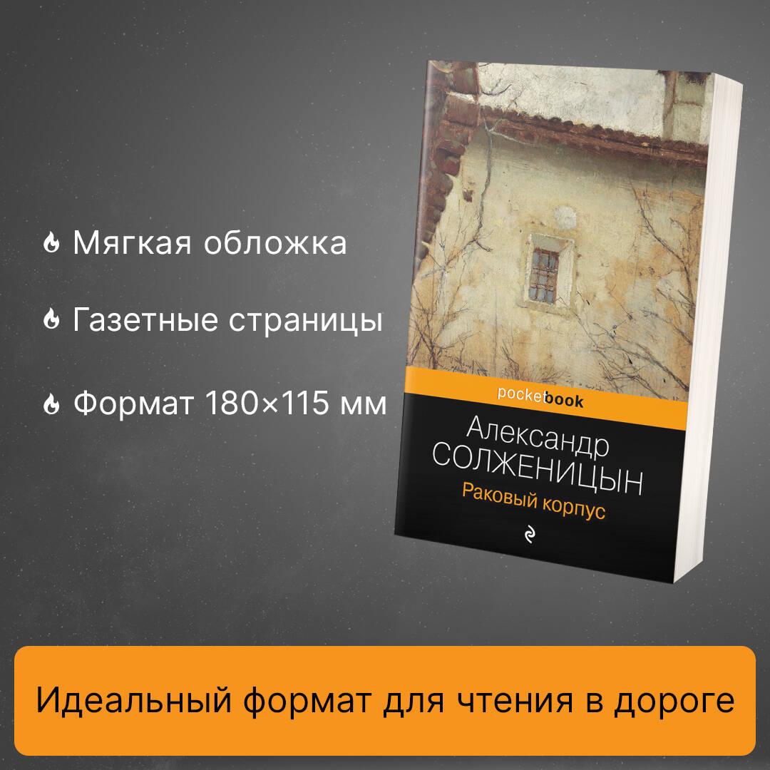 Страшная болезнь собрала совершенно разных персонажей в одном корпусе грязной и переполненной больницы. Все они - ссыльный, чиновник, молодой ученый, строитель и даже школьник, ведут идеологические споры между собой и борьбу со смертью. Повесть основана на личном опыте Александра Солженицына (1918-2008) и поднимает глубокие философские вопросы человеческого бытия. Впервые изданная в 1968 году за границей, книга имела огромный успех и стала одним из факторов присуждения автору Нобелевской премии.