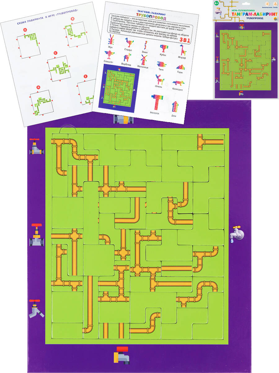 Рамка-вкладыш Танграм-лабиринт "Трубопровод" - увлекательная головоломка, которая понравится и детям, и взрослым! Обучающая головоломка состоит из 1 игрового поля-рамки и вкладышей различной формы. Танграм способствует развитию у детей наглядно-образного мышления, воображения, внимания, понимания цвета, величины и формы, восприятия, комбинаторных способностей. Количество деталей: 39 штук.| Издательство | РЫЖИЙ КОТ ООО |