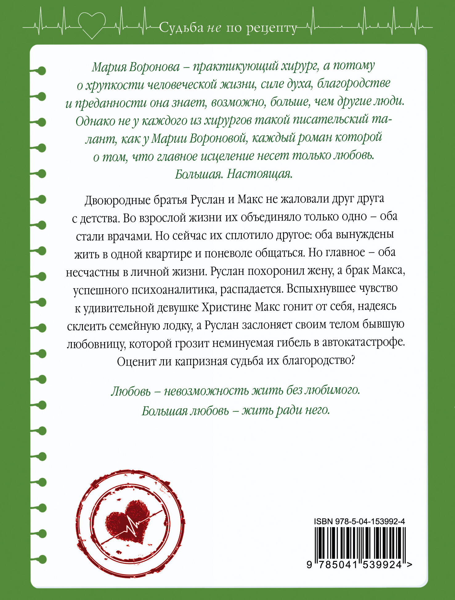 Романы Марии Вороновой переносят читателя в недалекое прошлое, такое сложное и такое родное. Неприкаянные одинокие души ищут любовь и находят ее, несмотря на то что за это великое чувство им приходится бороться. Двоюродные братья Руслан и Макс не жаловали друг друга с детства. Во взрослой жизни их объединяло только одно - оба стали врачами. Но сейчас их сплотило другое: оба вынуждены жить в одной квартире и поневоле общаться. Но главное - оба несчастны в личной жизни. Руслан похоронил жену, а брак Макса, успешного психоаналитика, распадается. Вспыхнувшее чувство к удивительной девушке Христине Макс гонит от себя, надеясь склеить семейную лодку, а Руслан заслоняет своим телом бывшую любовницу, которой грозит неминуемая гибель в автокатастрофе. Оценит ли капризная судьба их благородство?| Издательство | ООО "Издательство "Эксмо" |