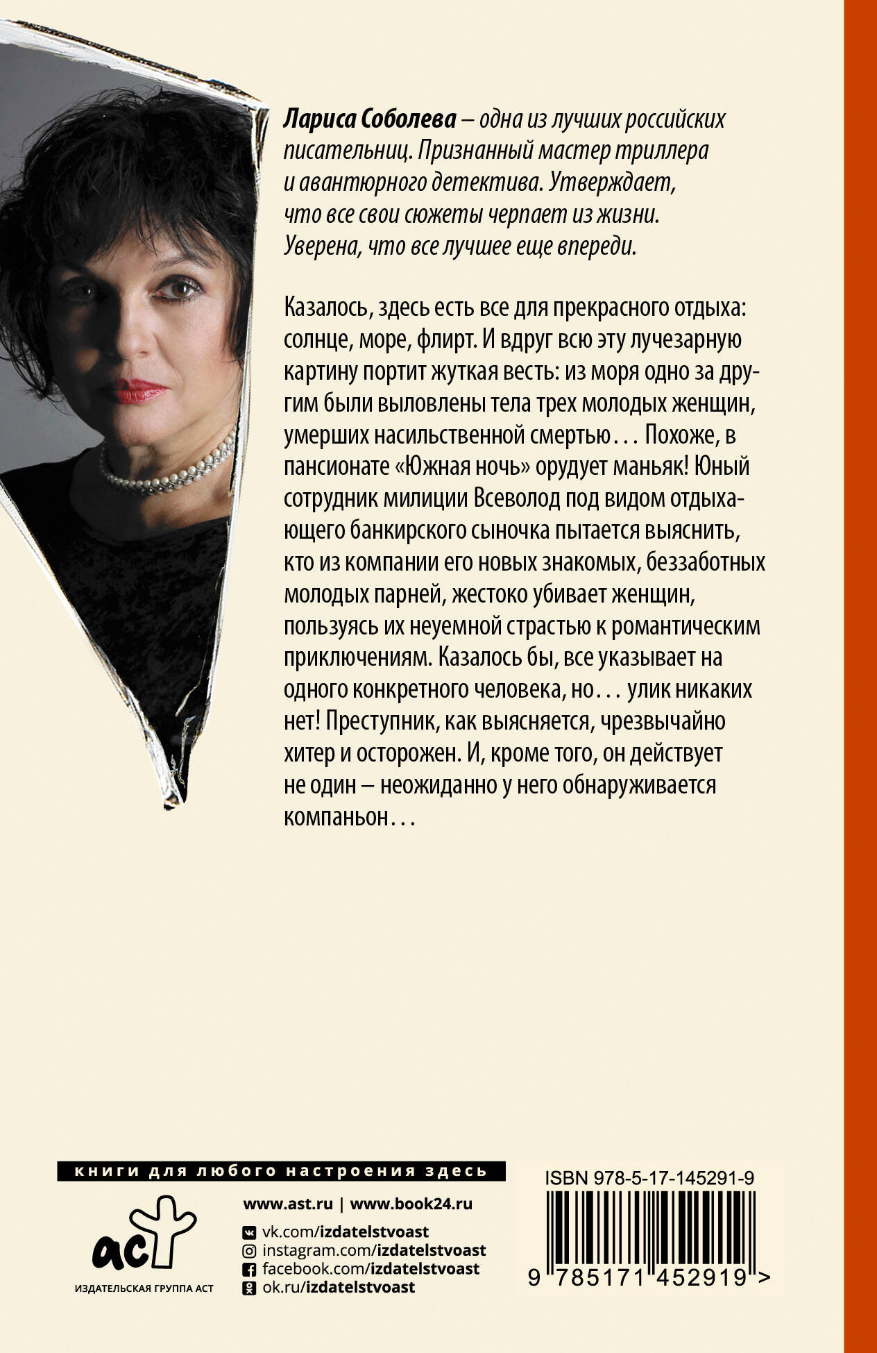 Казалось, здесь есть все для прекрасного отдыха: солнце, море, флирт. И вдруг всю эту лучезарную картину портит жуткая весть: из моря одно за другим были выловлены тела тpex молодых женщин, умерших насильственной смертью… Похоже, в пансионате "Южная ночь" орудует маньяк! Юный сотрудник милиции Всеволод под видом отдыхающего банкирского сыночка пытается выяснить, кто из компании его новых знакомых, беззаботных молодых парней, жестоко убивает женщин, пользуясь их неуемной страстью к романтическим приключениям. Казалось бы, все указывает на одного конкретного человека, но… улик никаких нет! Преступник, как выясняется, чрезвычайно хитер и осторожен. И, кроме того, он действует не один - неожиданно у него обнаруживается компаньон…| Издательство | ИЗДАТЕЛЬСТВО "АСТ" |
