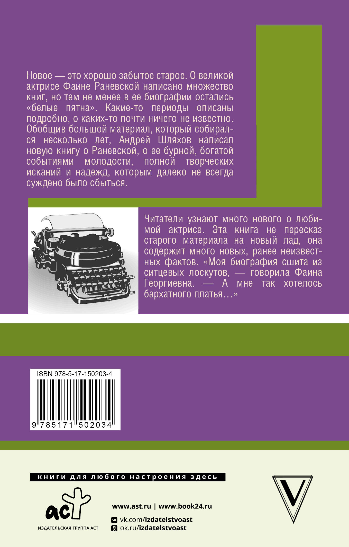 Андрей Шляхов - прекрасный писатель в жанре юмористической прозы, биографии и мемуаров. Значимое место в собрании сочинений писателя занимают биографические исследования многогранных и противоречивых исторических фигур, и выдающихся личностей. Книга "Раневская. Я - выкидыш Станиславского" не пересказ старого материала на новый лад, она содержит много новых, ранее неизвестных фактов о Фаине Георгиевне. Обобщив большой материал, который собирался несколько лет, Андрей Шляхов написал книгу о Раневской, о ее бурной, богатой событиями жизни, полной творческих исканий и надежд, которым далеко не всегда суждено было сбыться. Фишки книги: • самые знаменитые, колкие, остроумные и язвительные афоризмы Фаины Раневской • уникальный материал и новые факты о биографии великой актрисы. Для кого книга: • Для тех, кто любит актрису и ее высказывания • Для тех, кто хочет узнать о закулисье театров и кино.| Издательство | АСТ |