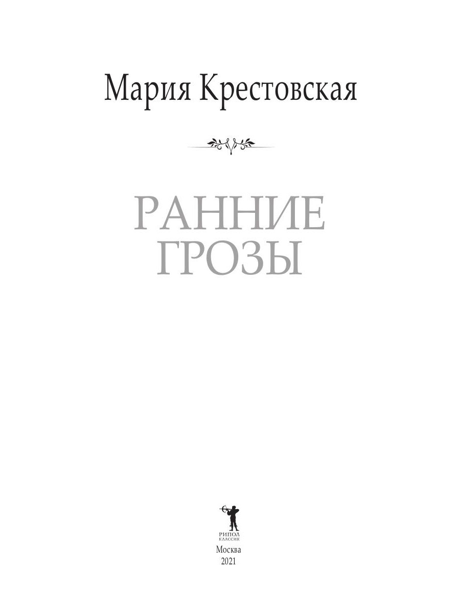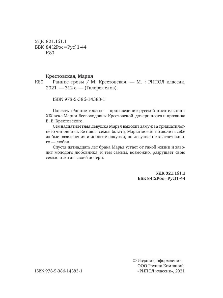 Повесть «Ранние грозы» - произведение русской писательницы XIX века Марии Всеволодовны Крестовской, дочери поэта и прозаика В. В. Крестовского. Семнадцатилетняя девушка Марья выходит замуж за тридцатилетнего чиновника. Ее новая семья богата, Марья может позволить себе любые развлечения и дорогие покупки, но девушке не хватает одного - любви. Спустя пятнадцать лет брака Марья устает от такой жизни и заводит молодого любовника, и тем самым, возможно, разрушает свою семью и жизнь своей дочери.