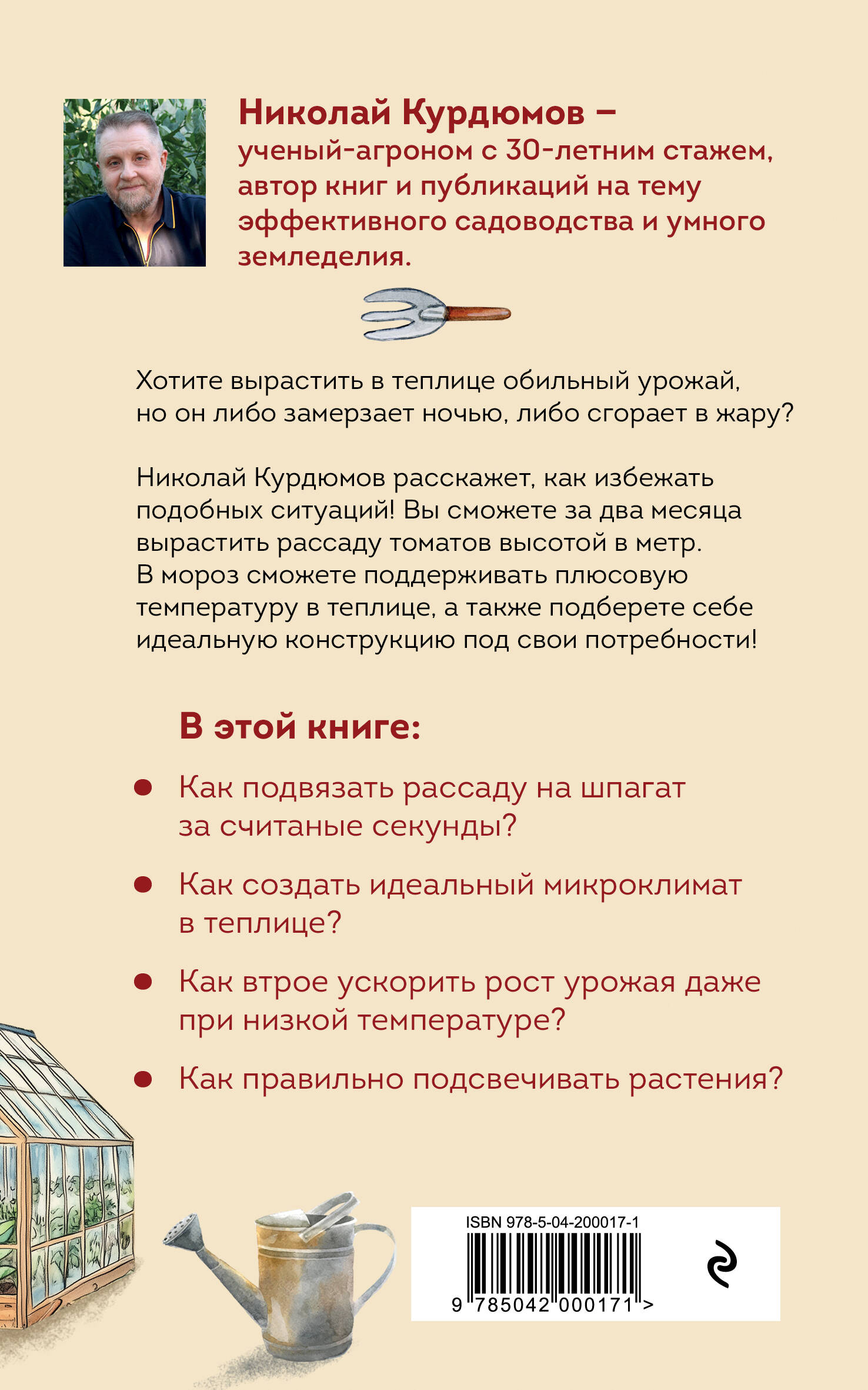 Мечтаете о богатом раннем урожае, но растения в теплице то «сгорают» в жару, то замерзают ночами? Николай Курдюмов расскажет, как избежать подобных ситуаций! Его опыт ученого-агронома с 30-летним стажем поможет вам разобраться, какие условия и как необходимо организовать в теплице, чтобы она давала гарантированный урожай. Вы сможете за два месяца вырастить рассаду томатов высотой в метр, поддерживать плюсовую температуру в теплице, а также подберете себе идеальную конструкцию под свои потребности! Из книги вы узнаете: - Как подвязать рассаду на шпагат за считаные секунды? - Как создать идеальный микроклимат в теплице? - Как втрое ускорить рост урожая даже при низкой температуре? - Как правильно подсвечивать растения?| Издательство | ООО "Издательство "Эксмо" |