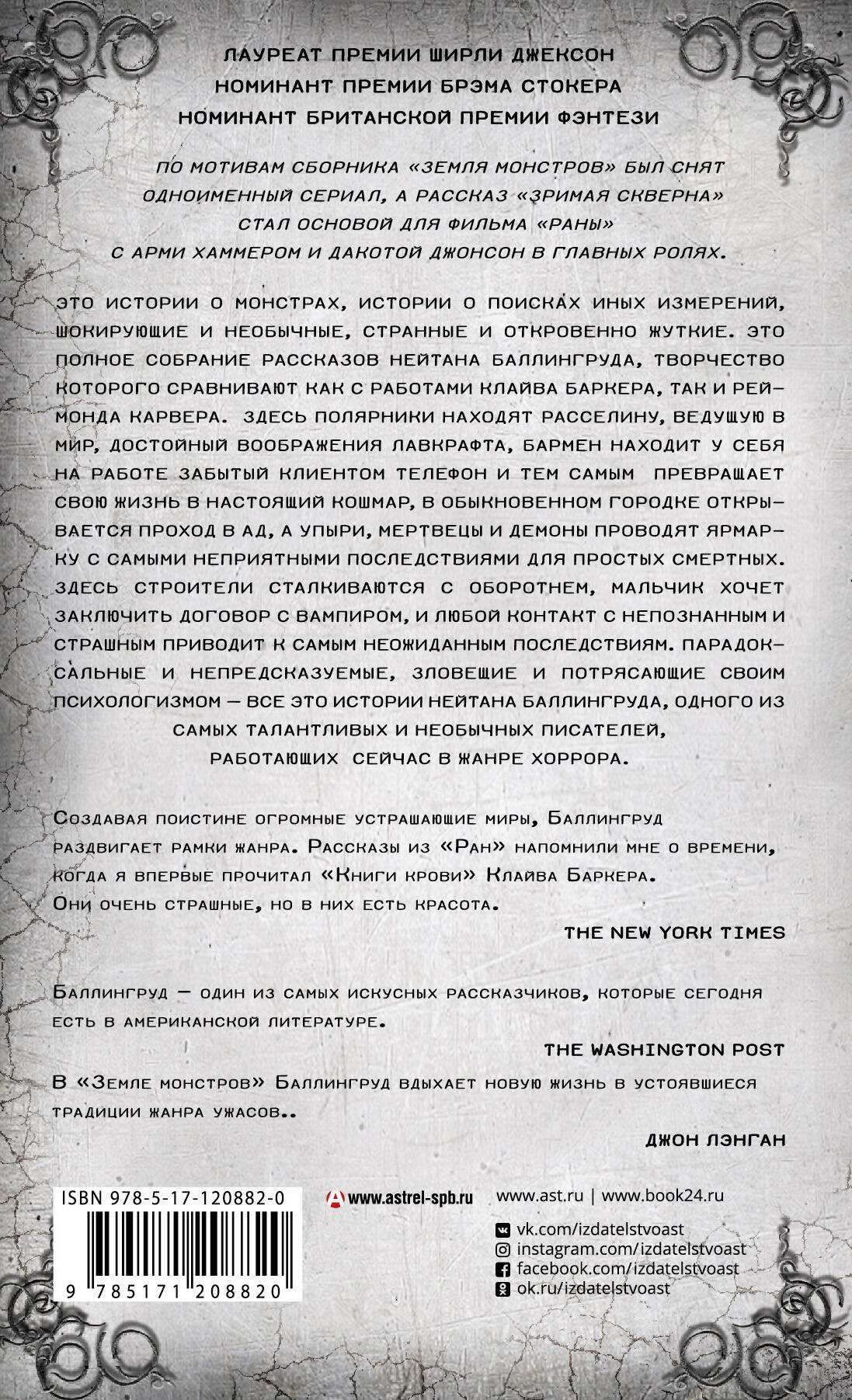Это истории о монстрах, истории о поисках иных измерений, шокирующие и необычные, странные и откровенно жуткие. Это полное собрание рассказов Нейтана Баллингруда, творчество которого сравнивают как с работами Клайва Баркера, так и Реймонда Карвера. Здесь полярники находят расселину, ведущую в мир, достойный воображения Лавкрафта, бармен находит у себя на работе забытый клиентом телефон и тем самым превращает свою жизнь в настоящий кошмар, в обыкновенном городке открывается проход в ад, а вампиры, мертвецы и демоны проводят ярмарку с самыми неприятными последствиями для простых смертных. Здесь строители сталкиваются с оборотнем, мальчик хочет заключить договор с вампиром, и любой контакт с непознанным и страшным приводит к самым неожиданным последствиям. Парадоксальные и непредсказуемые, зловещие и потрясающие своим психологизмом - все это истории Нейтана Баллингруда, одного из самых талантливых и необычных писателей, работающих сейчас в жанре хоррора.